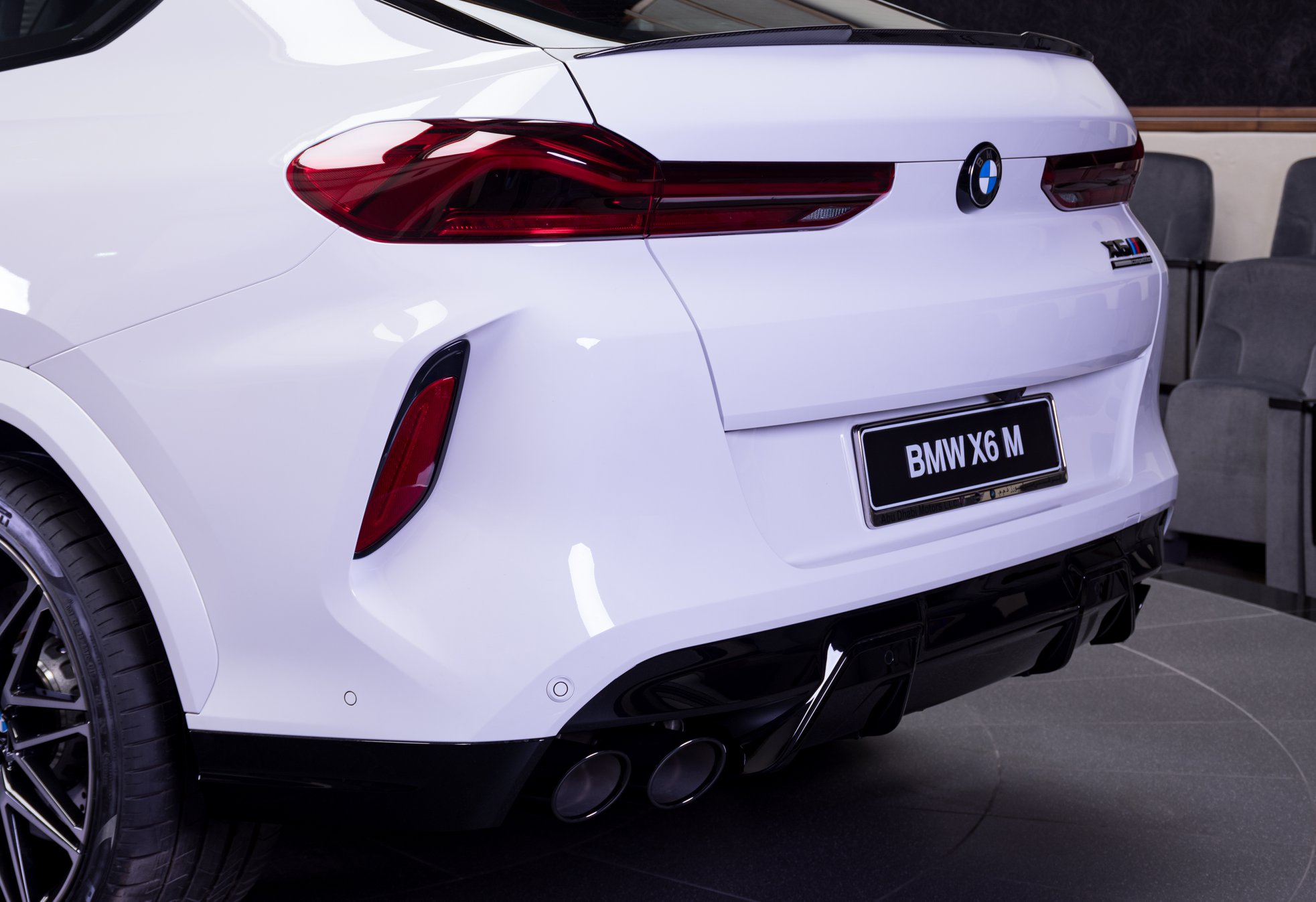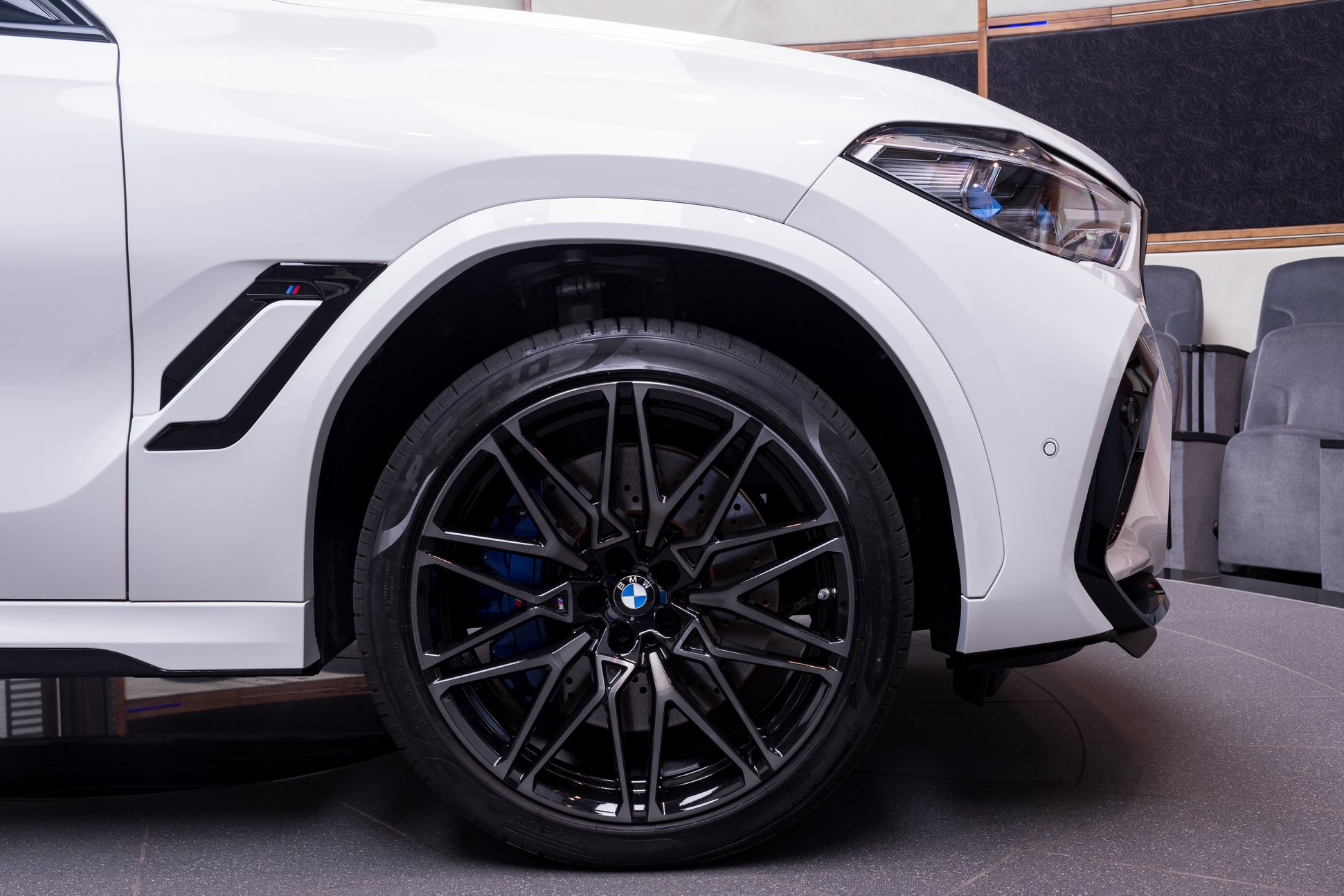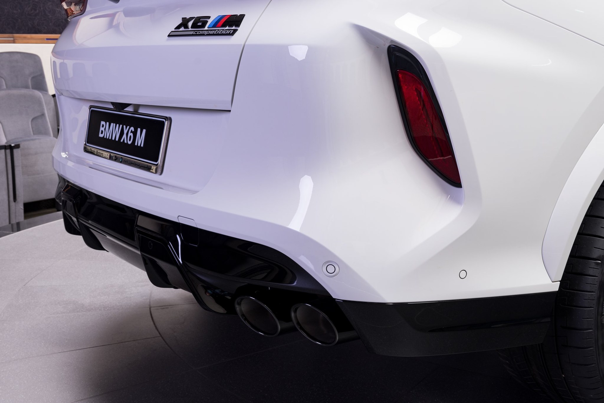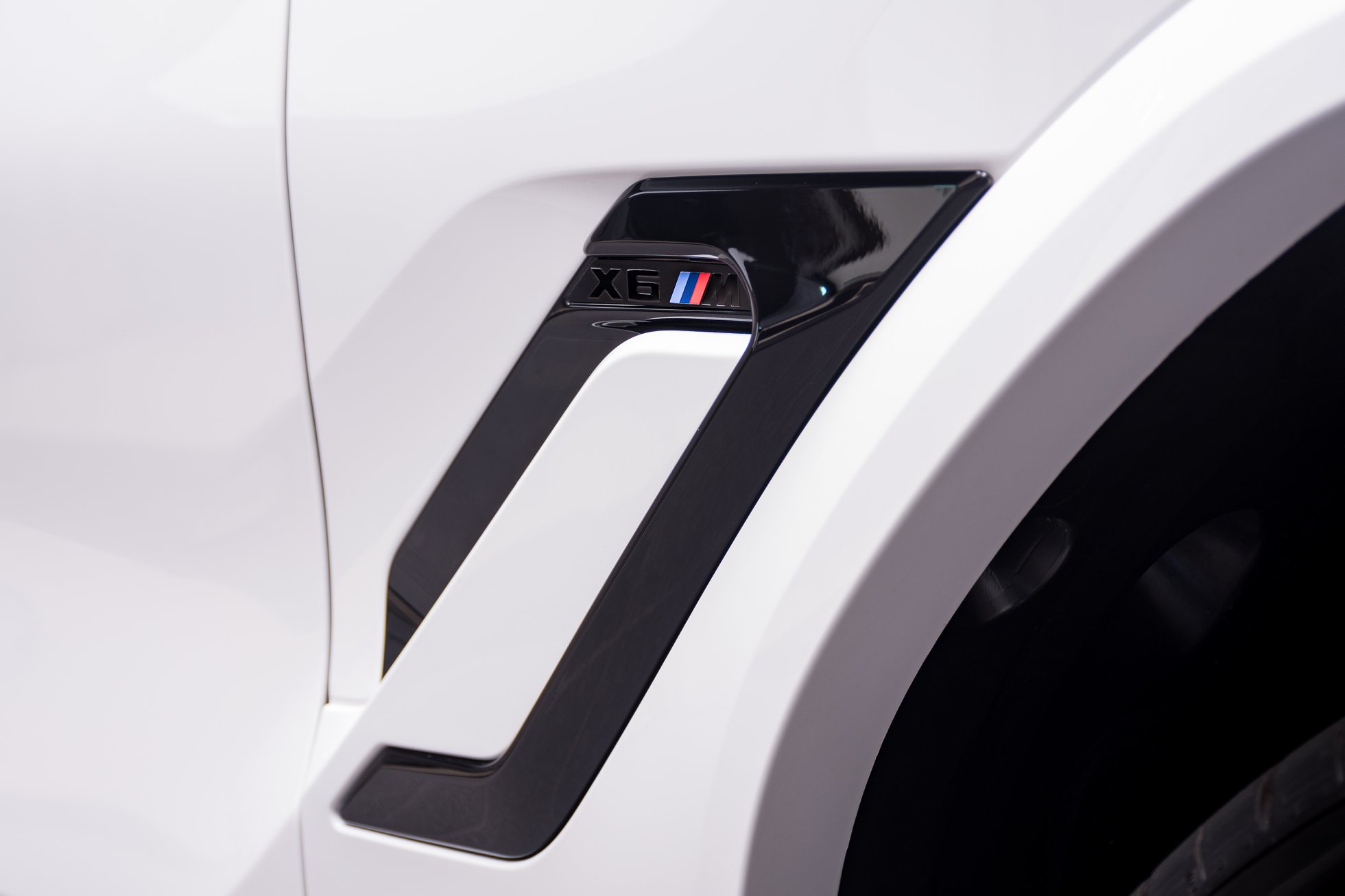 Auch wenn das Interieur aus farbiger Sicht der unumstrittene Blickfang ist, verdient auch das Exterieur einen genaueren Blick. Die Lackierung in Alpinweiß steht dabei im scharfen Kontrast zu den schwarzen Akzenten des BMW X6 M Competition, auch die Schmiedefelgen im Design Sternspeiche 818 M Bicolor glänzen mit schwarzen Details. Wie bei allen X5 M und X6 M sind auch beim gezeigten Fahrzeug unterschiedlich große Felgen verbaut: An der Vorderachse kommen 21-Zöller mit 295 Millimeter breiter Bereifung zum Einsatz, an der Hinterachse sind die 315-Millimeter-Reifen sogar auf 22-Zöllern montiert. Abgerundet wird das kontrastreiche Spiel von hellen und dunklen Farben durch Hightech-Akzente wie die Außenspiegelkappen und die Heckspoiler-Lippe aus Carbon.