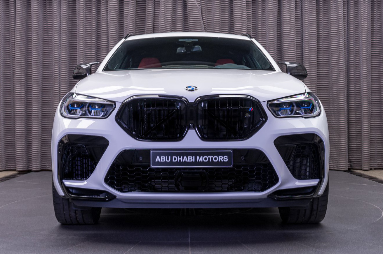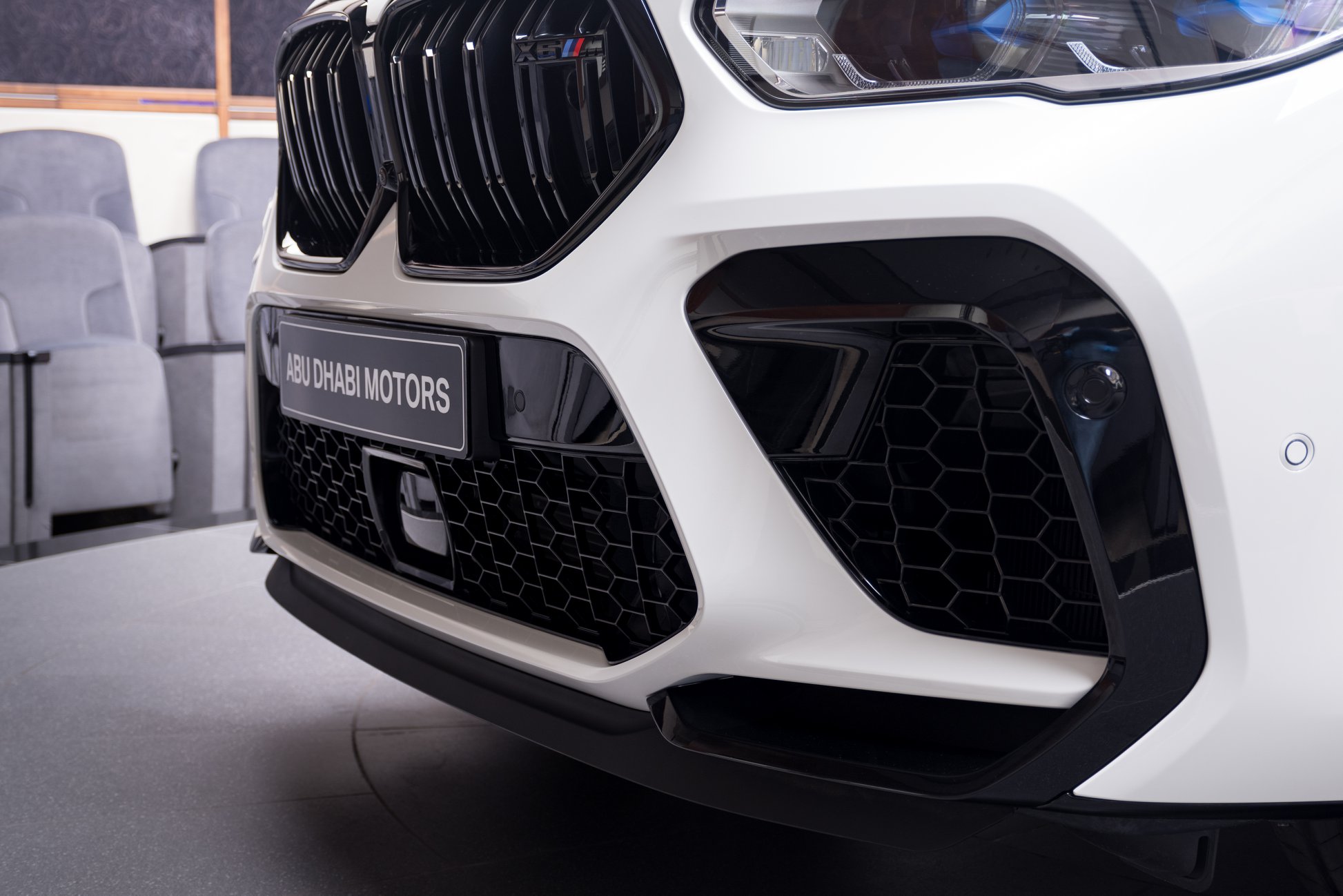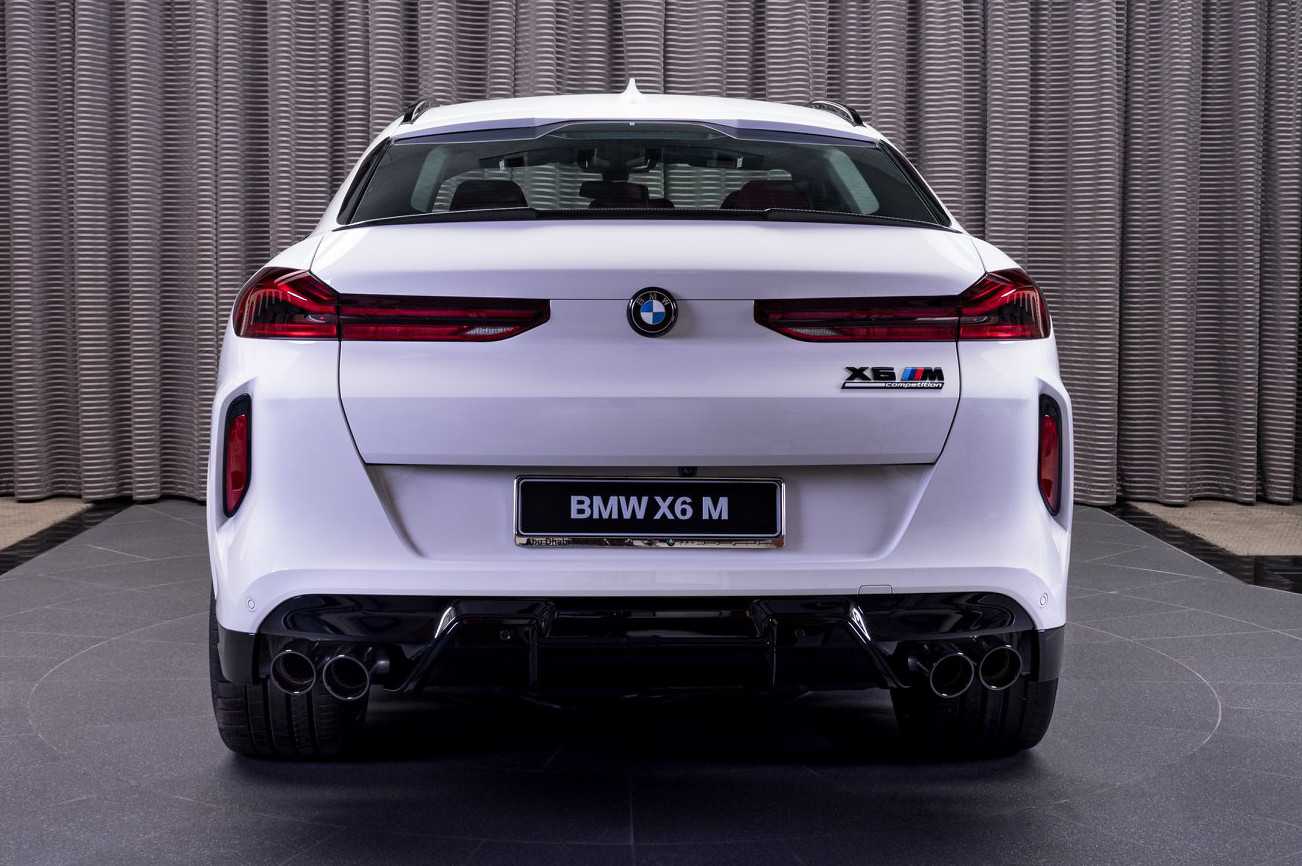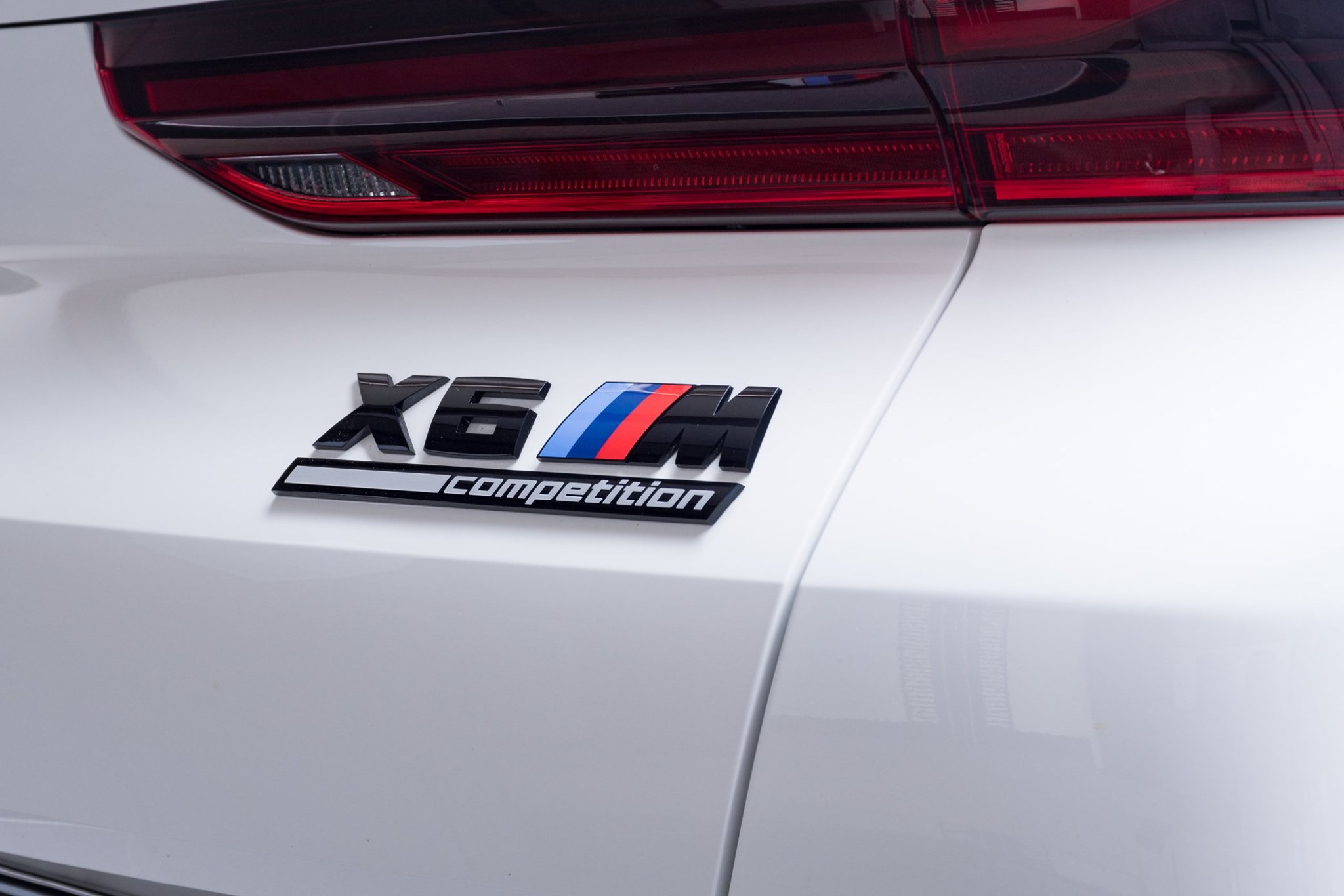 Auch wenn das Interieur aus farbiger Sicht der unumstrittene Blickfang ist, verdient auch das Exterieur einen genaueren Blick. Die Lackierung in Alpinweiß steht dabei im scharfen Kontrast zu den schwarzen Akzenten des BMW X6 M Competition, auch die Schmiedefelgen im Design Sternspeiche 818 M Bicolor glänzen mit schwarzen Details. Wie bei allen X5 M und X6 M sind auch beim gezeigten Fahrzeug unterschiedlich große Felgen verbaut: An der Vorderachse kommen 21-Zöller mit 295 Millimeter breiter Bereifung zum Einsatz, an der Hinterachse sind die 315-Millimeter-Reifen sogar auf 22-Zöllern montiert. Abgerundet wird das kontrastreiche Spiel von hellen und dunklen Farben durch Hightech-Akzente wie die Außenspiegelkappen und die Heckspoiler-Lippe aus Carbon.