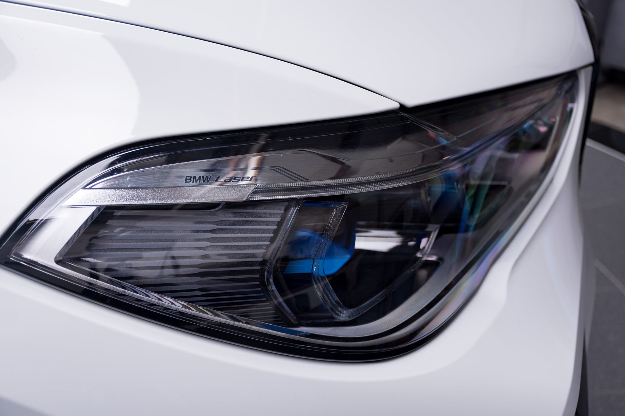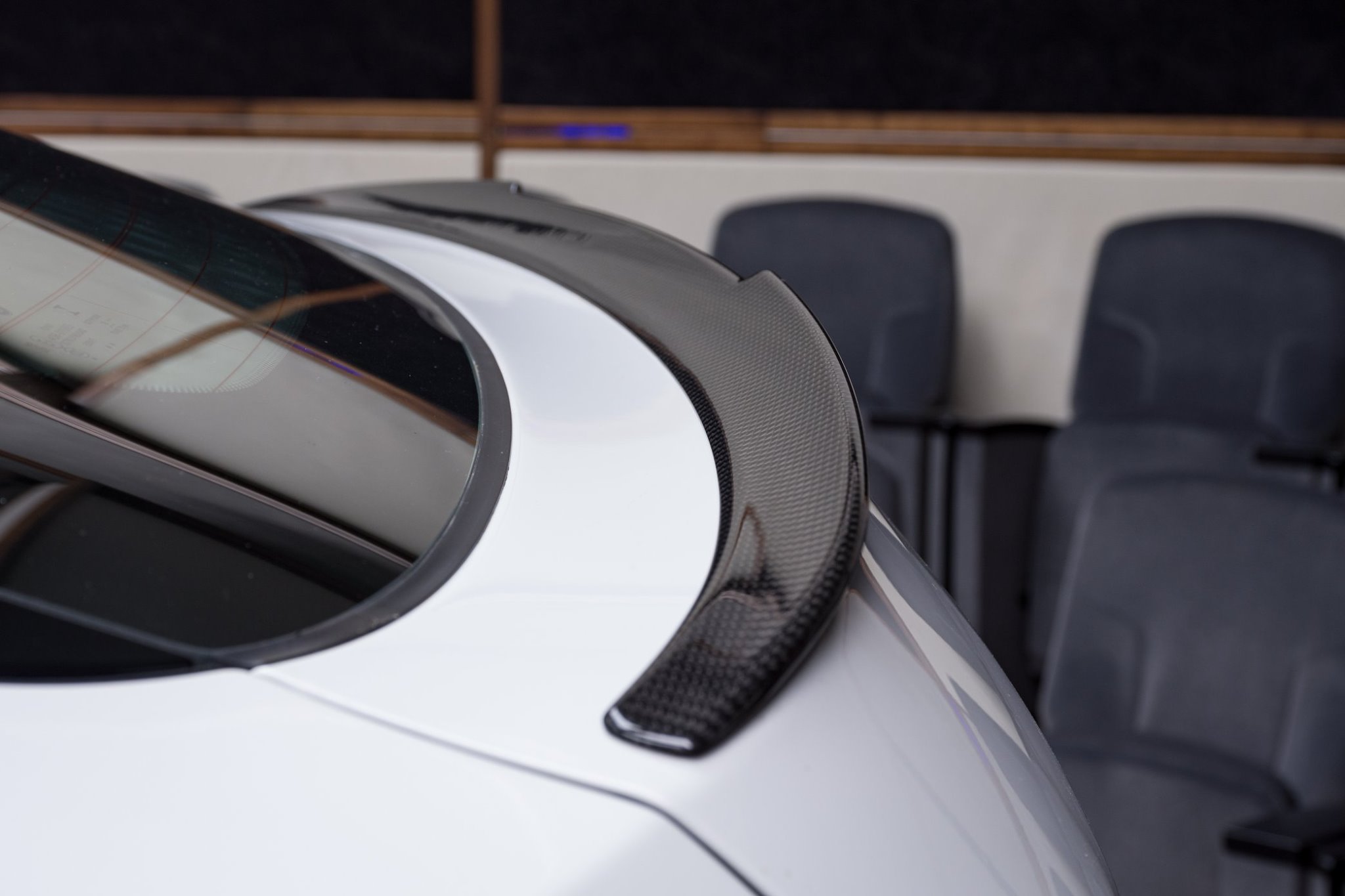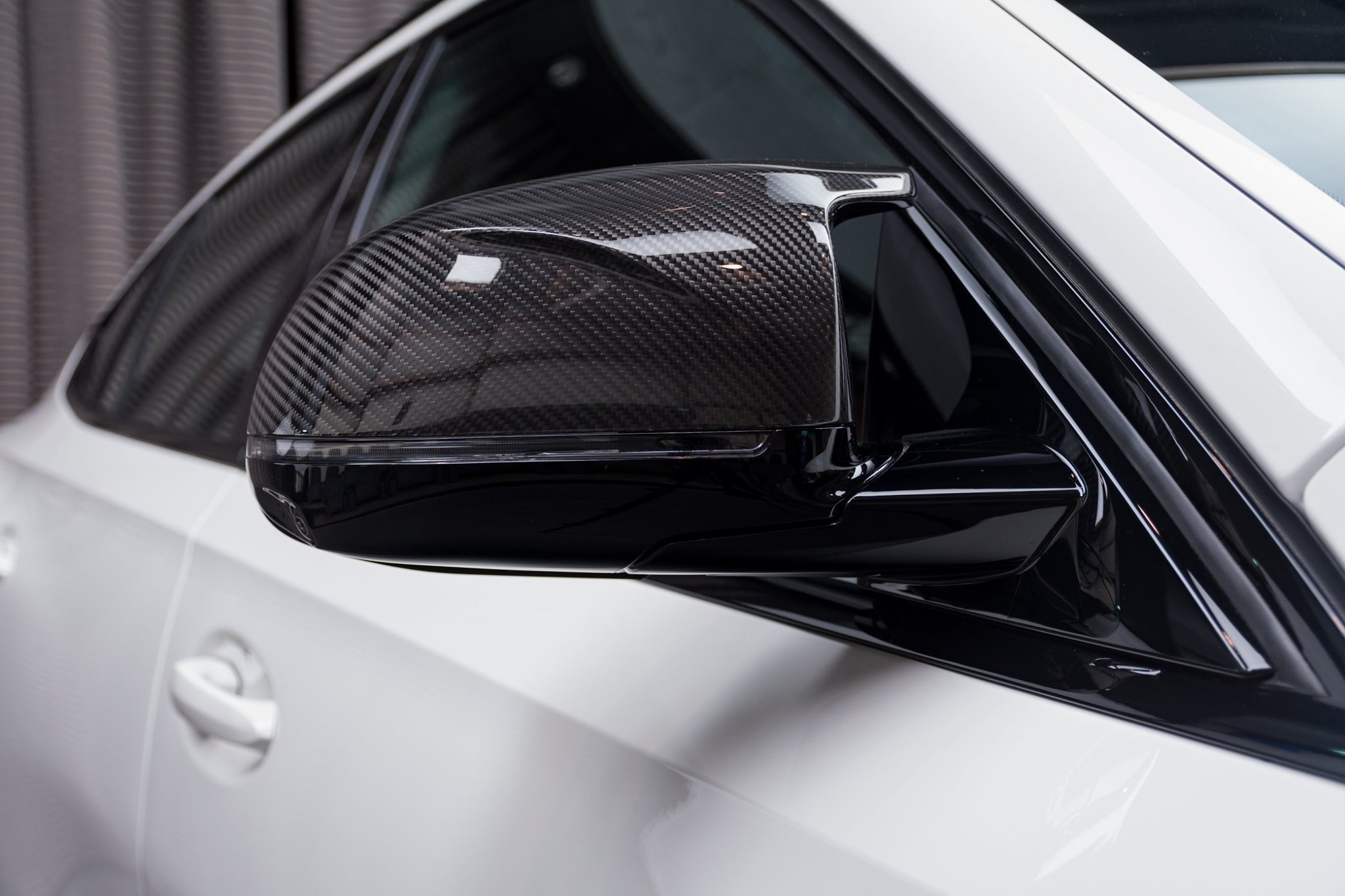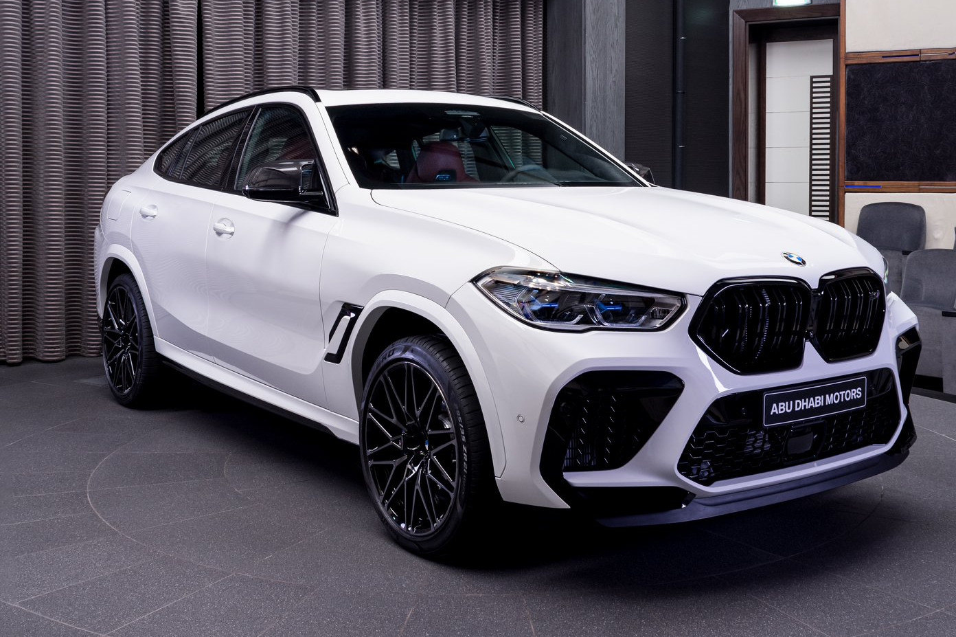 Auch wenn das Interieur aus farbiger Sicht der unumstrittene Blickfang ist, verdient auch das Exterieur einen genaueren Blick. Die Lackierung in Alpinweiß steht dabei im scharfen Kontrast zu den schwarzen Akzenten des BMW X6 M Competition, auch die Schmiedefelgen im Design Sternspeiche 818 M Bicolor glänzen mit schwarzen Details. Wie bei allen X5 M und X6 M sind auch beim gezeigten Fahrzeug unterschiedlich große Felgen verbaut: An der Vorderachse kommen 21-Zöller mit 295 Millimeter breiter Bereifung zum Einsatz, an der Hinterachse sind die 315-Millimeter-Reifen sogar auf 22-Zöllern montiert. Abgerundet wird das kontrastreiche Spiel von hellen und dunklen Farben durch Hightech-Akzente wie die Außenspiegelkappen und die Heckspoiler-Lippe aus Carbon.