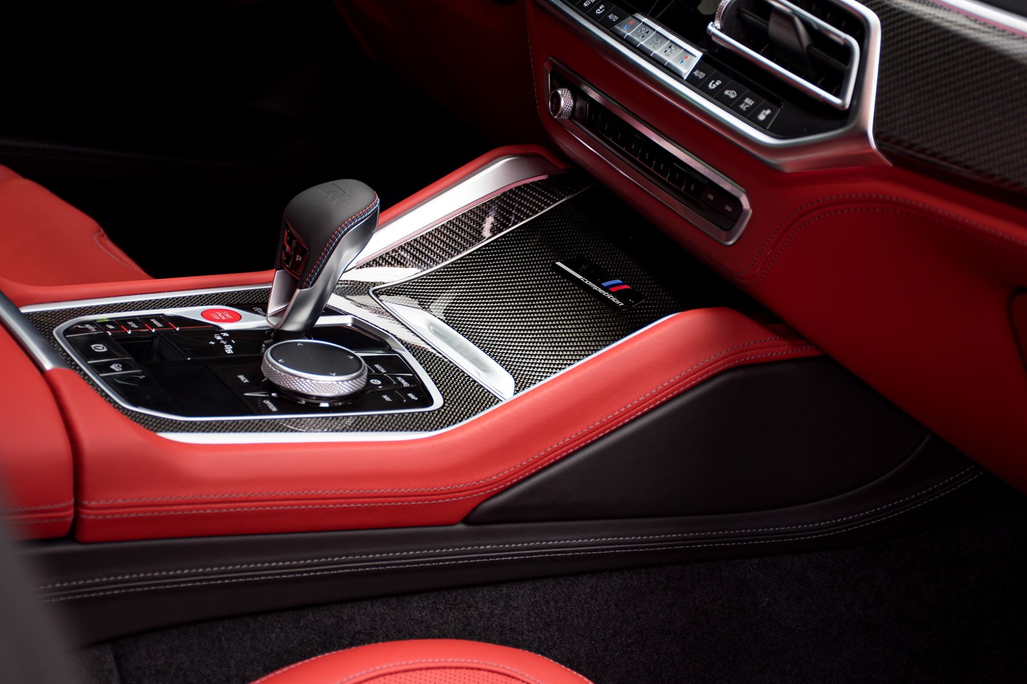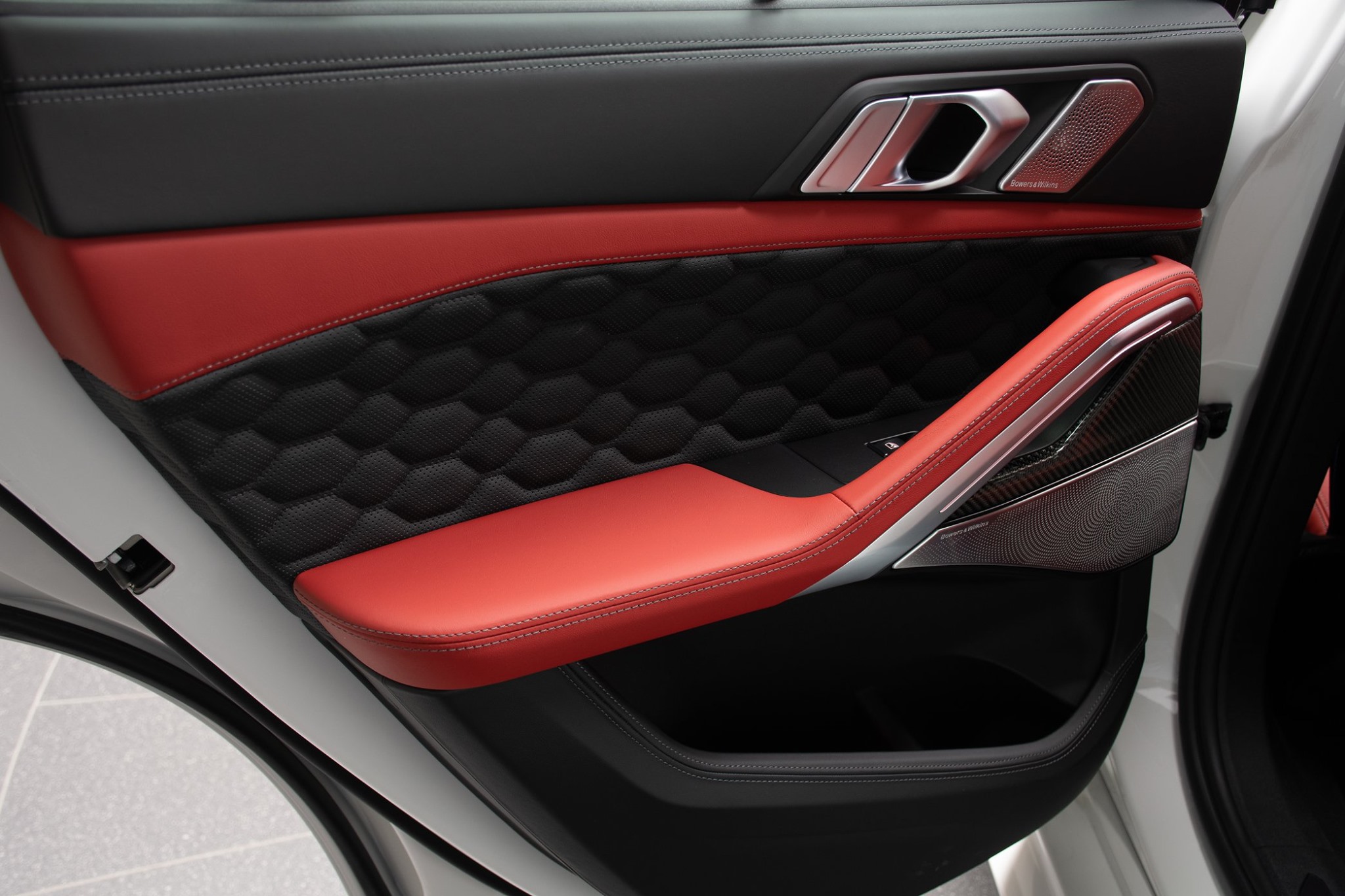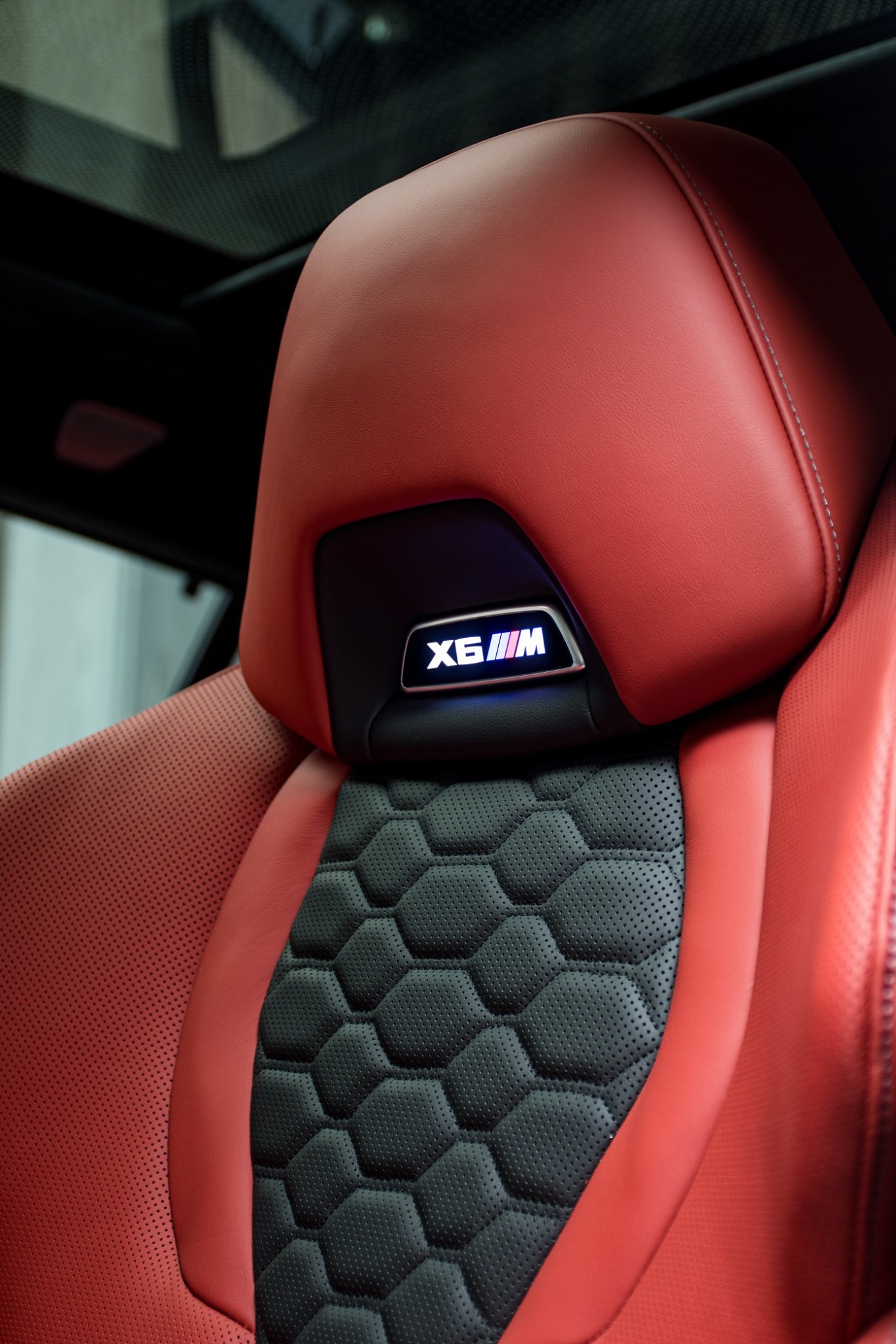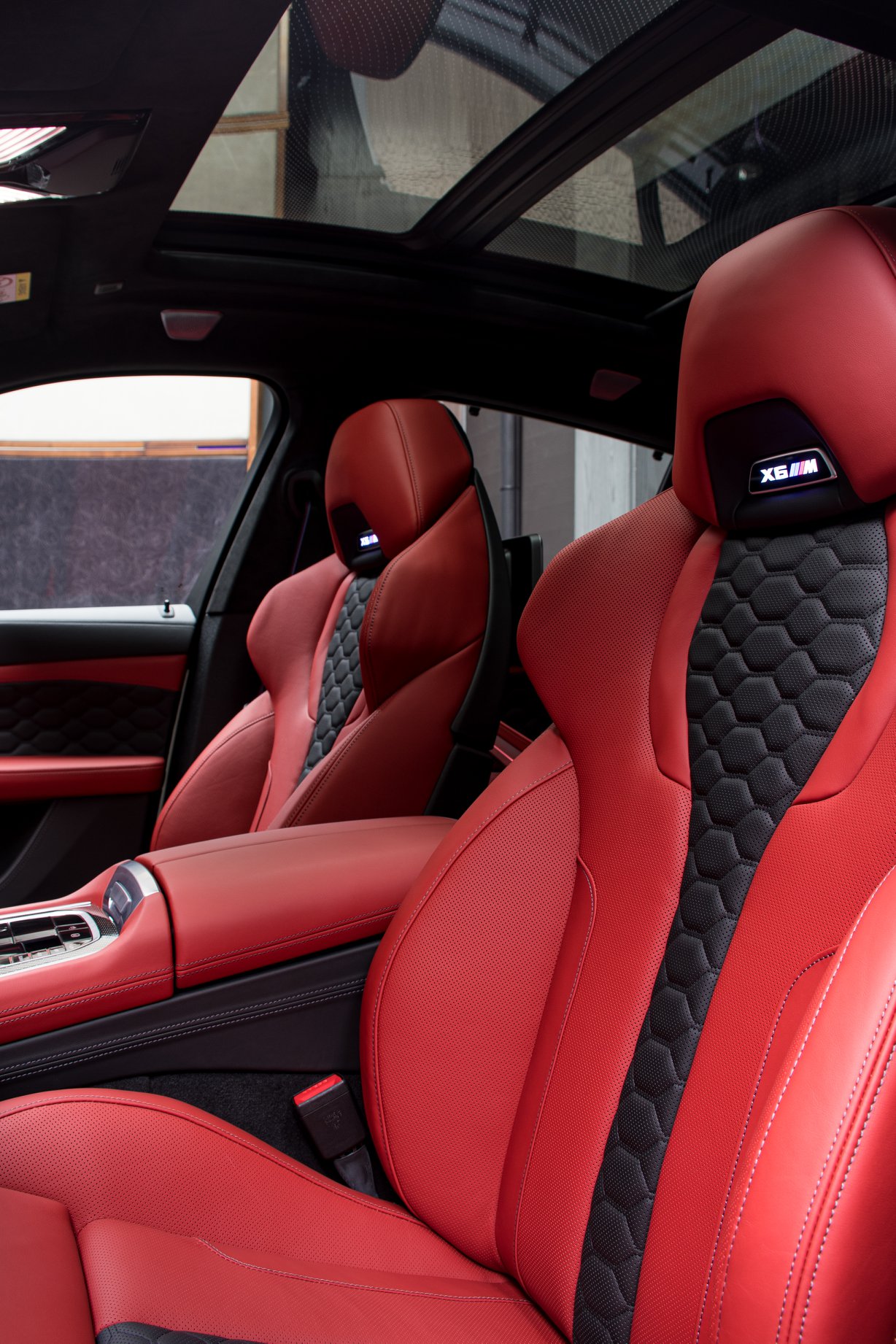 Die meisten Highlights werden weithin sichtbar präsentiert, aber im Fall dieses BMW X6 M Competition F96 mit Interieur in Sakhir Orange sieht die Sache anders aus: Obwohl auch das Exterieur viel zu bieten hat, zeigt sich das optische Highlight des Power-SUV-Coupés erst beim Blick in den Innenraum. Dort trägt der X6 M die Vollleder-Ausstattung Merino Feinnarbe in Sakhir Orange und Schwarz sowie die Interieurleisten Carbon Fibre. Passend zur rot-orangen Lederausstattung sind die roten M1- und M2-Knöpfe am Lenkrad sowie der Start-Stopp-Knopf auf der Mittelkonsole lackiert.