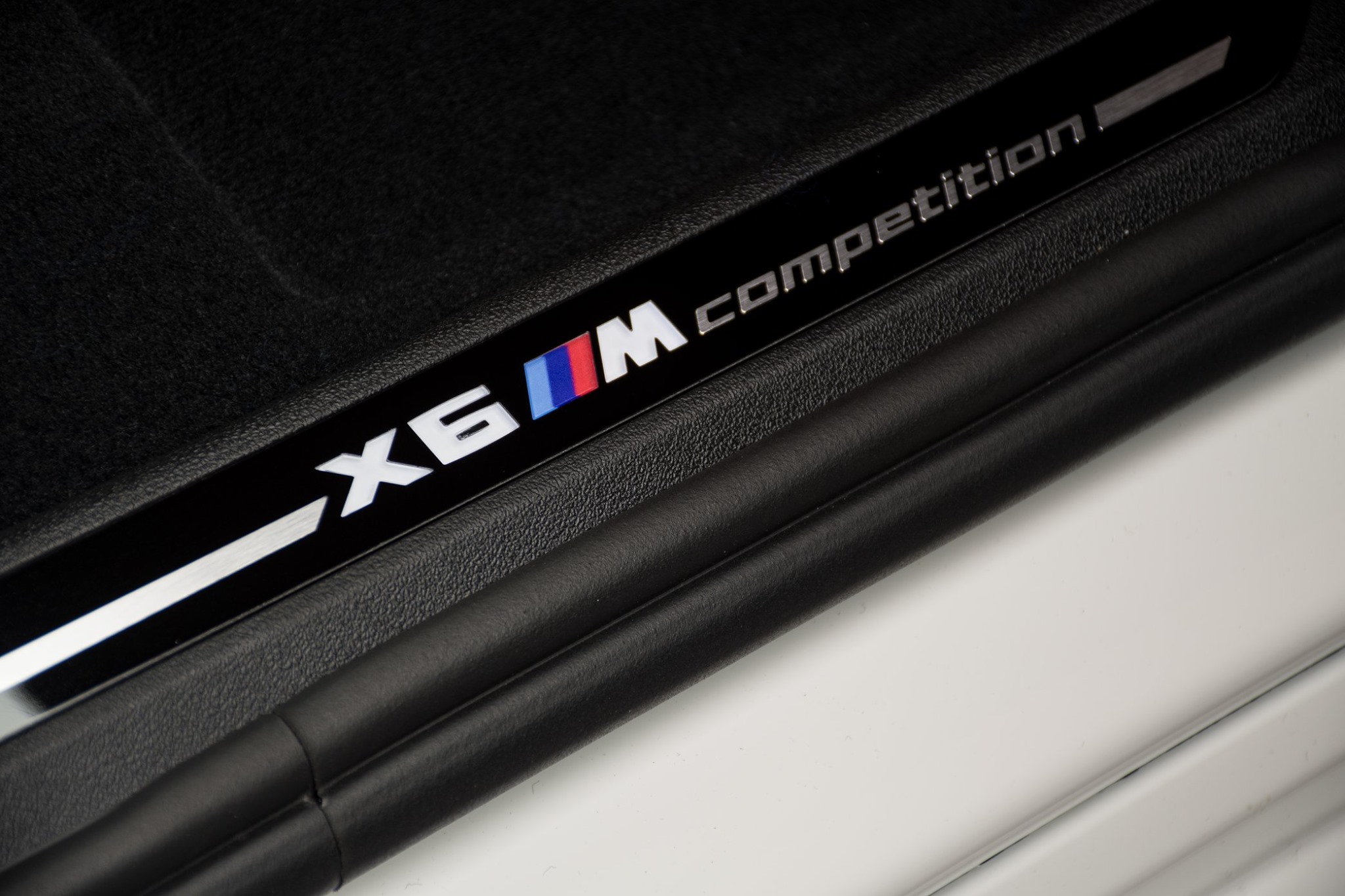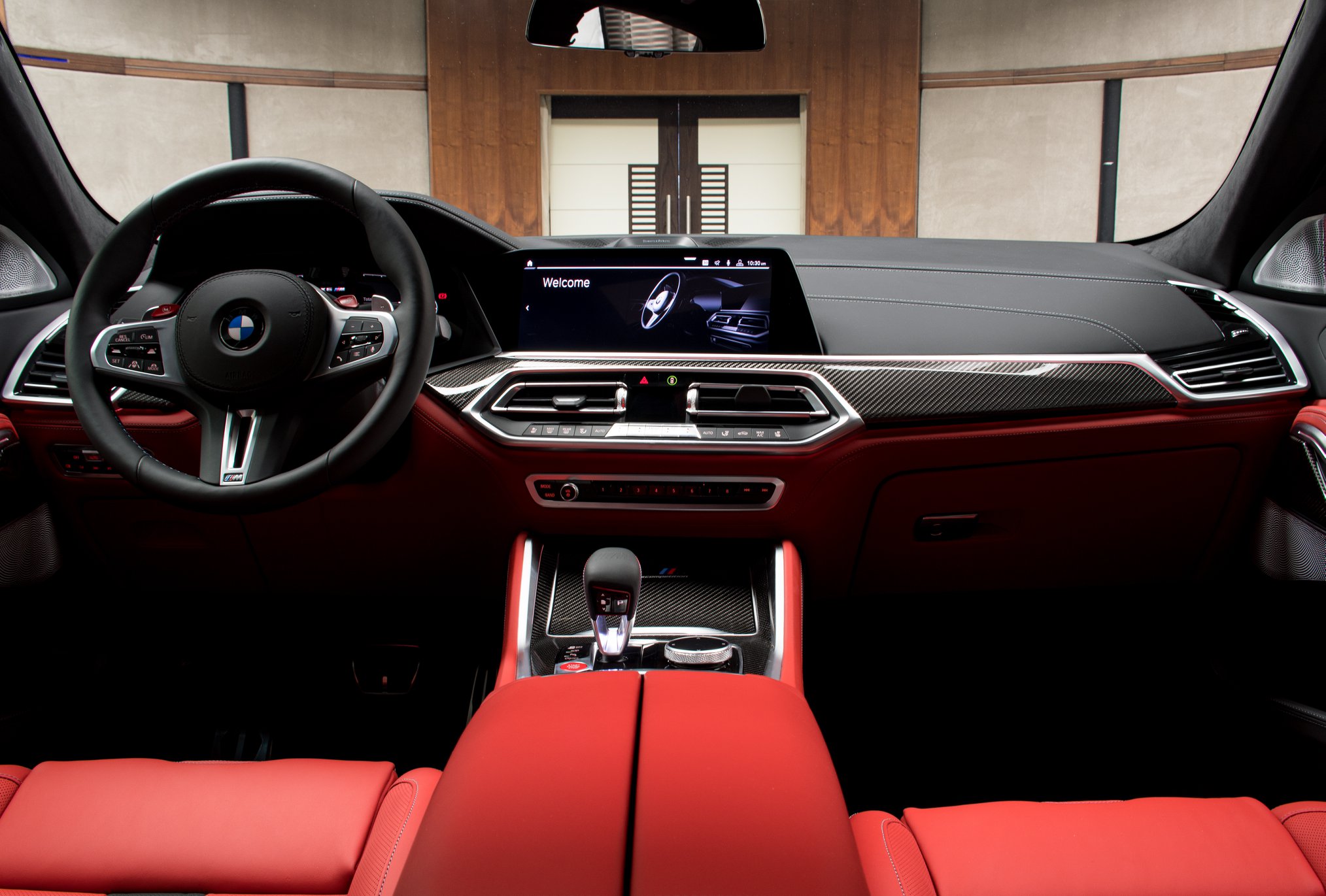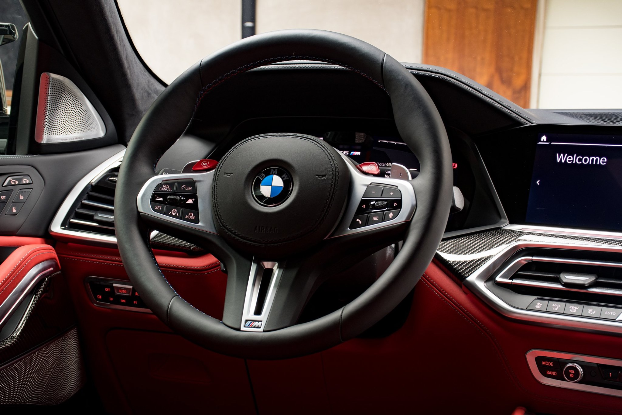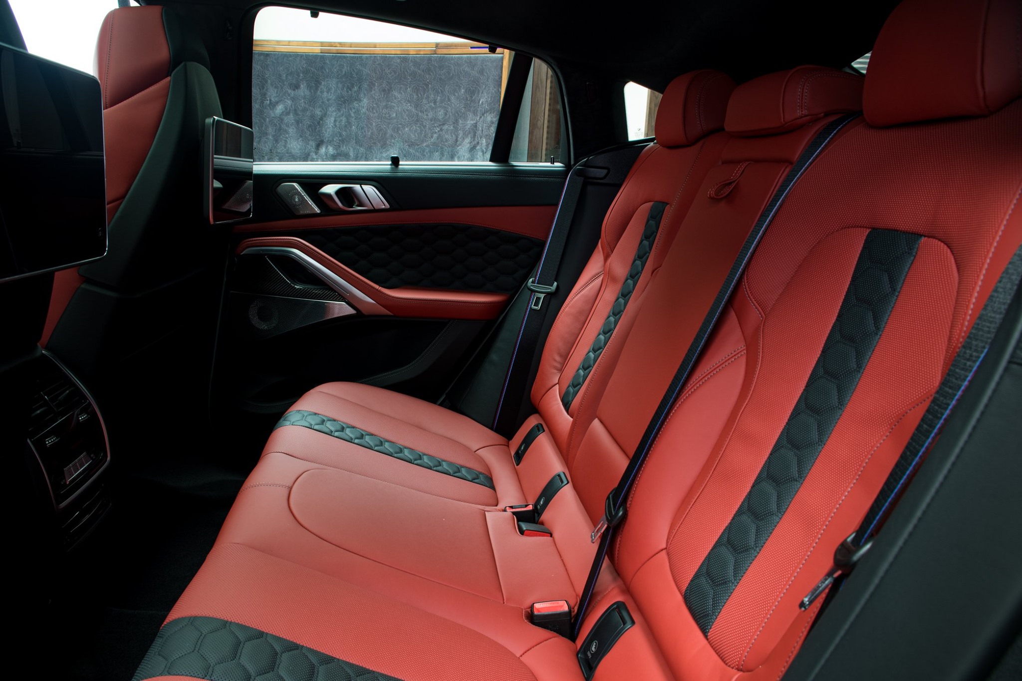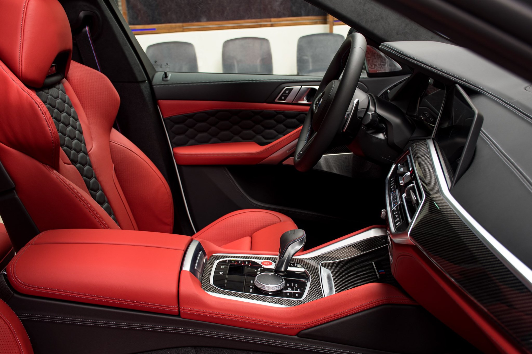 Die meisten Highlights werden weithin sichtbar präsentiert, aber im Fall dieses BMW X6 M Competition F96 mit Interieur in Sakhir Orange sieht die Sache anders aus: Obwohl auch das Exterieur viel zu bieten hat, zeigt sich das optische Highlight des Power-SUV-Coupés erst beim Blick in den Innenraum. Dort trägt der X6 M die Vollleder-Ausstattung Merino Feinnarbe in Sakhir Orange und Schwarz sowie die Interieurleisten Carbon Fibre. Passend zur rot-orangen Lederausstattung sind die roten M1- und M2-Knöpfe am Lenkrad sowie der Start-Stopp-Knopf auf der Mittelkonsole lackiert.