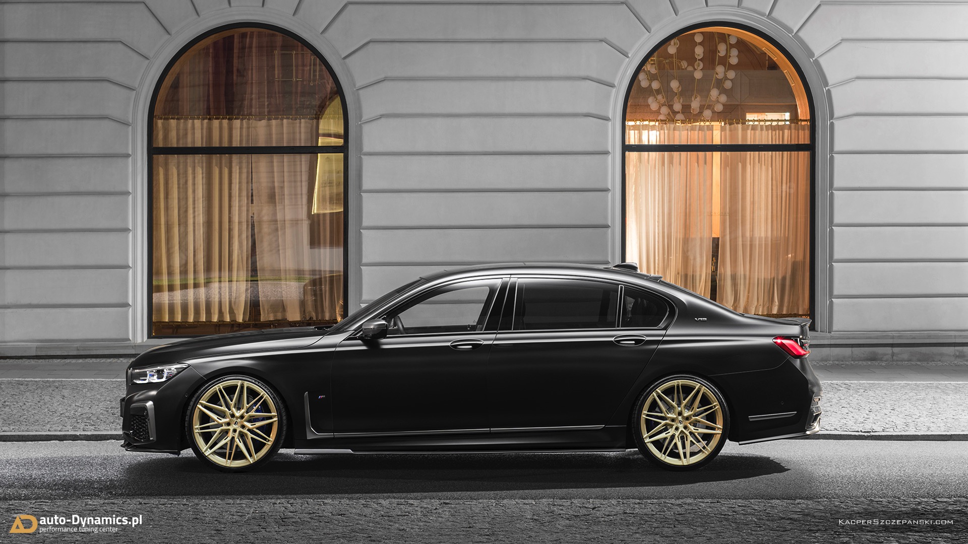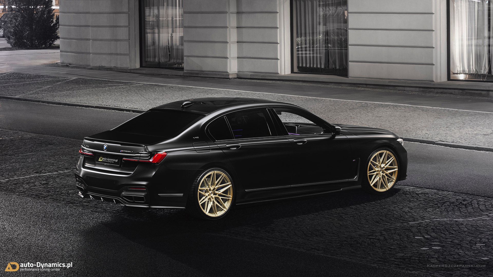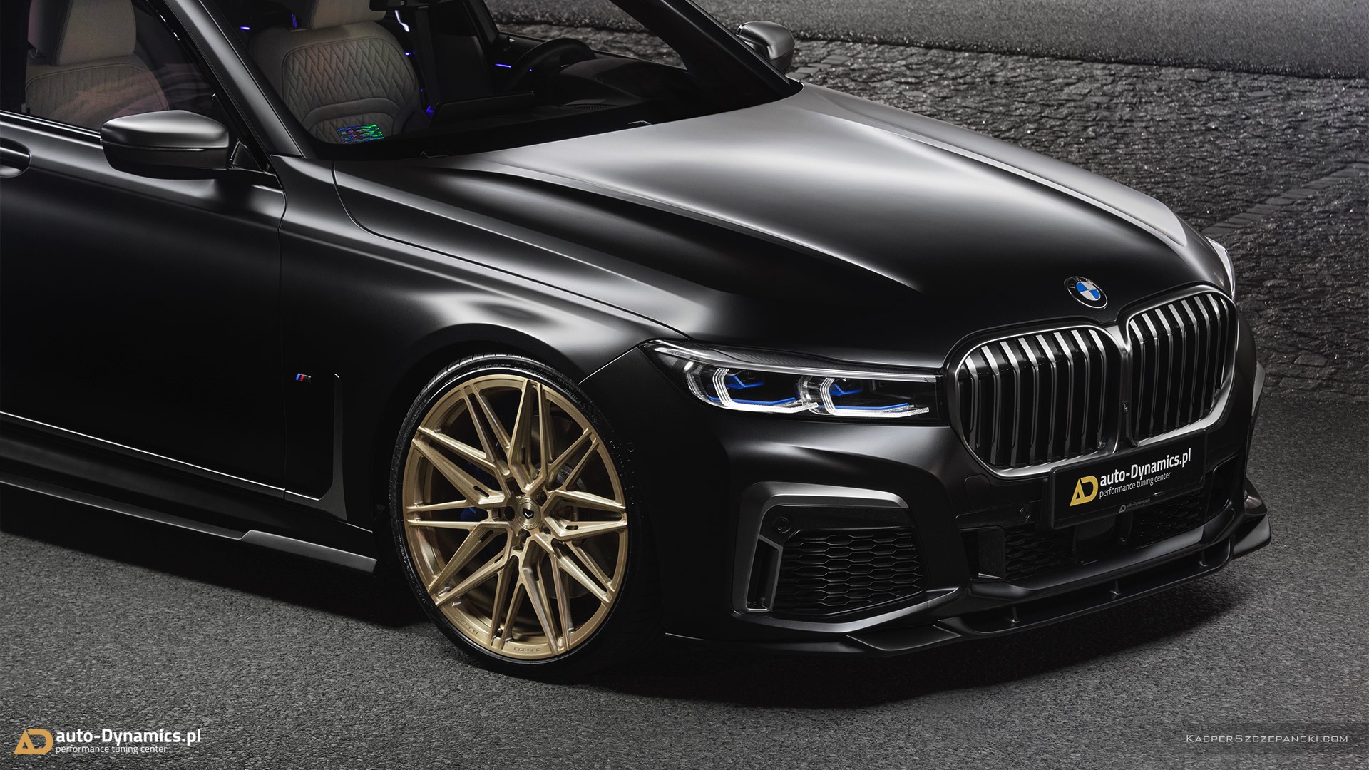 Wer eine Legende wie den BMW V12-Biturbo N74 standesgemäß verabschieden will, muss sich etwas Besonderes einfallen lassen. Auto-Dynamics.pl setzt dabei auf einen extrovertierten Auftritt, der selbst im Kontext des ohnehin sehr selbstbewussten BMW 7er Facelift noch richtig auffällt. Die wichtigste Maßnahme ist eine Folierung in mattem Schwarz, die nicht zufällig an eine Individual-Lackierung in Frozen Black erinnert. Kombiniert werden die mattschwarzen Oberflächen mit 22 Zoll großen Felgen mit goldenem Finish, wodurch sich ein spannender Kontrast aus mattschwarzer Zurückhaltung und goldglänzender Suche nach Aufmerksamkeit ergibt.