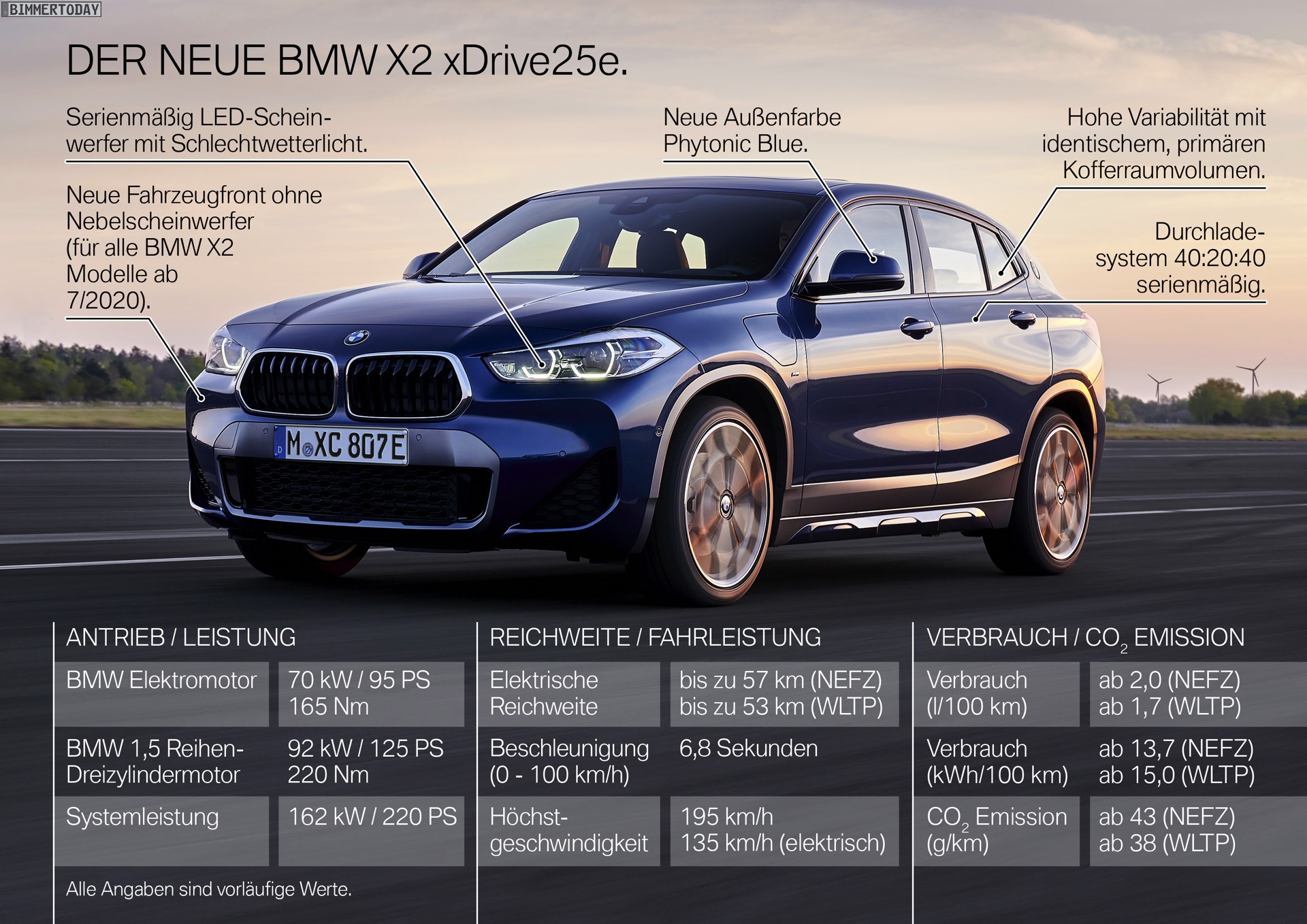 Im rein elektrischen Fahrmodus arbeitet nur der 95 PS und 165 Newtonmeter leistende Elektromotor, wodurch der BMW X2 xDrive25e zum Hecktriebler wird. Schaltet sich der Verbrennungsmotor mit 125 PS und 220 Newtonmeter hinzu, ergibt sich ein Allradantrieb mit variabler Kraftverteilung. Auf griffigem Untergrund ist der Hybrid-X2 stark genug, um in 6,8 Sekunden von 0 auf 100 zu beschleunigen. Die Höchstgeschwindigkeit von 195 km/h wird ohne Unterstützung des Elektromotors erreicht, im Alleingang schafft letzterer bis zu 135 km/h.
