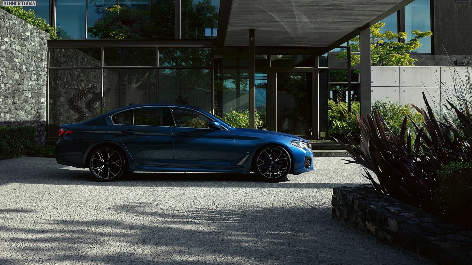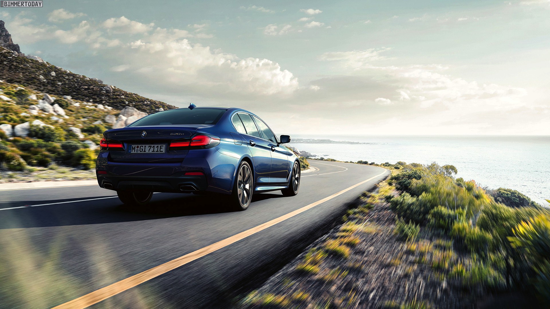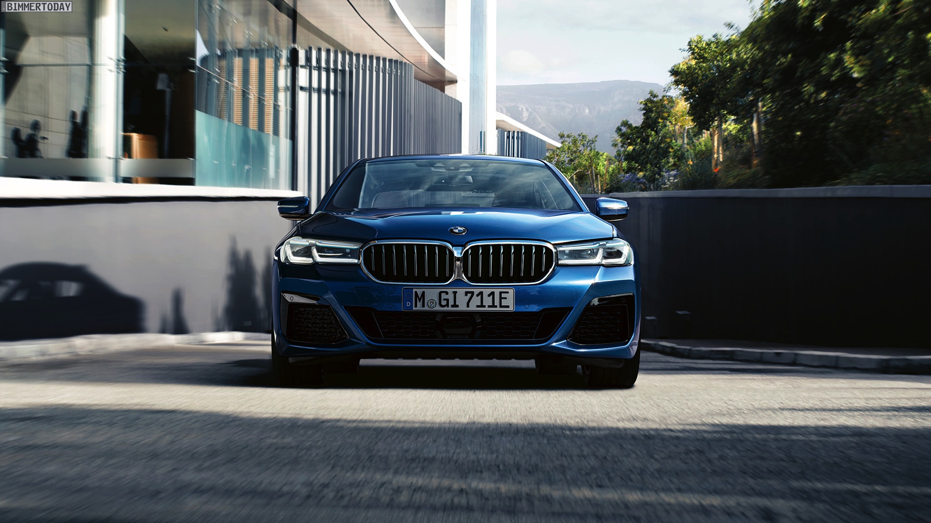 Wie üblich werden auf den Wallpaper-Motiven die schon auf den Pressebildern gezeigten Positionierungs-Konfigurationen in Szene gesetzt. Im Fall der neuen BMW 5er Limousine sehen wir folglich einen 530e Plug-in-Hybrid mit M Sport-Paket, Lackierung in der neuen Farboption Phytonicblau Metallic und den 20 Zoll großen Leichtmetallrädern Y-Speiche 846 M Bicolor Jetblack. Das Fahrzeug trägt außerdem die Chrome Line Exterieur und die an den blauen “Augenbrauen” erkennbaren Laserlicht-Scheinwerfer.