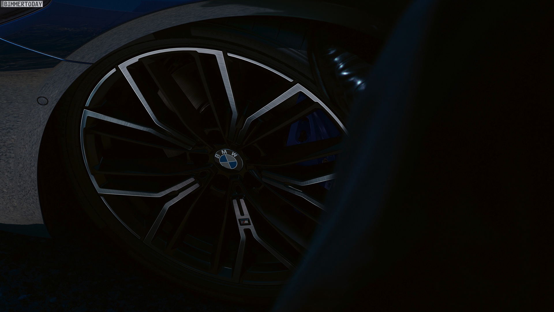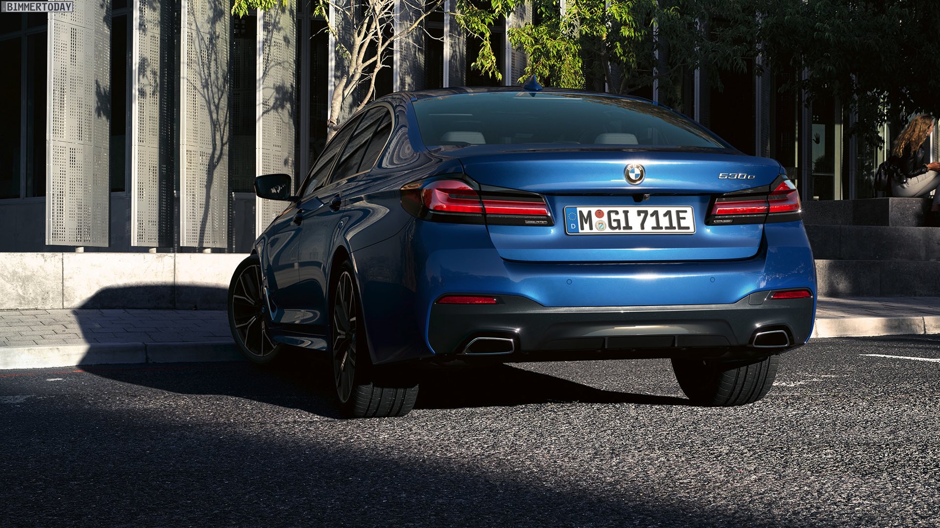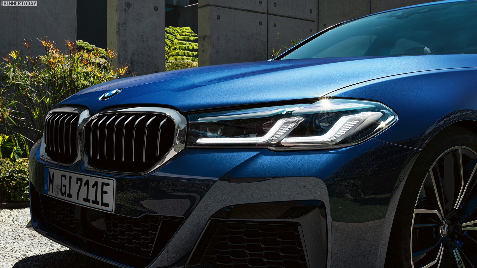 Wie üblich werden auf den Wallpaper-Motiven die schon auf den Pressebildern gezeigten Positionierungs-Konfigurationen in Szene gesetzt. Im Fall der neuen BMW 5er Limousine sehen wir folglich einen 530e Plug-in-Hybrid mit M Sport-Paket, Lackierung in der neuen Farboption Phytonicblau Metallic und den 20 Zoll großen Leichtmetallrädern Y-Speiche 846 M Bicolor Jetblack. Das Fahrzeug trägt außerdem die Chrome Line Exterieur und die an den blauen “Augenbrauen” erkennbaren Laserlicht-Scheinwerfer.