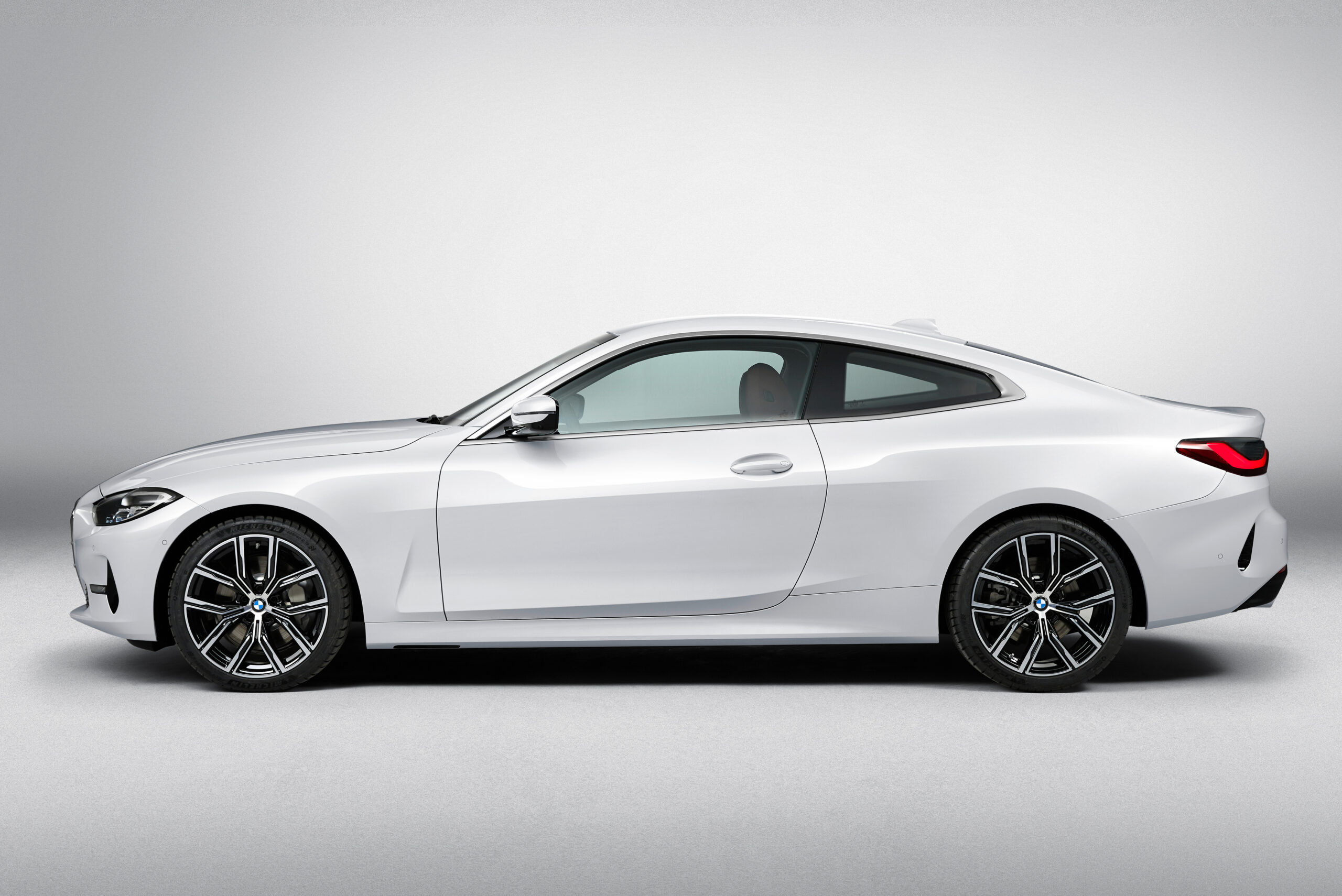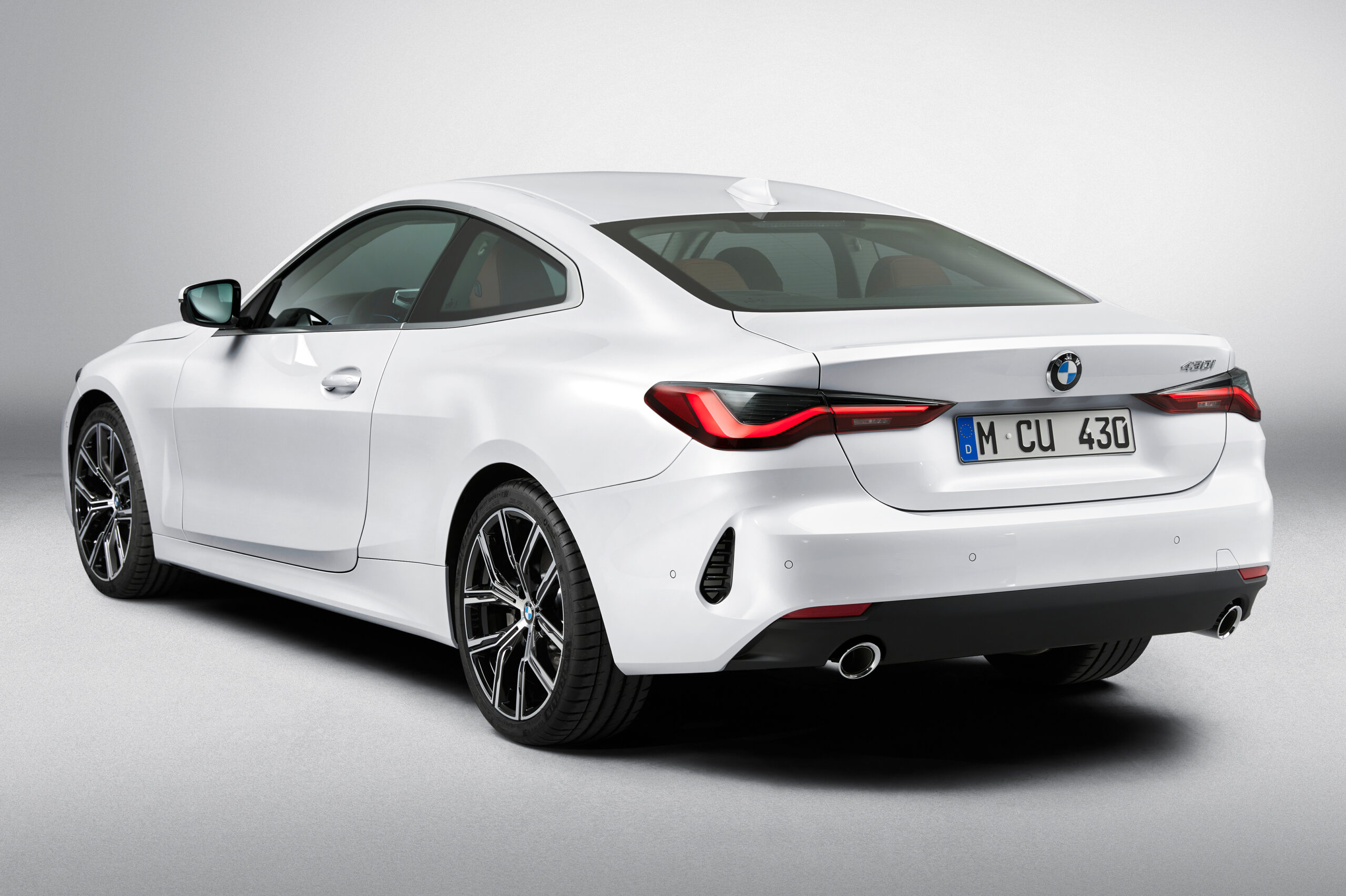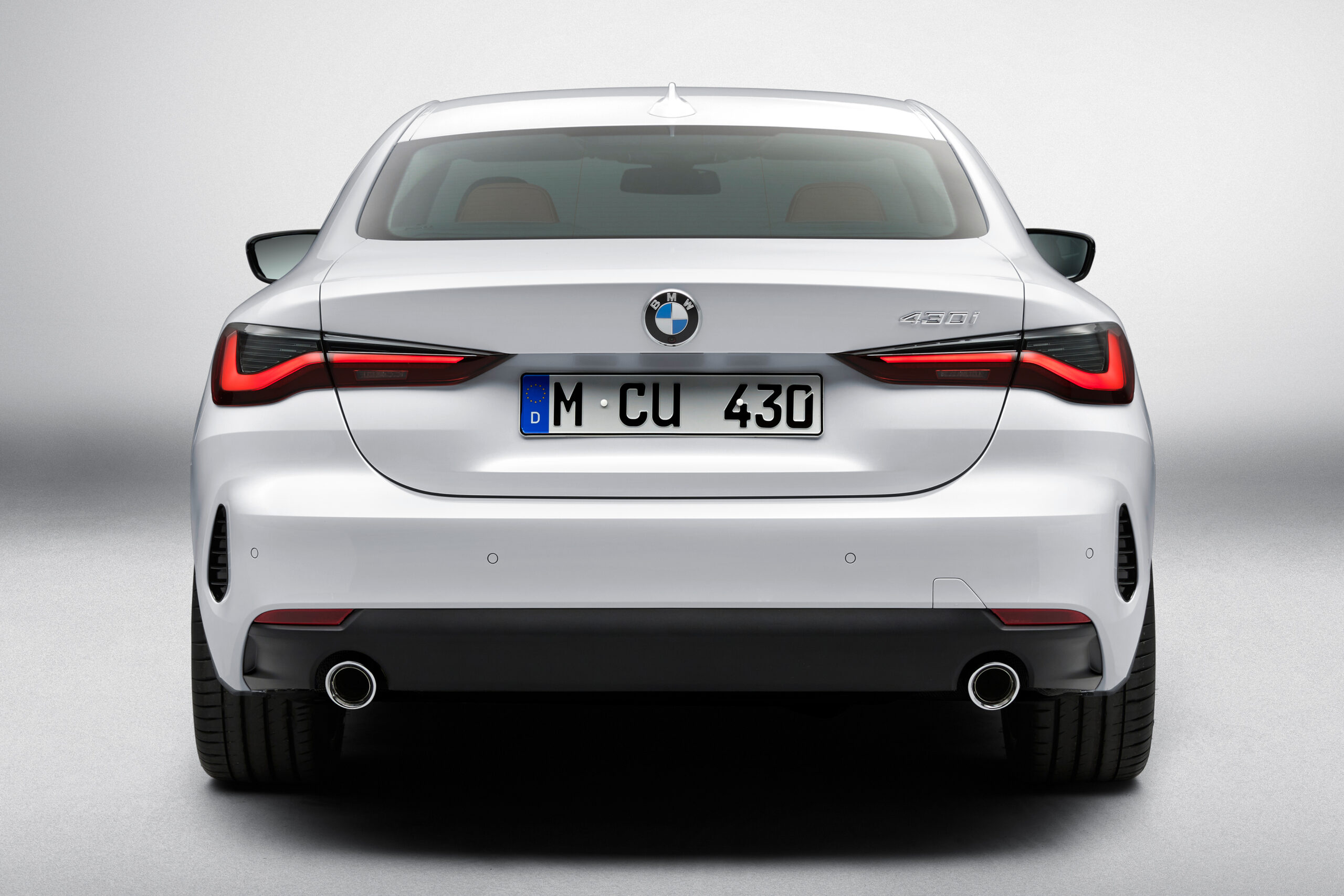 Auch ohne das sportliche Ausstattungspaket und die damit verbundenen Schürzen und Felgen ist das BMW 4er Coupé optisch kein Leisetreter: Die markante Doppelniere im Mesh-Design, die dynamisch auf die Niere zugeschnittenen Scheinwerfer und die in das Naca-Design der seitlichen Lufteinlässe integrierten Nebelscheinwerfer bescheren dem 4er auch in der Serien-Konfiguration einen sehr sportlichen Look. Am Heck betonen die schmal gezeichneten Rückleuchten die Breite des Fahrzeugs, während die Heckschürze mit angedeuteten Luftauslässen und einem farblich abgesetzten Diffusor-Einsatz den sportlichen Anspruch unterstreicht. Die Abgasanlage mit jeweils einem Endrohr links und rechts ist bei allen Motorisierungen serienmäßig verbaut, nur die sportlichen Topmodelle M440i und M440d kommen mit trapezförmigen Endrohr-Blenden.