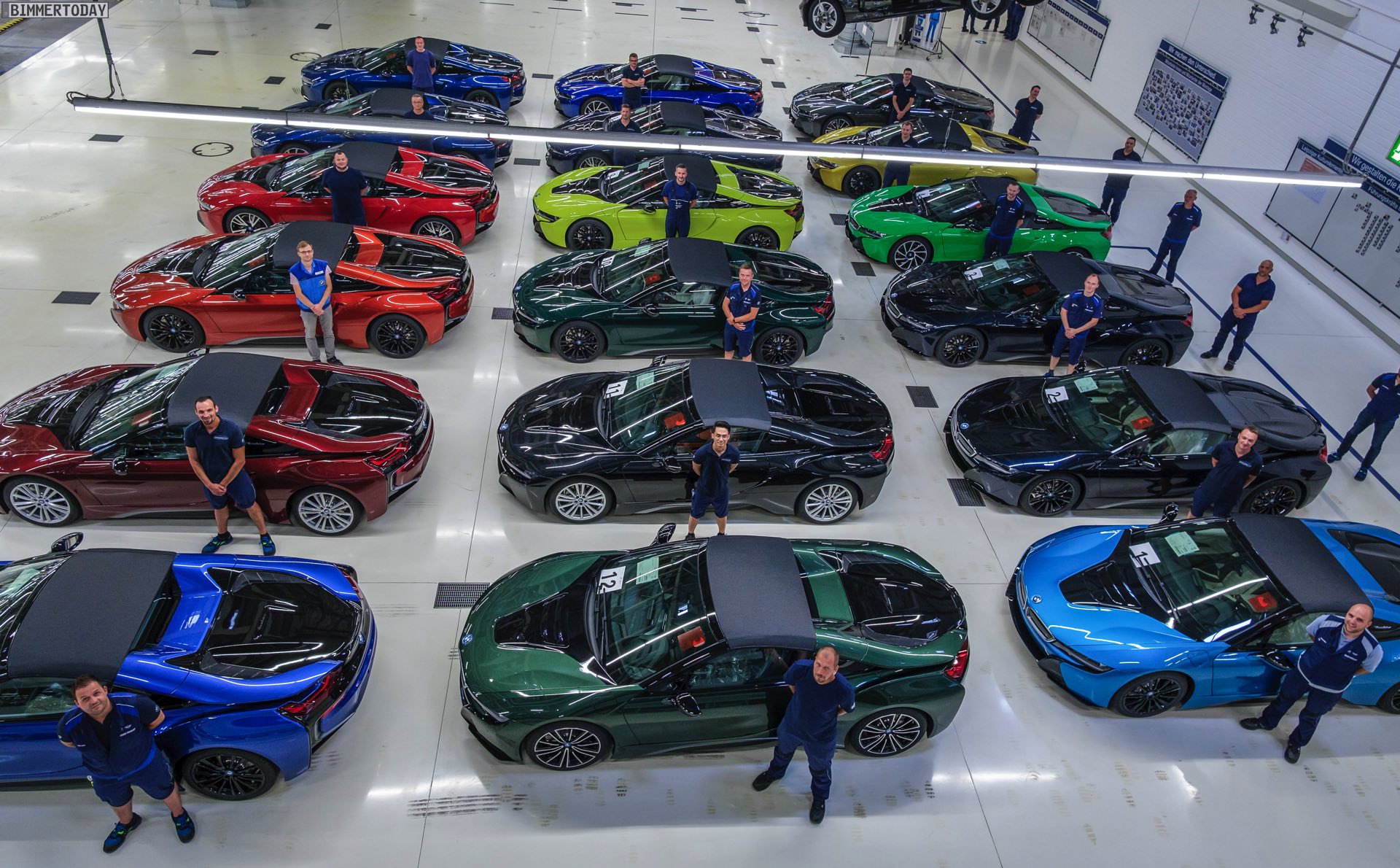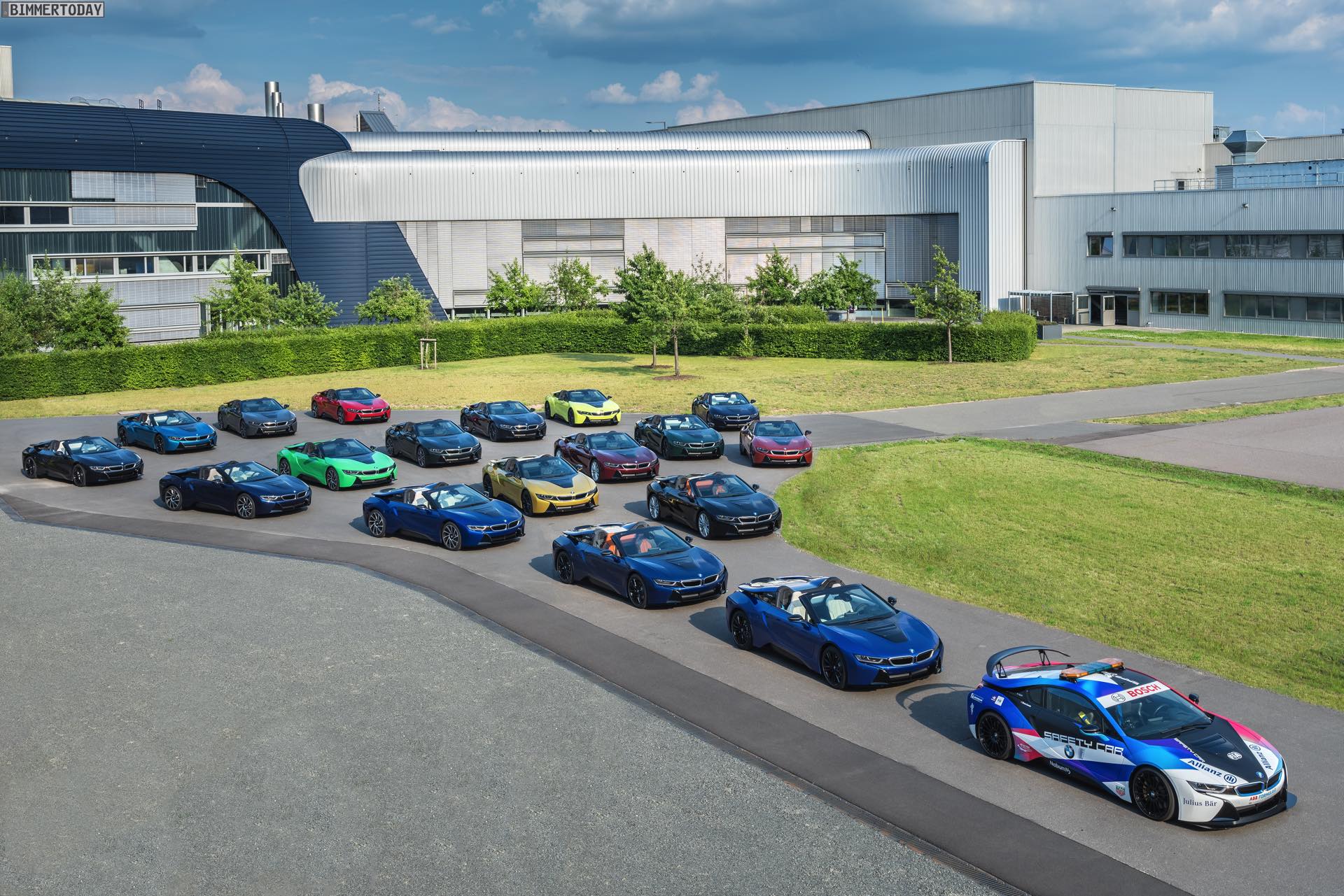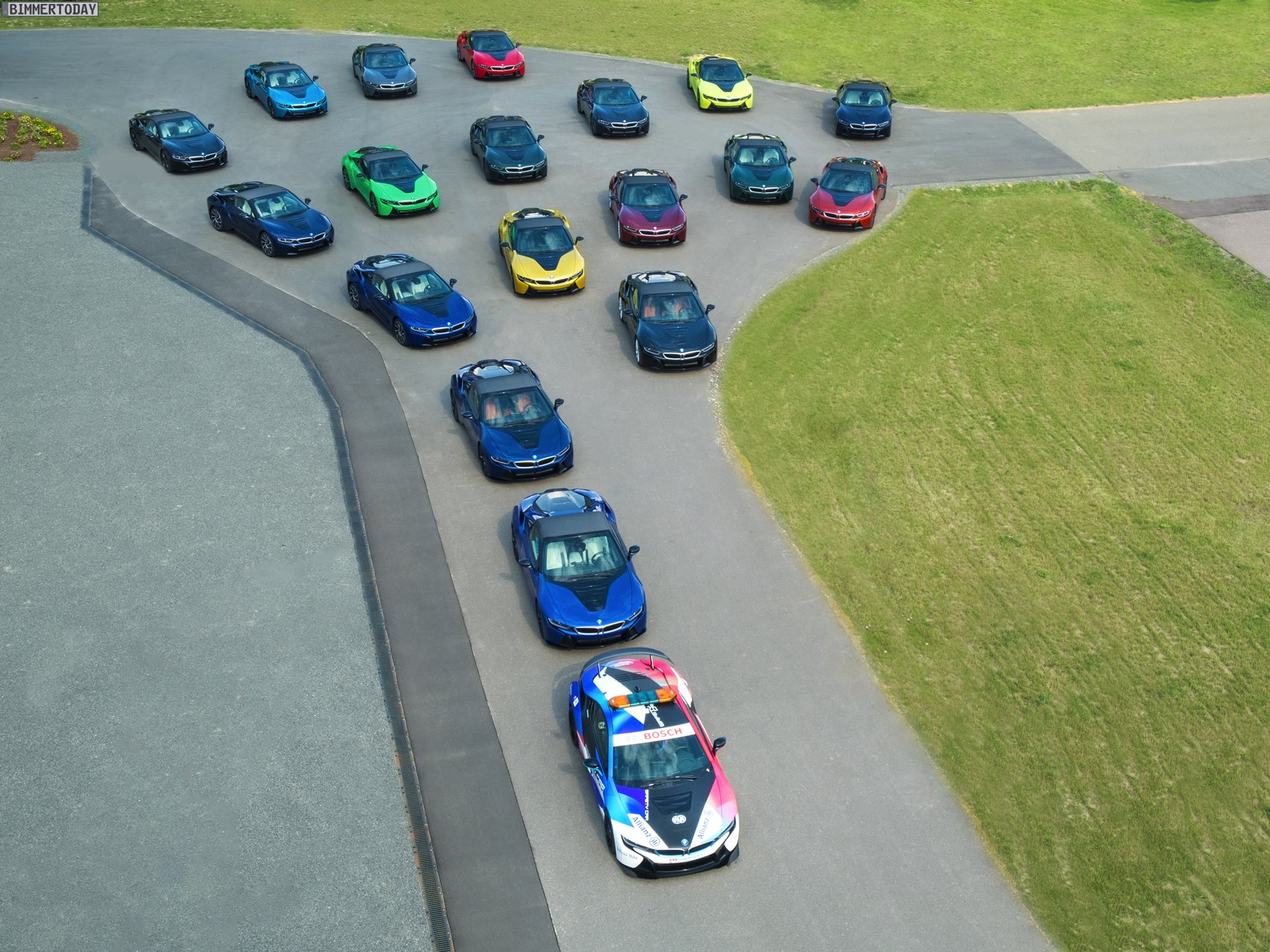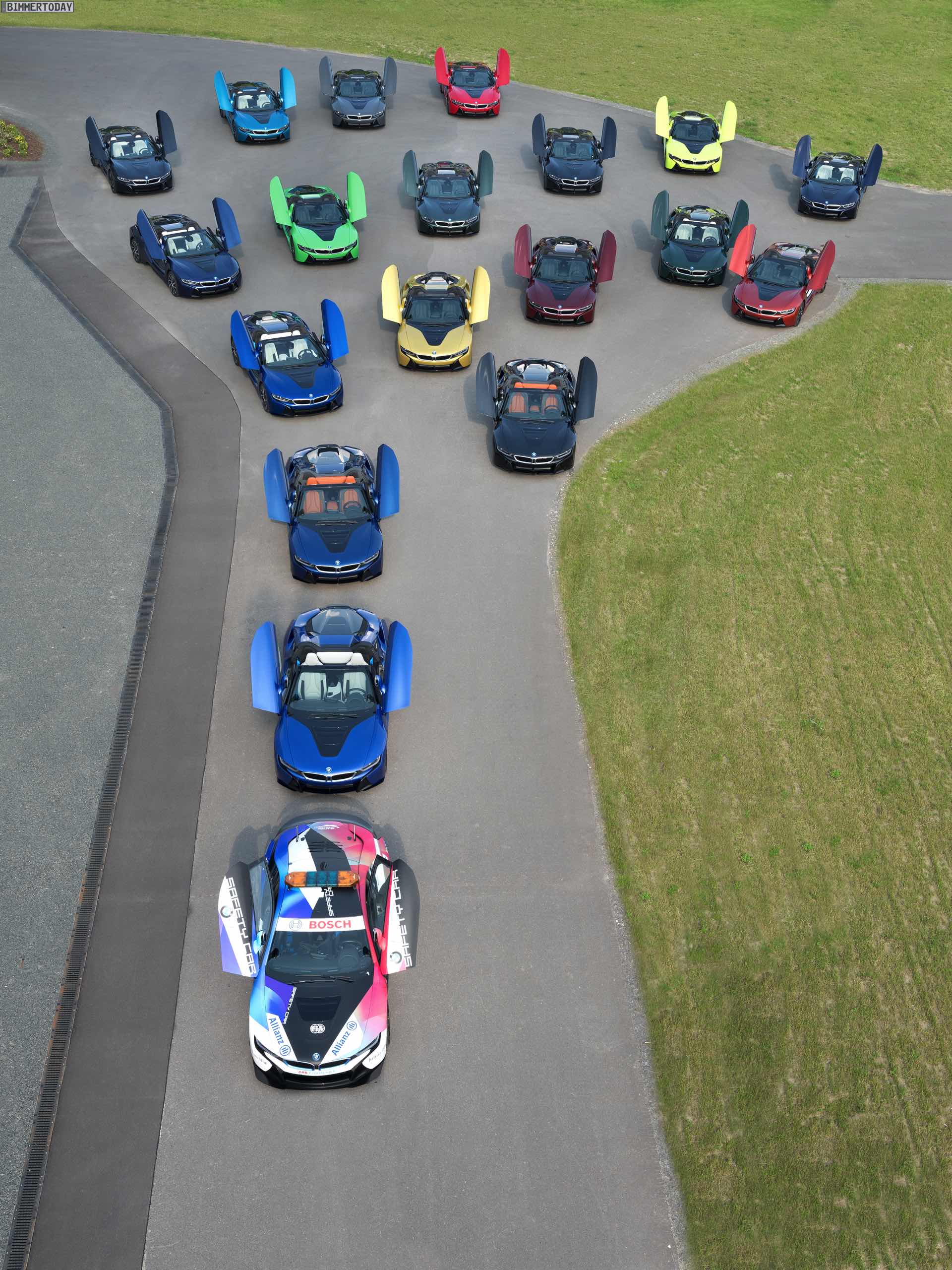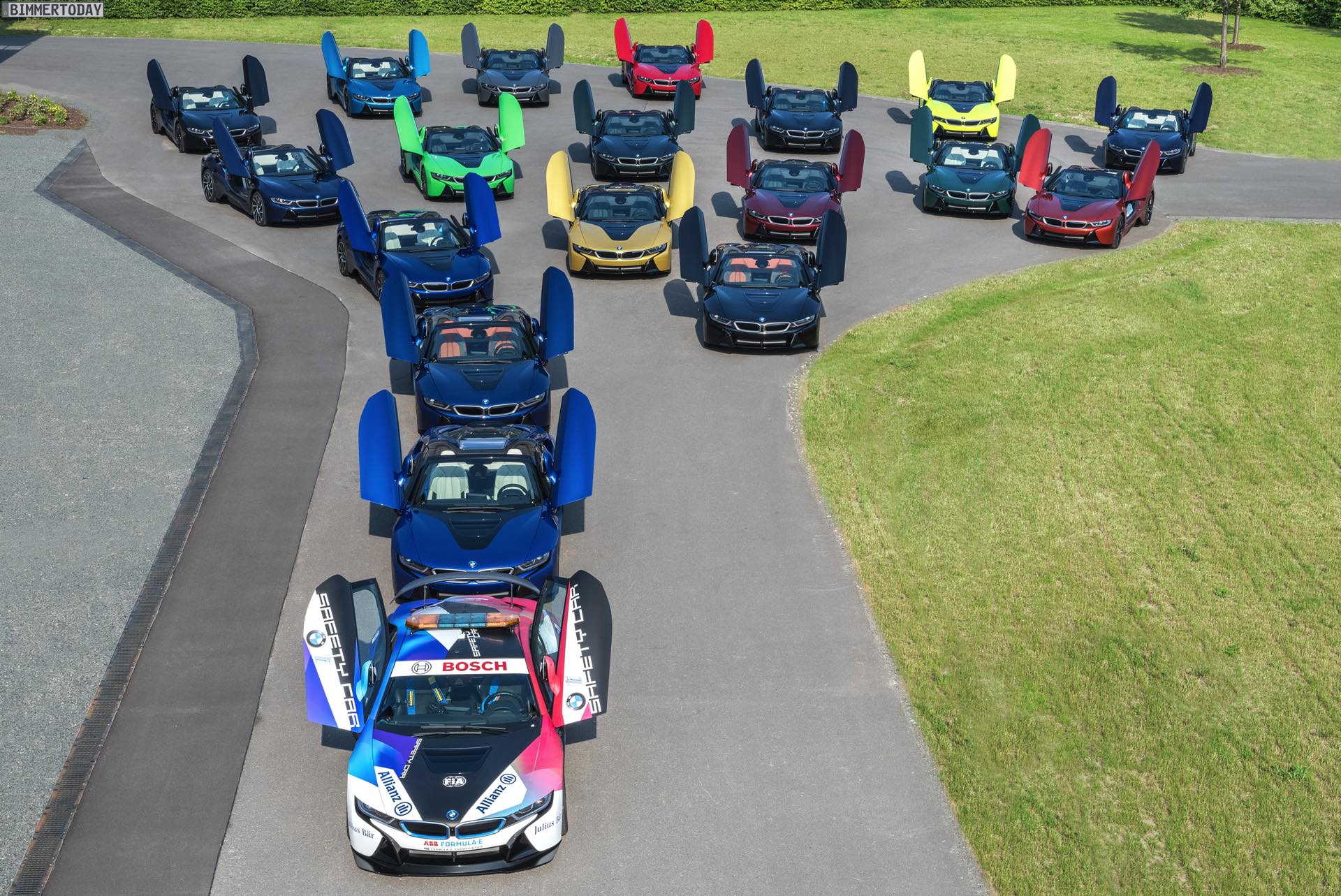 Wie die Fotos aus Leipzig zeigen, handelt es sich bei den letzten 18 Fahrzeugen ausnahmslos um BMW i8 Roadster. Beim Gruppenbild zum Abschied wurde die Flotte vom offenen Safety Car der Formel E angeführt. Zu den Farben der Kundenfahrzeuge zählen unter anderem British Racing Green, Le Mans Blau, Austin Yellow, Snapper Rocks Blue, Birch Green und Sunset Orange: