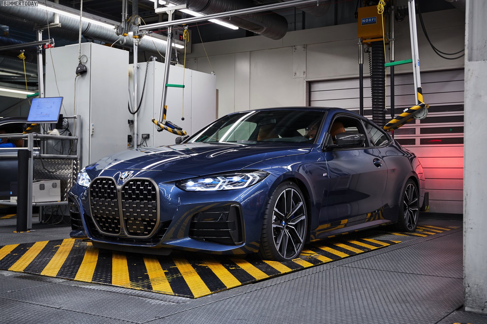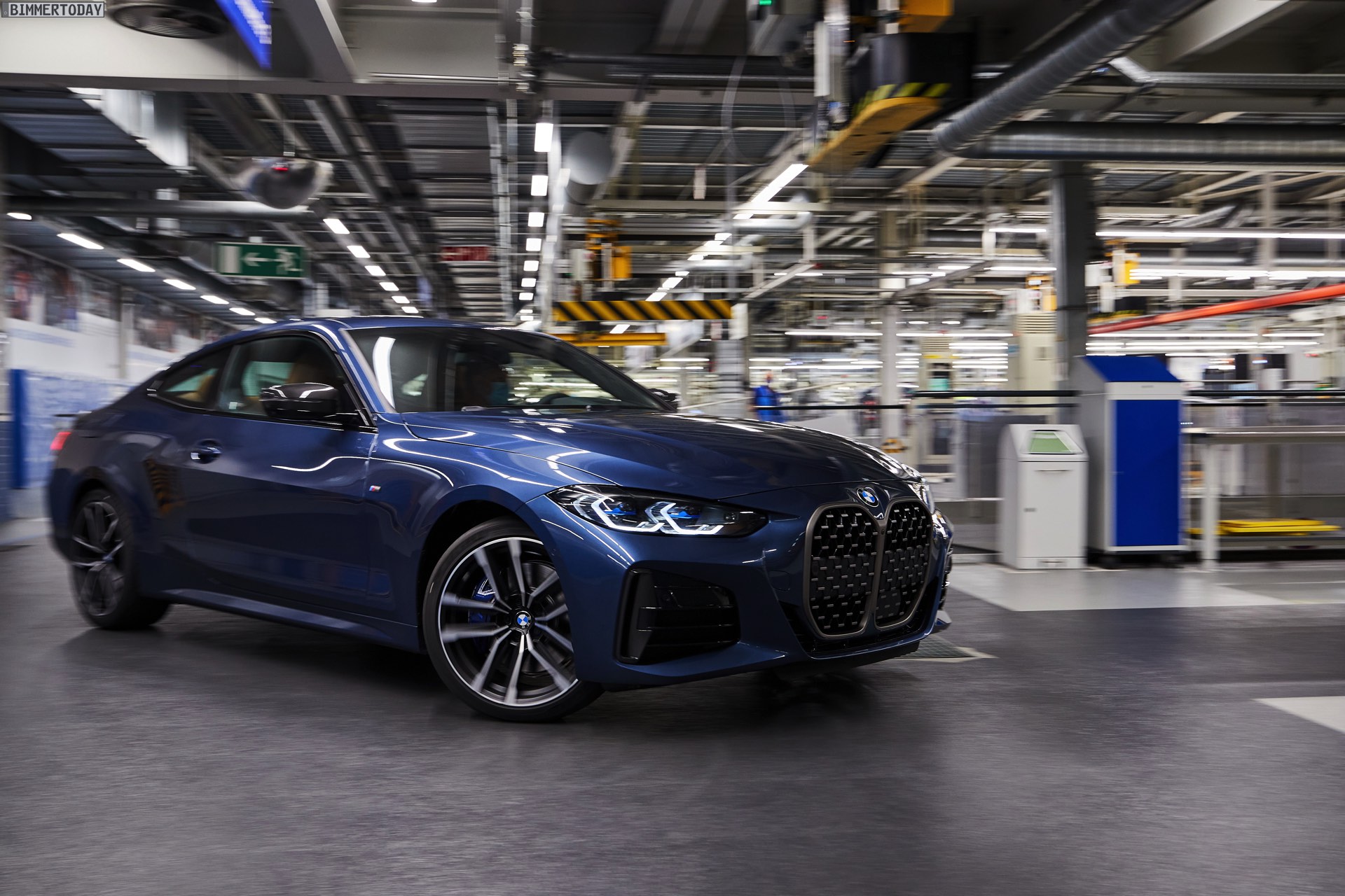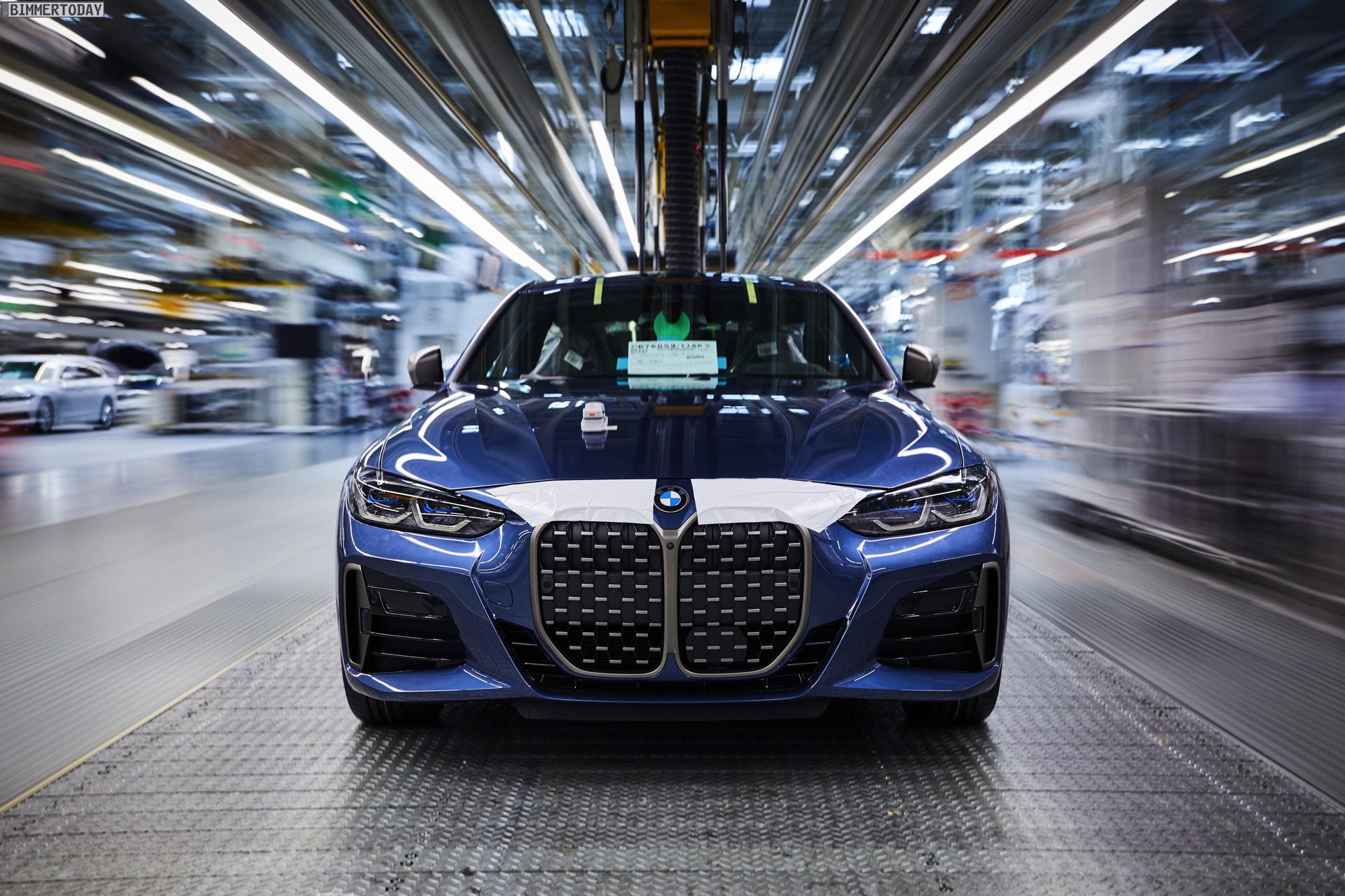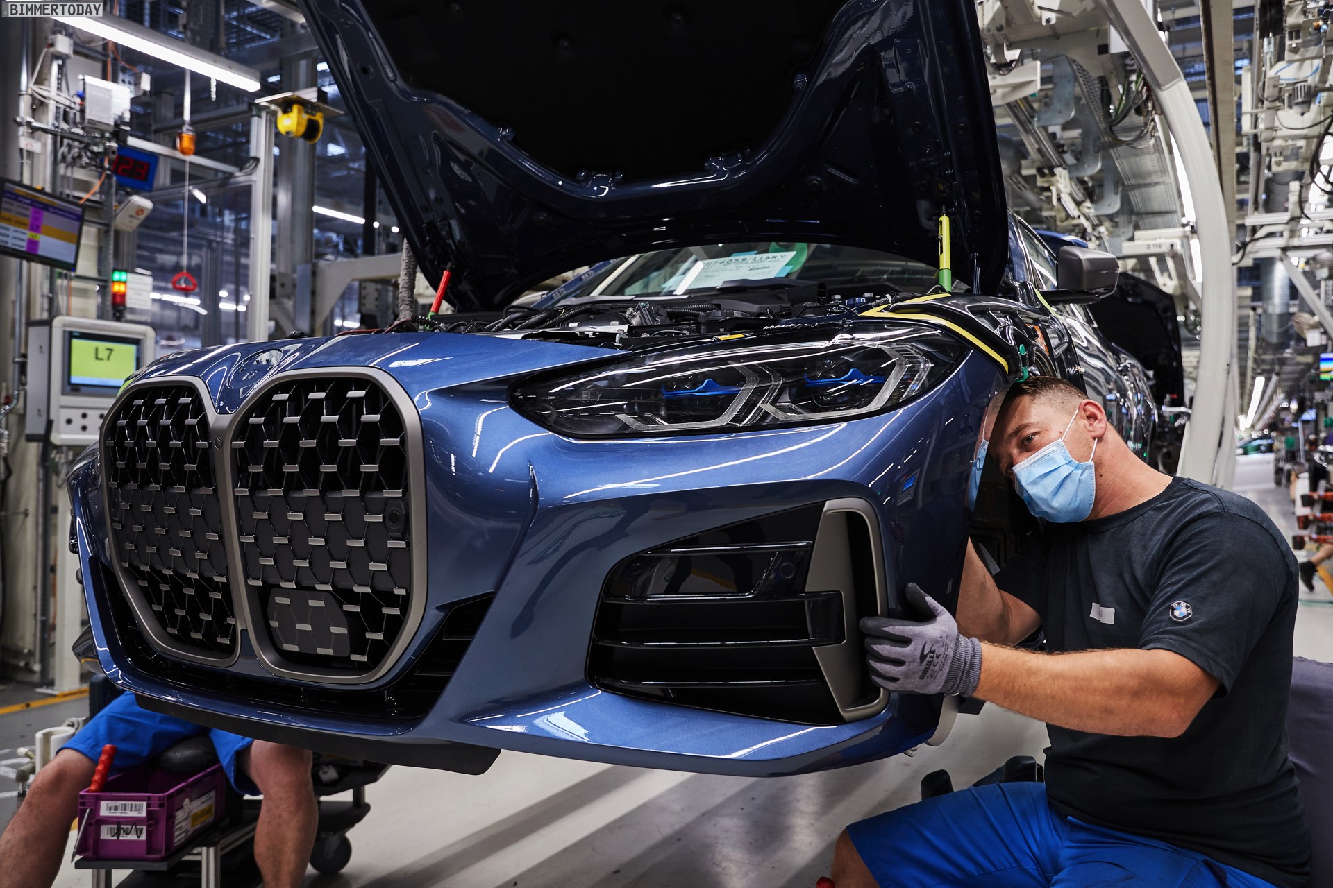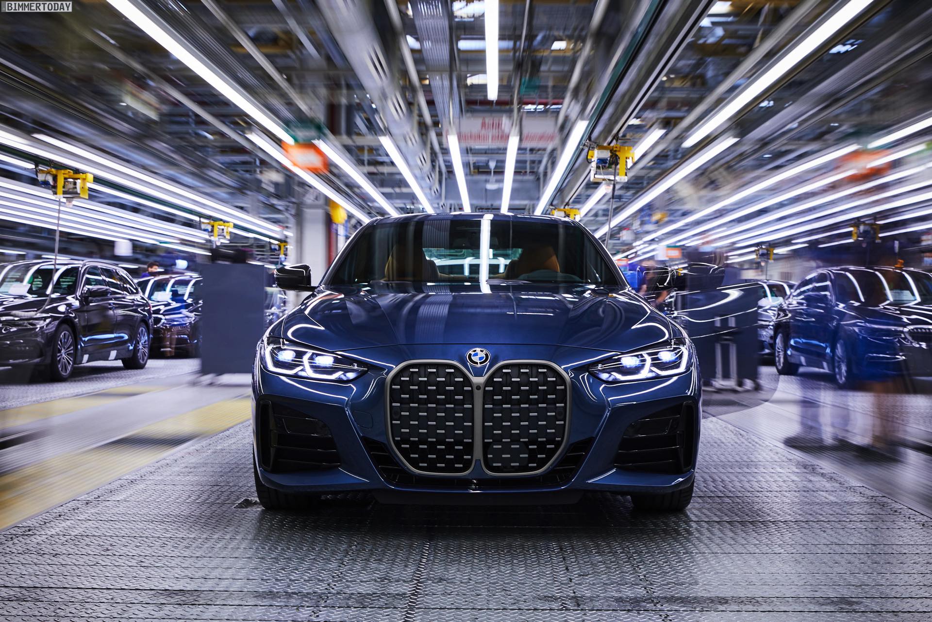 Auf den Bildern vom Produktions-Start steht wie schon bei der offiziellen Vorstellung das vorläufige Topmodell im Fokus: Die meisten Fotos zeigen das BMW M440i xDrive Coupé in der neuen Farbe Arctic Race Blue. Auf zwei Fotos sehen wir außerdem die Montage eines BMW 4er G22 in Portimao Blau und mit erweiterter Shadow Line samt schwarzer Nieren-Rahmen: