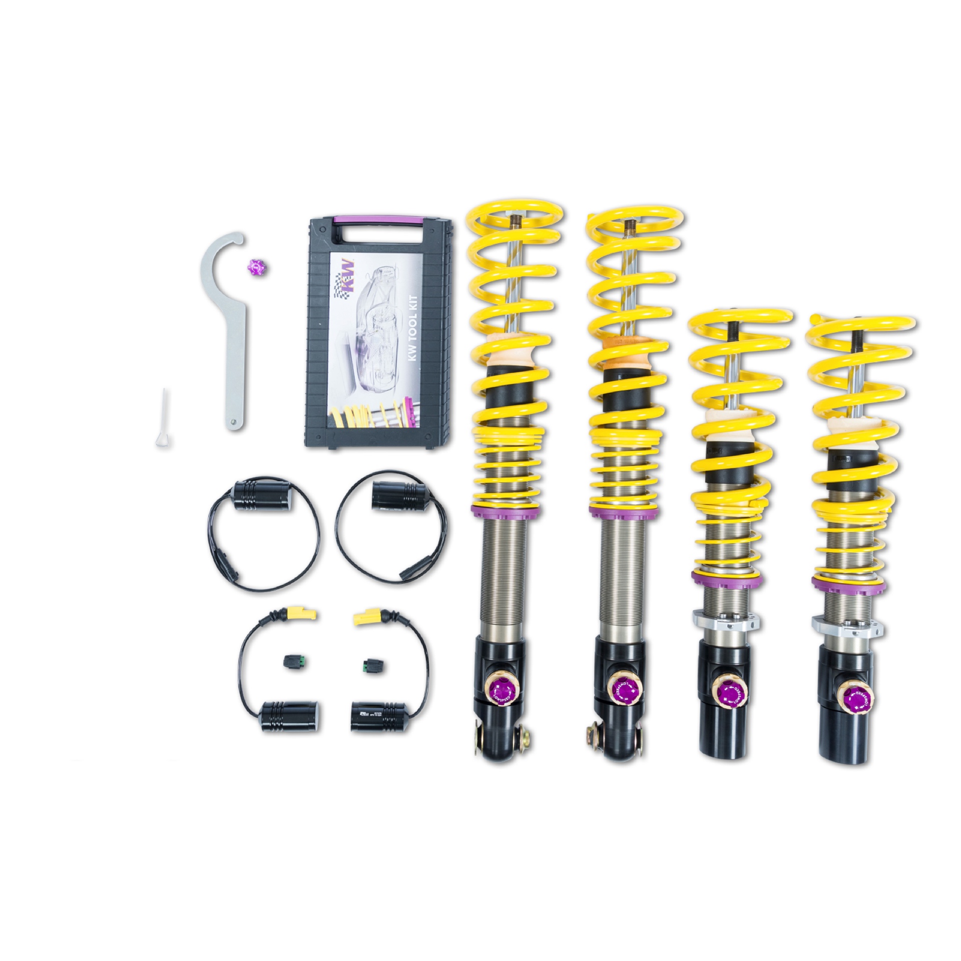 Jonas Ehrmann (KW Brandmanager): “Bei der Entwicklung unserer Variante 4 lagen der Fahrspaß und ein Gewinn der Fahr- und im Besonderen die Querdynamik im Fokus. Zusätzlich steigern unsere Dämpfer mit ihrer einstellbaren Mehrventiltechnologie den Fahrkomfort. Durch die unabhängig im Lowspeed- und Highspeed-Bereich einstellbare Druckstufe sowie der Zugstufe kann jederzeit unsere ab Werk eingestelltes Performance-Setting auf eine fahrkomfortorientierte Abstimmung gewechselt werden.