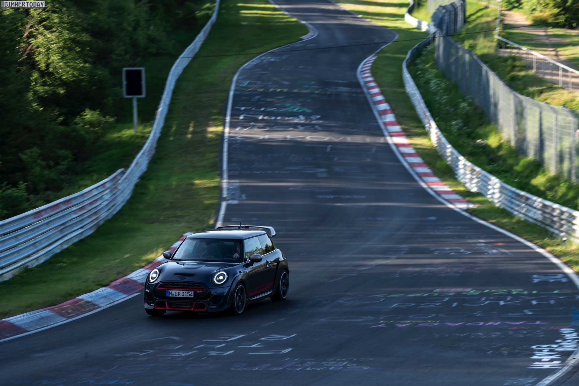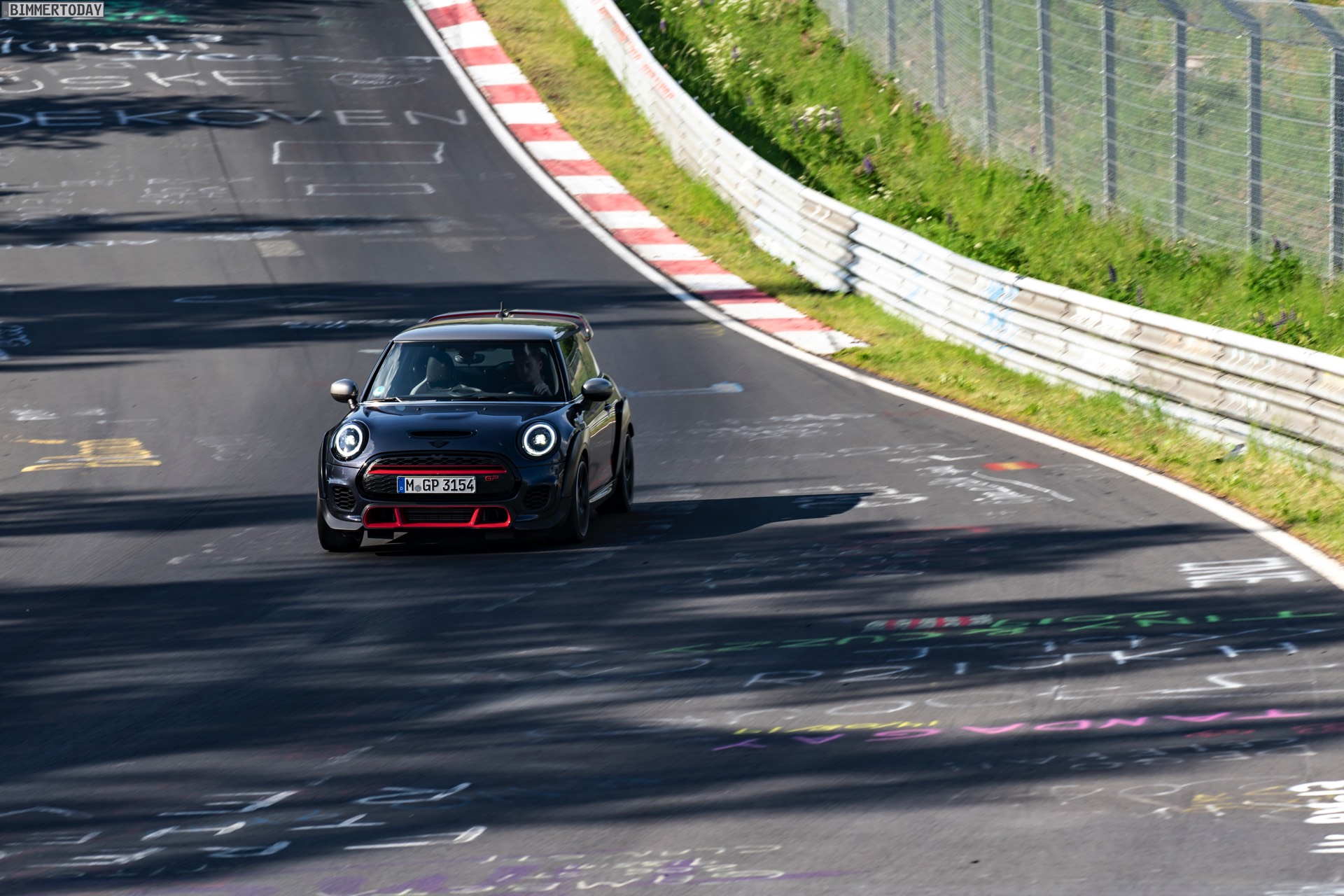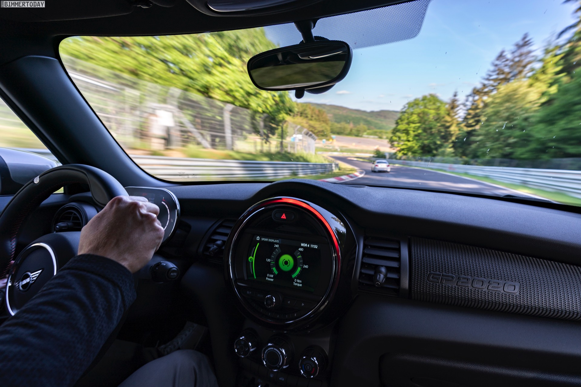 Im Onboard-Video sehen wir, wie der umfassend aufgerüstete Kleinwagen die Grüne Hölle in einer Zeit absolviert, die nicht nur im Kleinwagen-Segment und gerade mit Blick auf eine gemessene Asphalt-Temperatur von 53 Grad Celsius aller Ehren Wert ist. Der weltweit auf 3.000 Einheiten limitierte MINI John Cooper Works GP ist dabei auf Sportreifen vom Typ Hankook Ventus TD unterwegs, die rundum im Format 225/35 R18 zum Einsatz kommen.