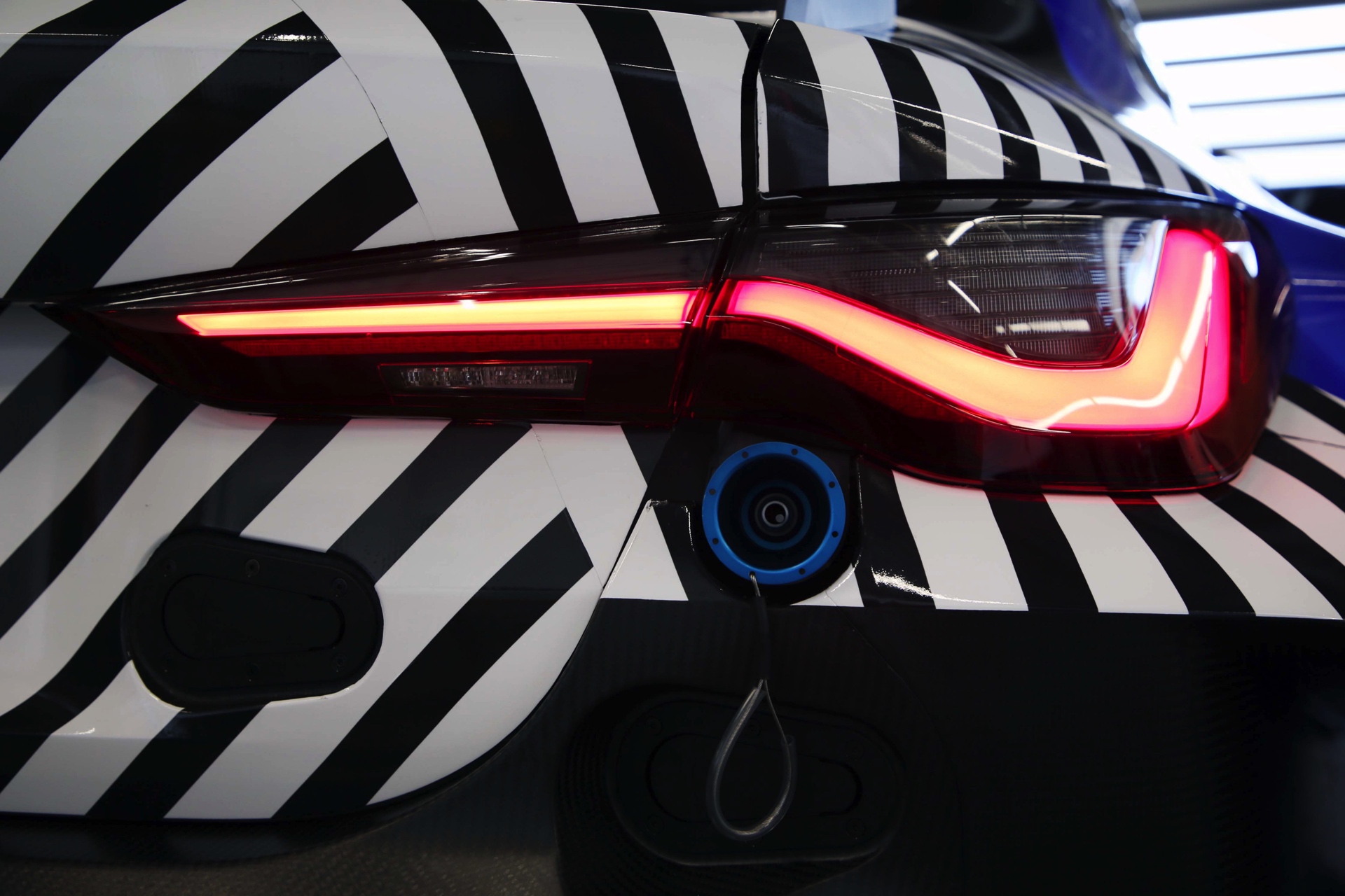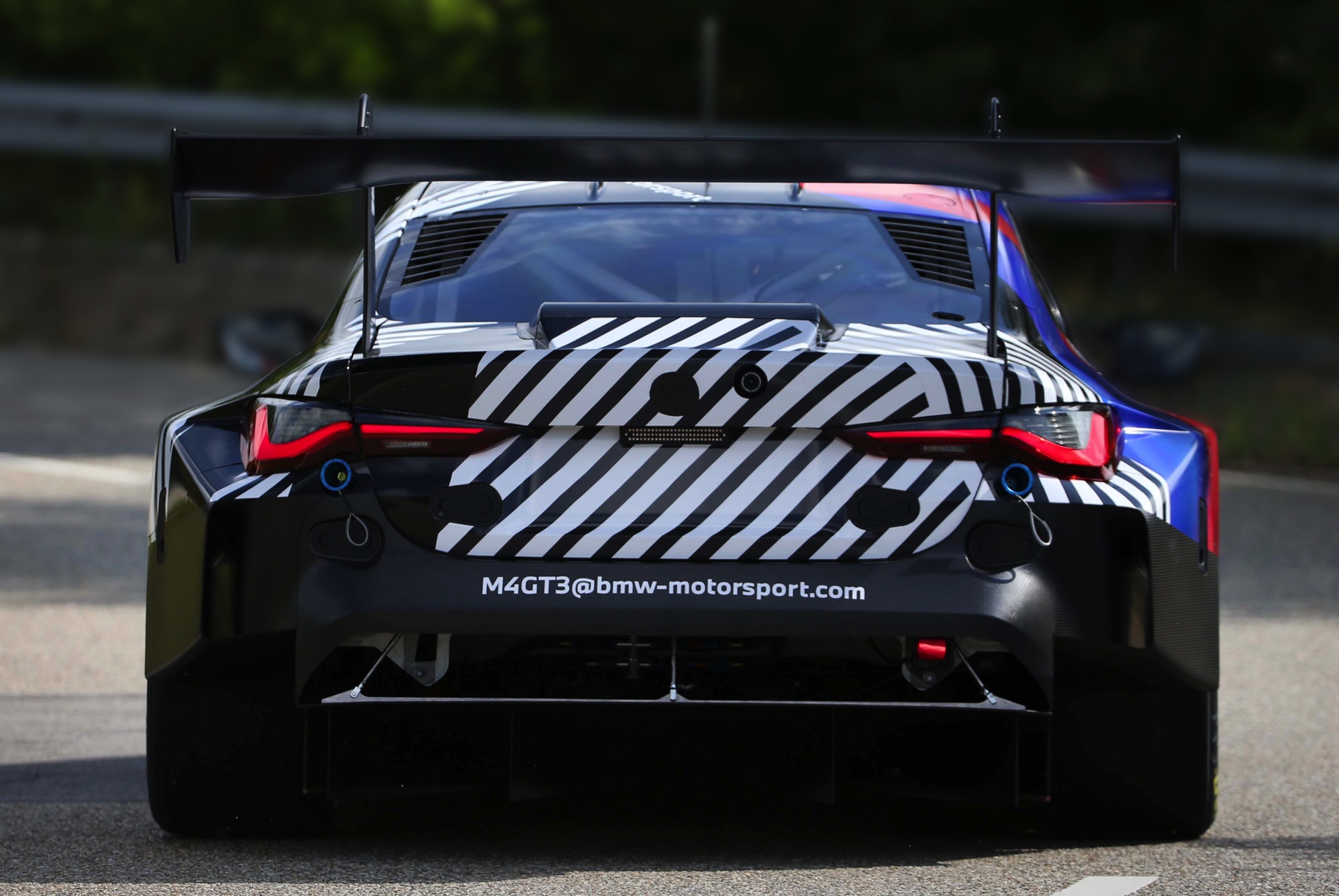 Während die Münchner bei den ersten wenigen Fotos vom Rollout ganz bewusst auf ein Bild der Front verzichten, liefert auch der Blick aufs Heck schon einige interessante Infos. Absolut unübersehbar ist die dramatisch verbreiterte Spur an der Hinterachse, die auf beiden Seiten weit über die Rückleuchten hinausragt und Platz für ein grundlegend überarbeitetes Fahrwerk bietet. Natürlich nutzt auch der imposante Heckflügel die volle Breite des Fahrzeugs aus. Spannend ist aber auch, was nicht zu sehen ist: Der BMW M4 GT3 kommt zumindest am Heck ohne sichtbare Endrohre aus. Das lässt nur zwei Optionen offen: Entweder werden die Abgase auf der Unterseite des Fahrzeugs entlassen, damit sie die aerodynamische Wirkung des Diffusors unterstützen und verstärken können – oder der Renn-M4 kommt mit Sidepipes vor den Hinterrädern.