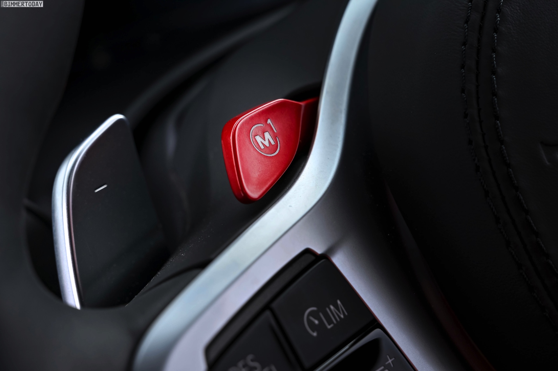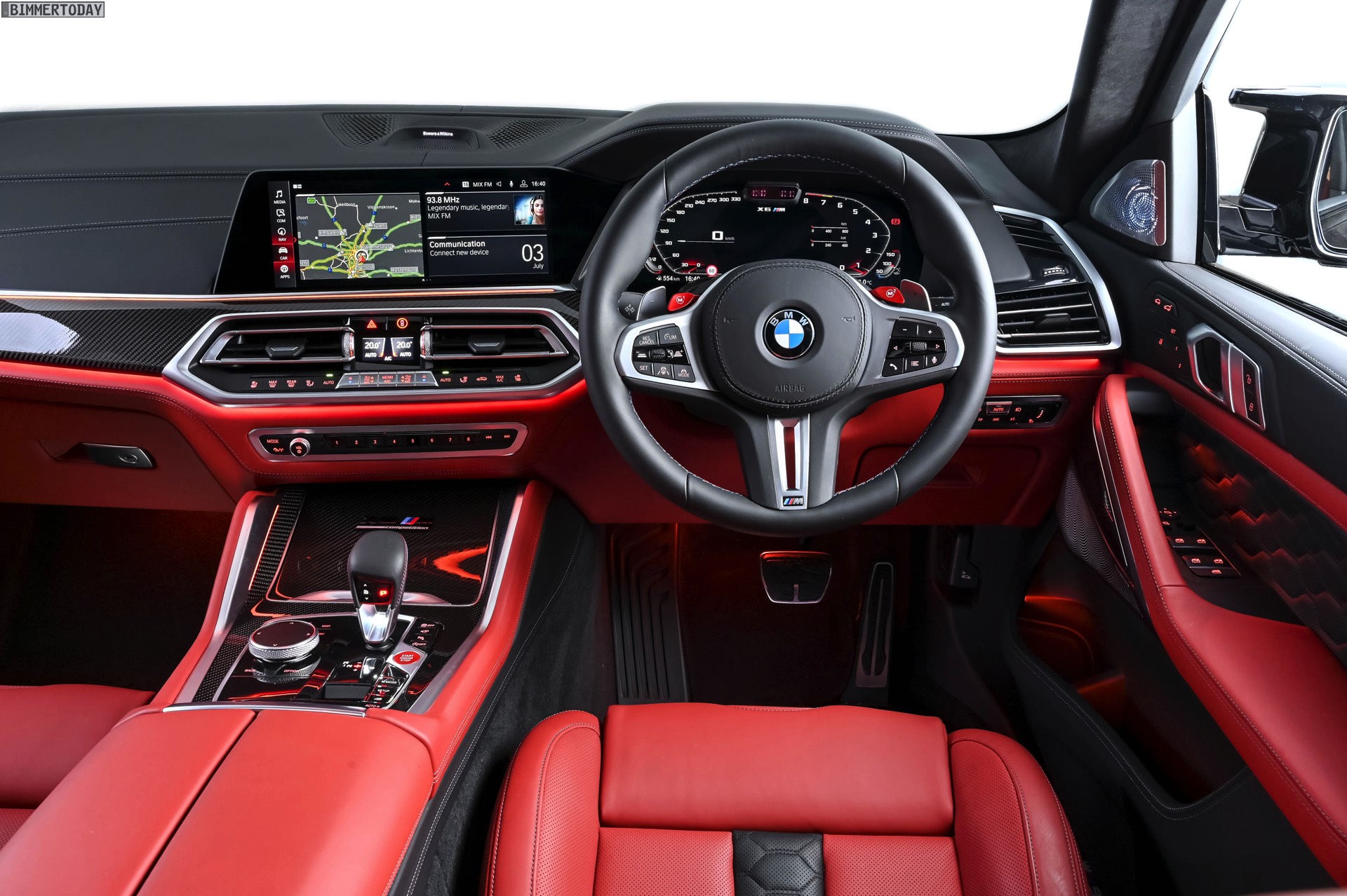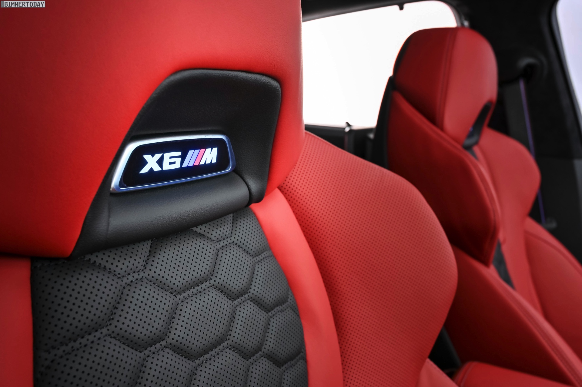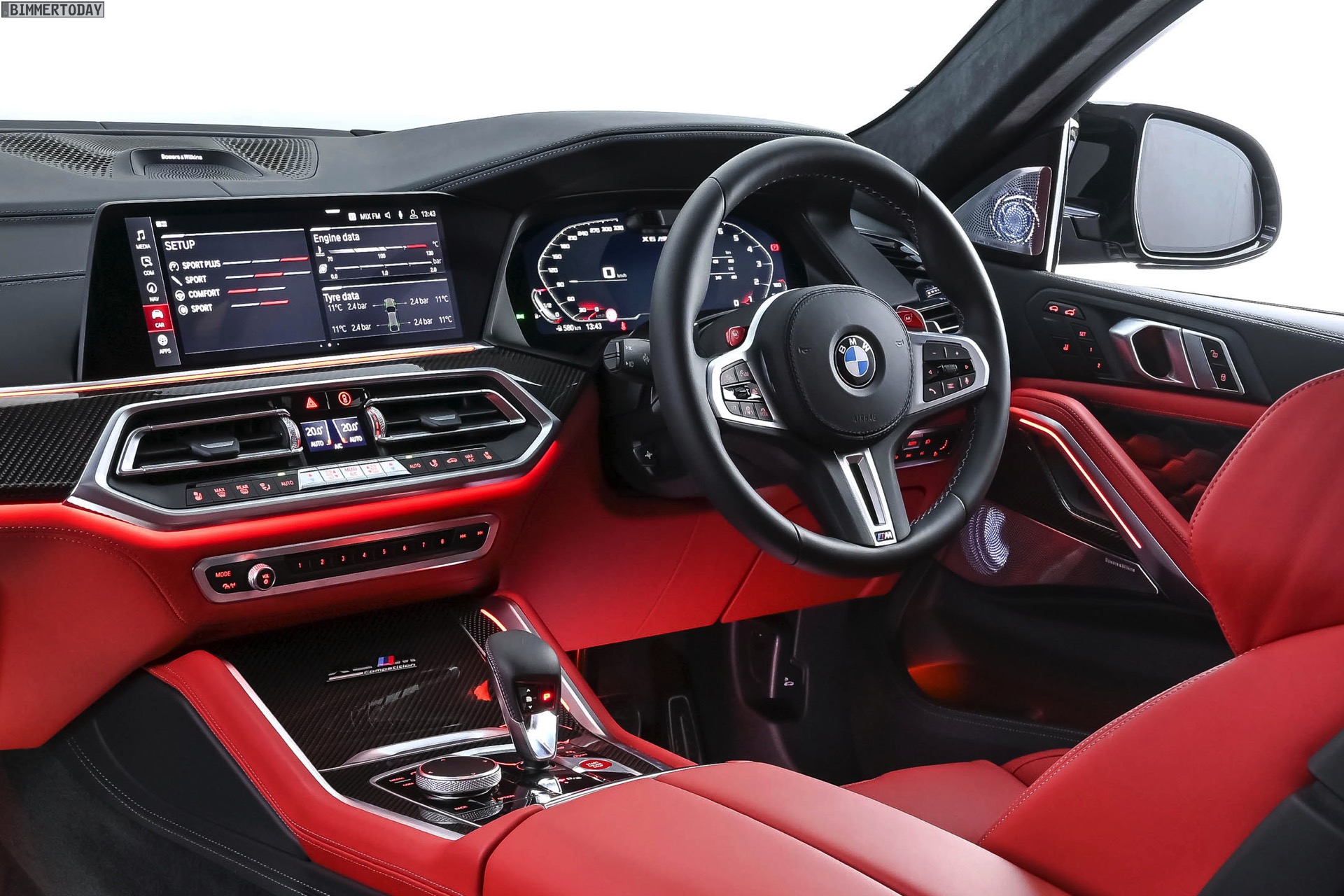 Im starken Kontrast zum schwarzen Äußeren beweist der Innenraum des gezeigten BMW X6 M Competition jede Menge Mut zur Farbe: Die Bicolor-Lederausstattung Vollleder Merino Feinnarbe in Sakhir Orange und Schwarz zählt zweifellos zu den auffälligeren Optionen für das Interieur des Power-SUV. Perfekt zur Lederfarbe passen der rote Startknopf und die ebenfalls in leuchtendem Rot lackierten M1- und M2-Knöpfe am Lenkrad, dank derer sich zwei individuell konfigurierbare Setups für Fahrwerk, Lenkung, Motor und DSC immer in Reichweite befinden.