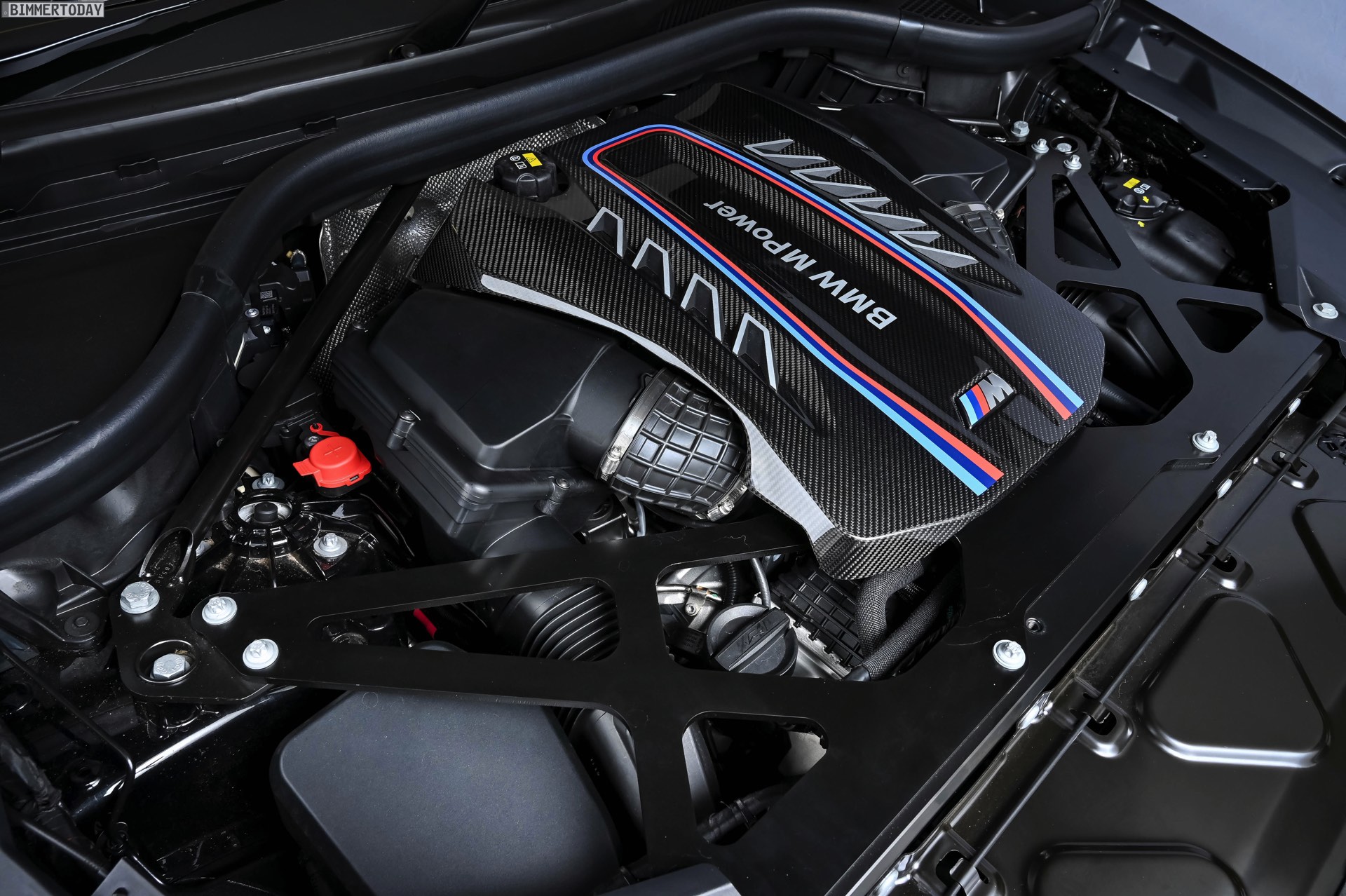Für helle Akzente sorgen in dieser Konfiguration nur noch die Scheinwerfer, die Kennzeichen und die silbern glänzende Oberfläche der vorn 21 und hinten sogar 22 Zoll großen Leichtmetallräder vom Typ Sternspeiche 818 M Bicolor. Je nach Lichteinfall schimmern außerdem die mächtigen Kühler durch die riesigen Öffnungen der Frontschürze, denn der Antrieb des BMW X6 M Competition verlangt nach reichlich Kühlluft – kein Wunder beim Blick auf die technischen Daten, in denen von 625 PS und 750 Newtonmeter Drehmoment die Rede ist.