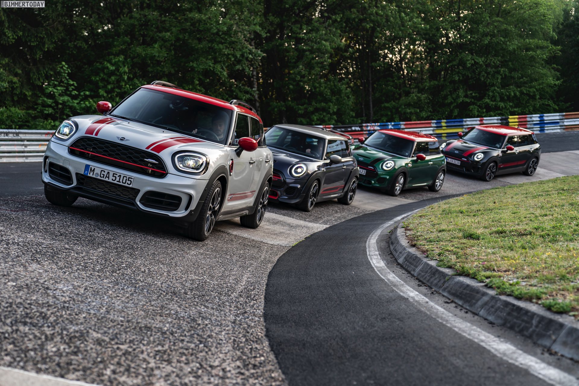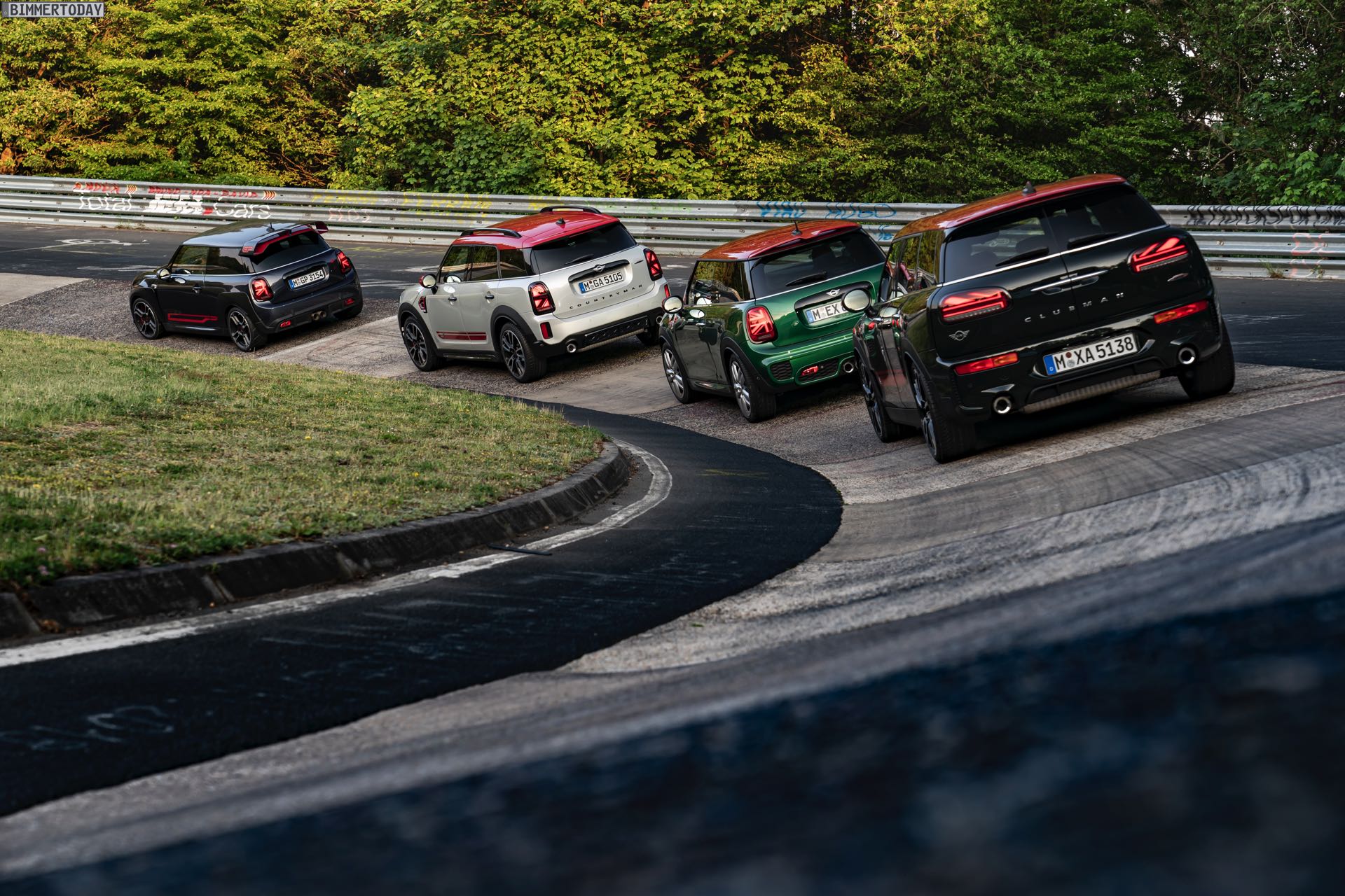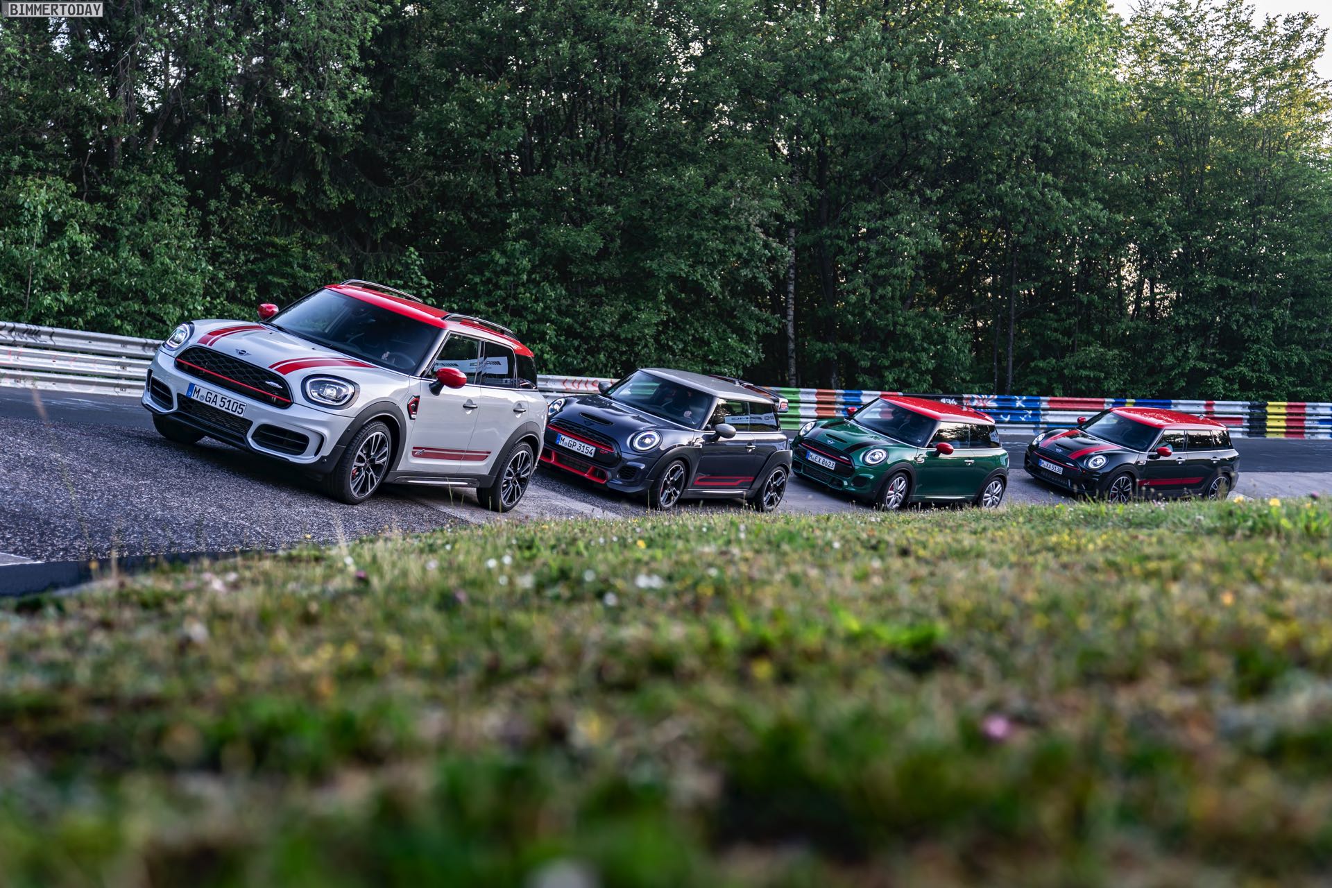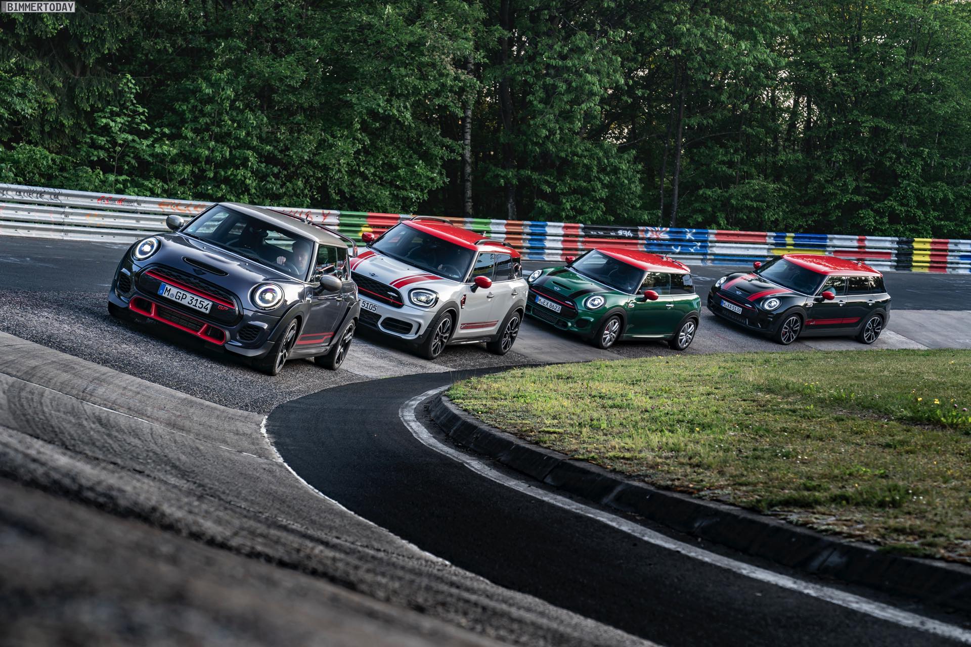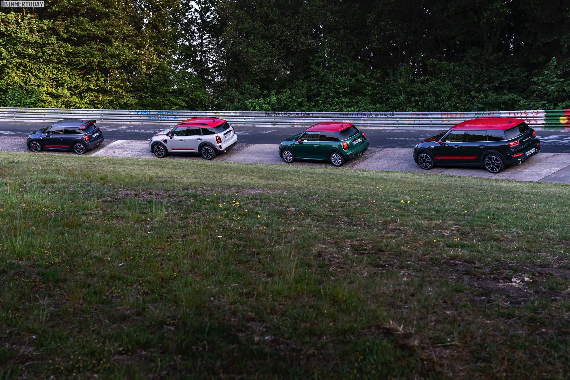 Die Anwesenheit des frisch überarbeiteten Countryman wurde offenbar auch für einige Familien-Fotos genutzt, die gleich vier Mitglieder der aktuellen MINI JCW-Palette auf der Nürburgring Nordschleife zeigen. Neben dem City-SUV sehen wir dabei auch den MINI JCW Hatch, den MINI JCW Clubman und das limitierte Topmodell MINI JCW GP:
