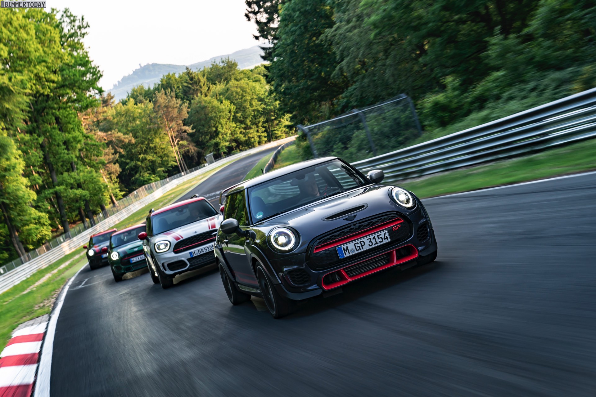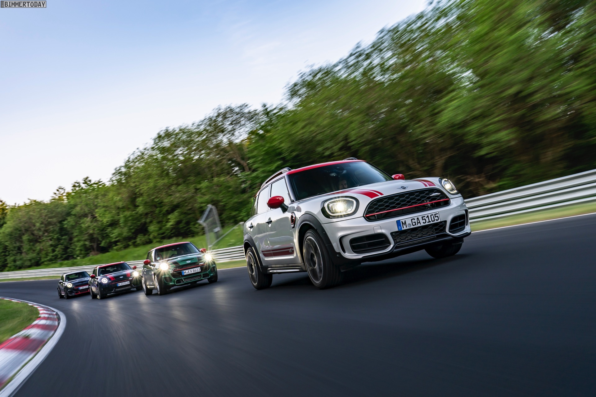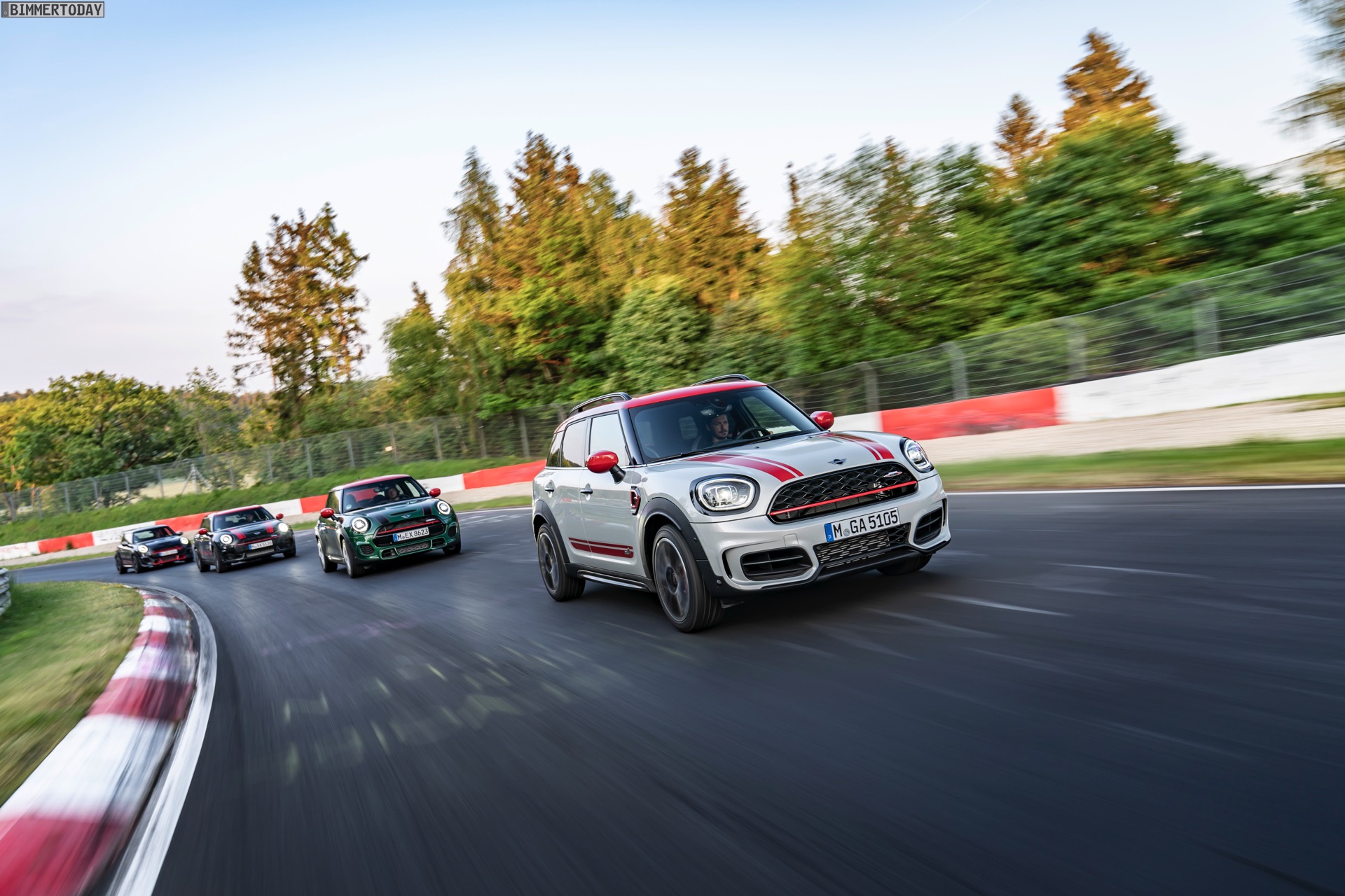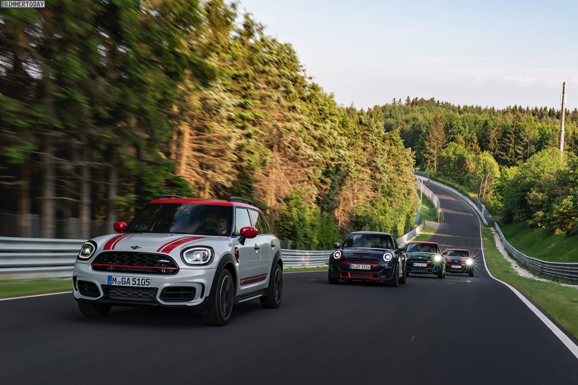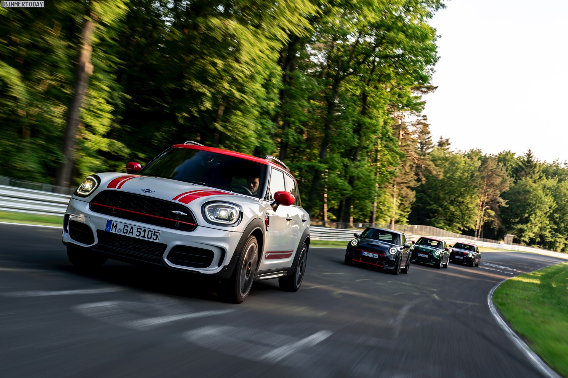 Die Anwesenheit des frisch überarbeiteten Countryman wurde offenbar auch für einige Familien-Fotos genutzt, die gleich vier Mitglieder der aktuellen MINI JCW-Palette auf der Nürburgring Nordschleife zeigen. Neben dem City-SUV sehen wir dabei auch den MINI JCW Hatch, den MINI JCW Clubman und das limitierte Topmodell MINI JCW GP: