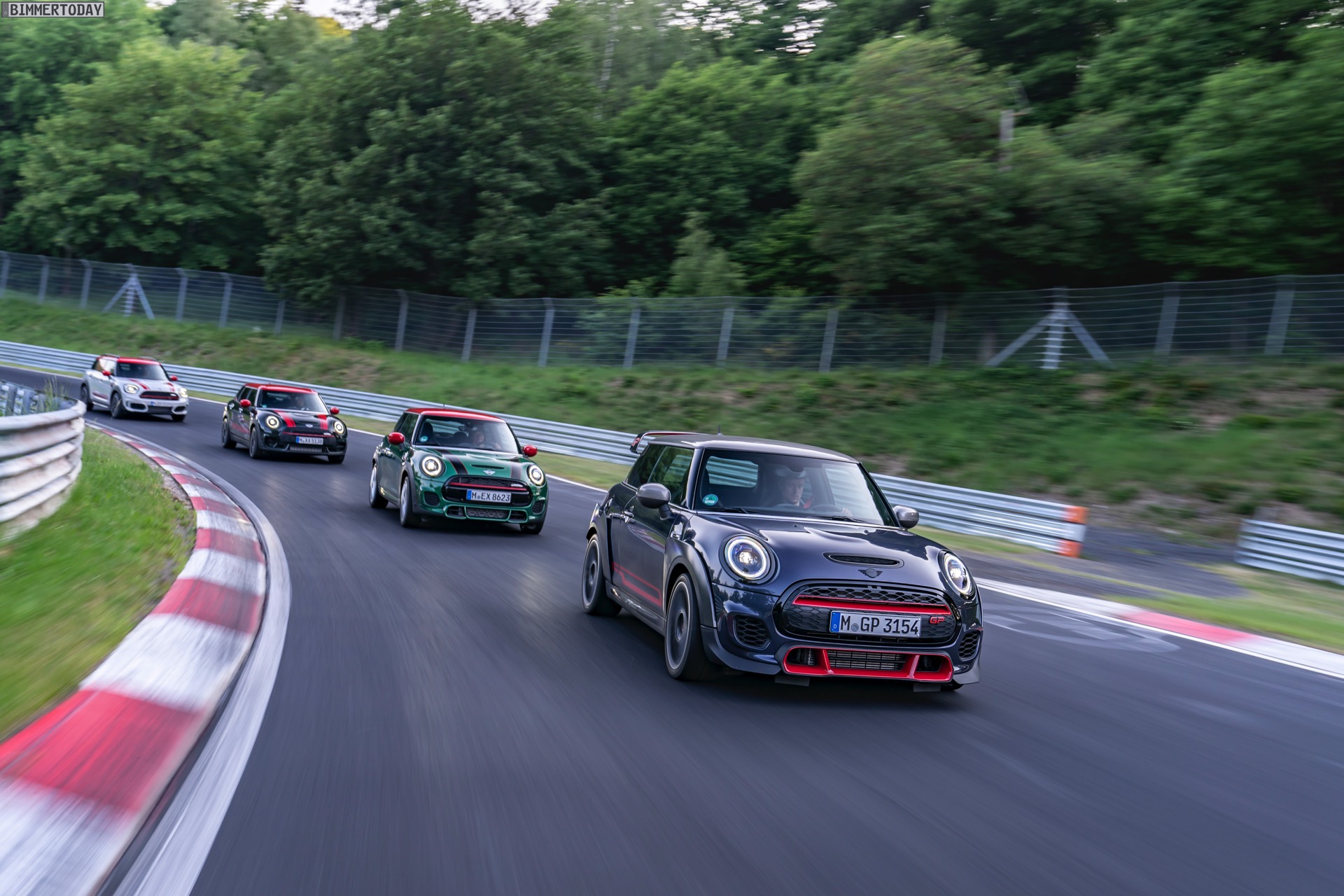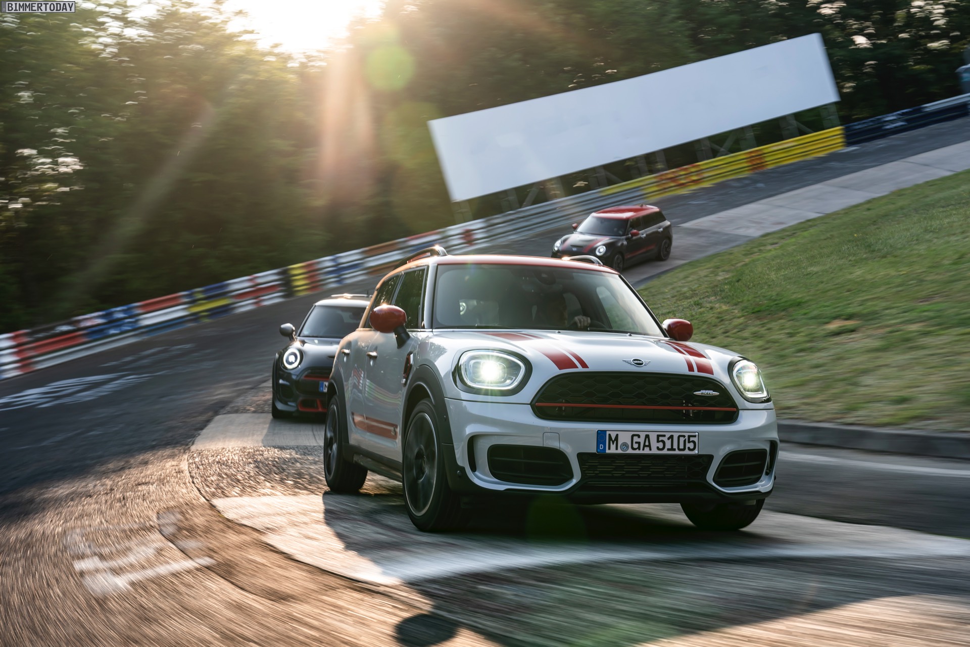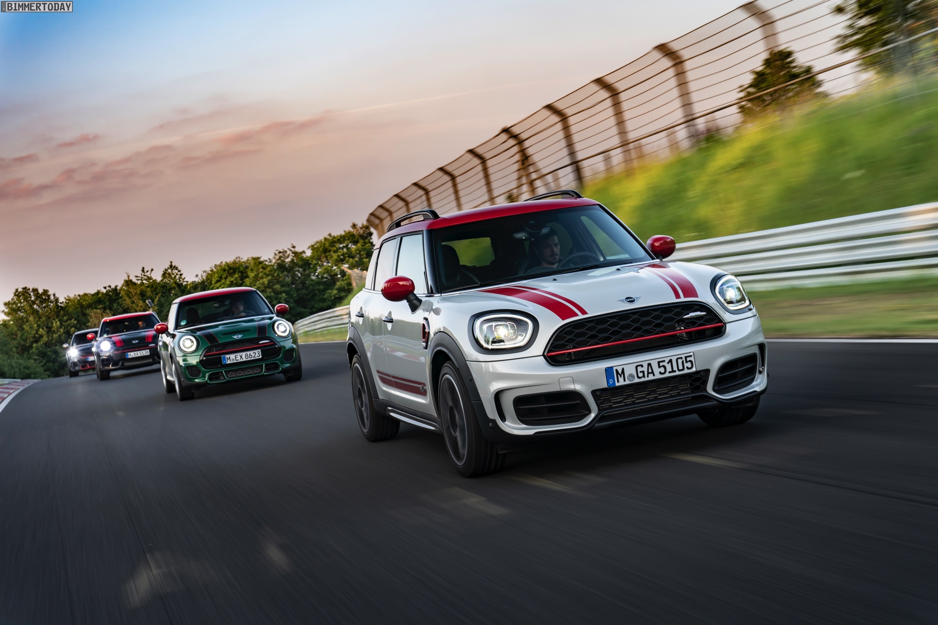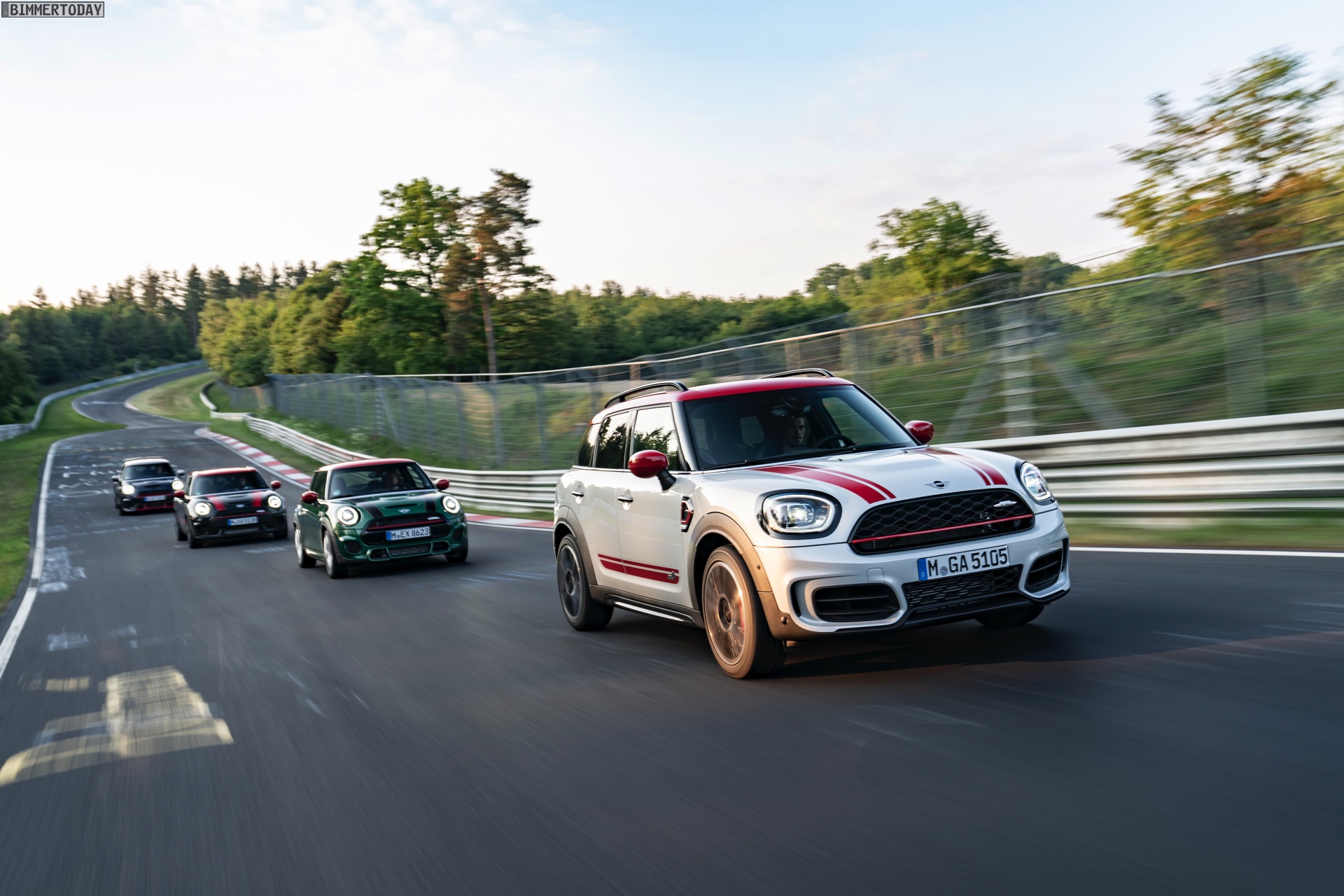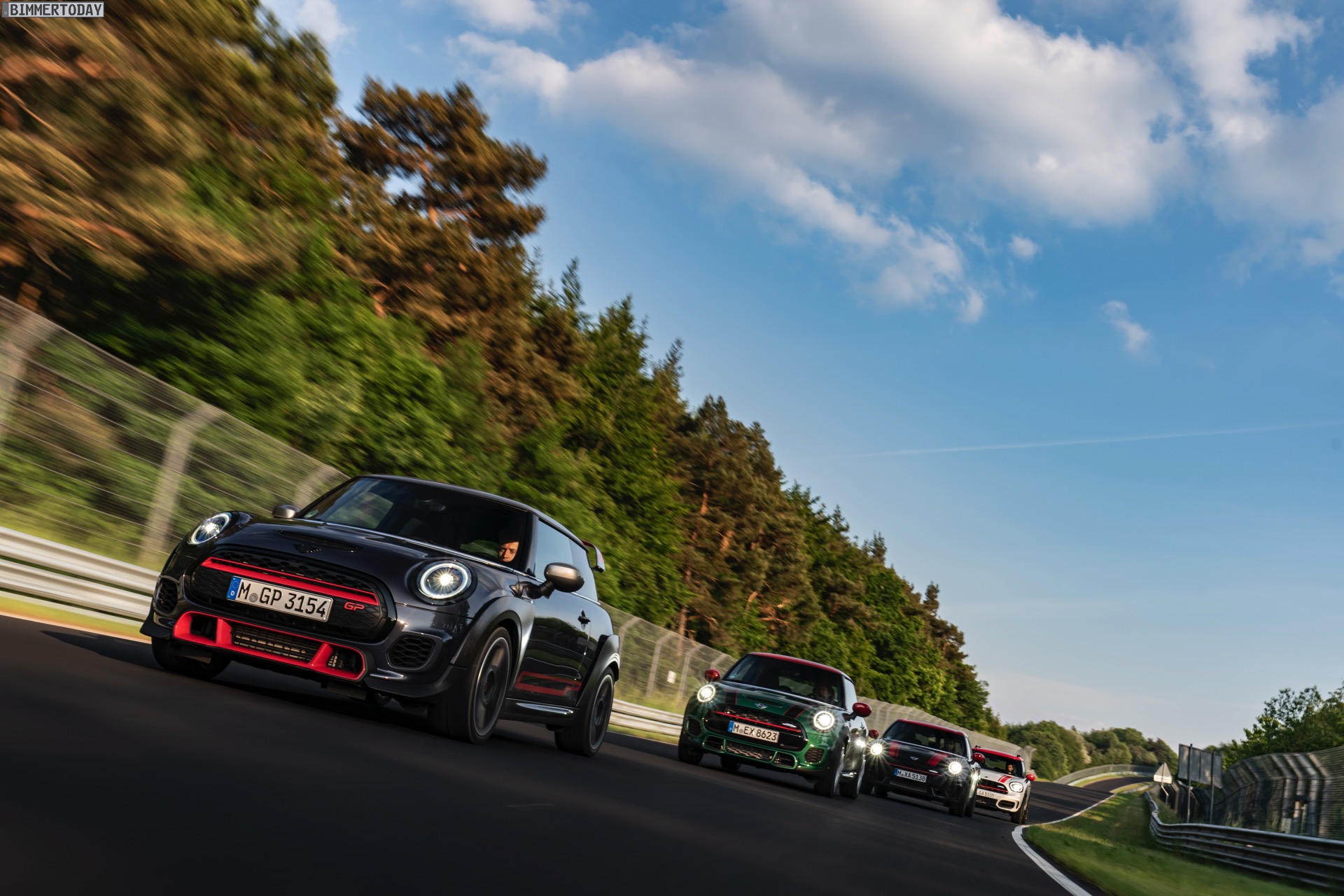 Die Anwesenheit des frisch überarbeiteten Countryman wurde offenbar auch für einige Familien-Fotos genutzt, die gleich vier Mitglieder der aktuellen MINI JCW-Palette auf der Nürburgring Nordschleife zeigen. Neben dem City-SUV sehen wir dabei auch den MINI JCW Hatch, den MINI JCW Clubman und das limitierte Topmodell MINI JCW GP: