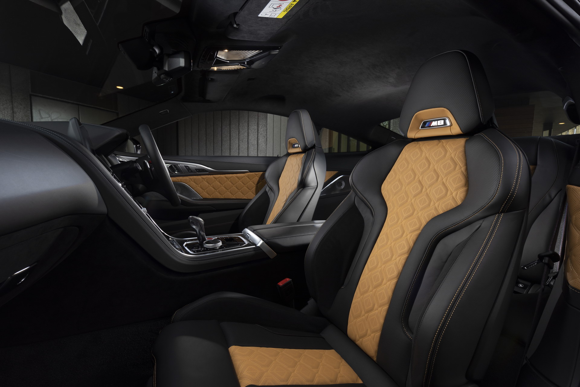 Im Innenraum des Rechtslenkers für den australischen Markt sehen wir die Bicolor-Ausführung der Vollleder-Alcantara-Kombination in Schwarz und Midrand Beige sowie die ebenfalls schon im Grundpreis enthaltenen Interieurleisten Carbon Fibre: