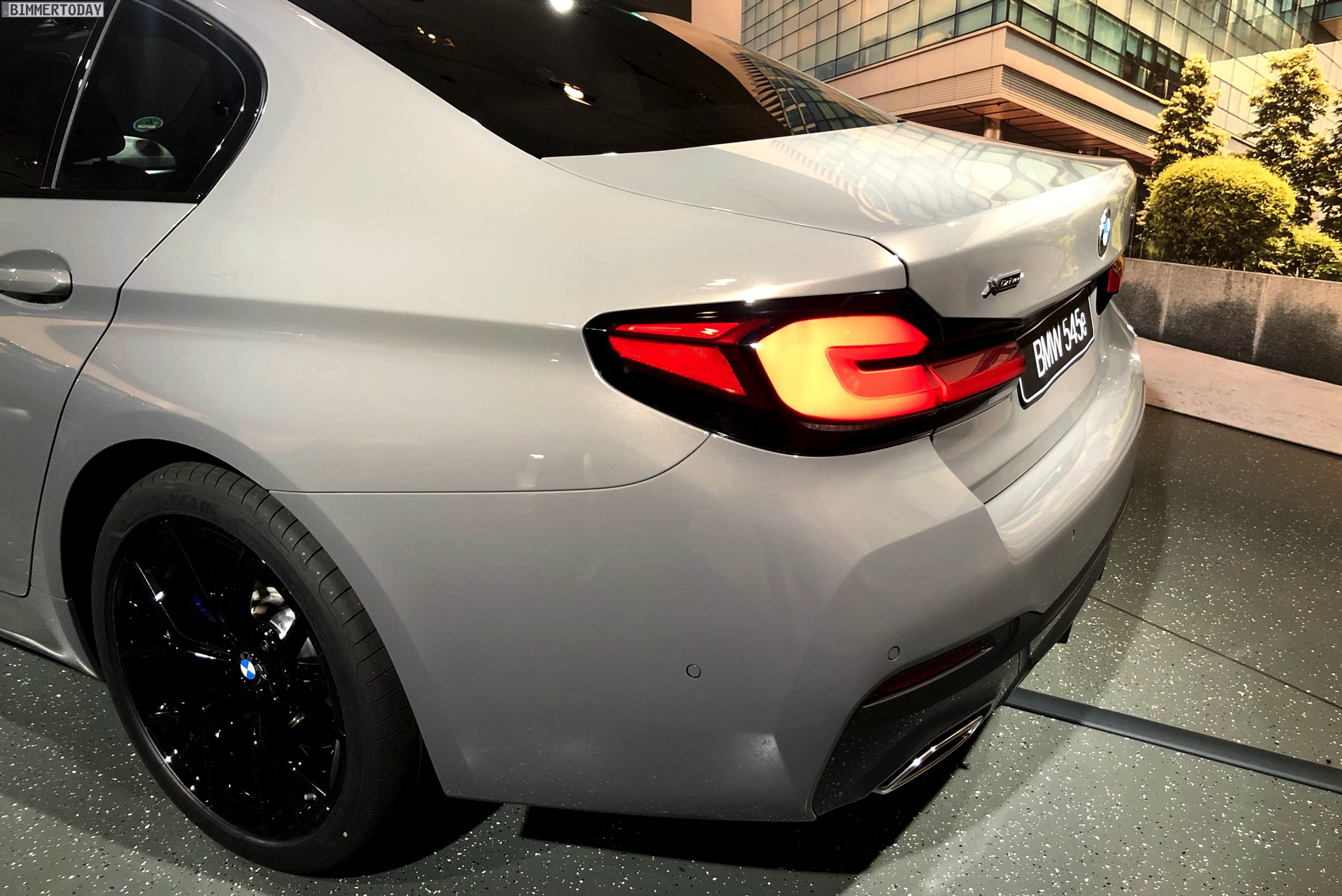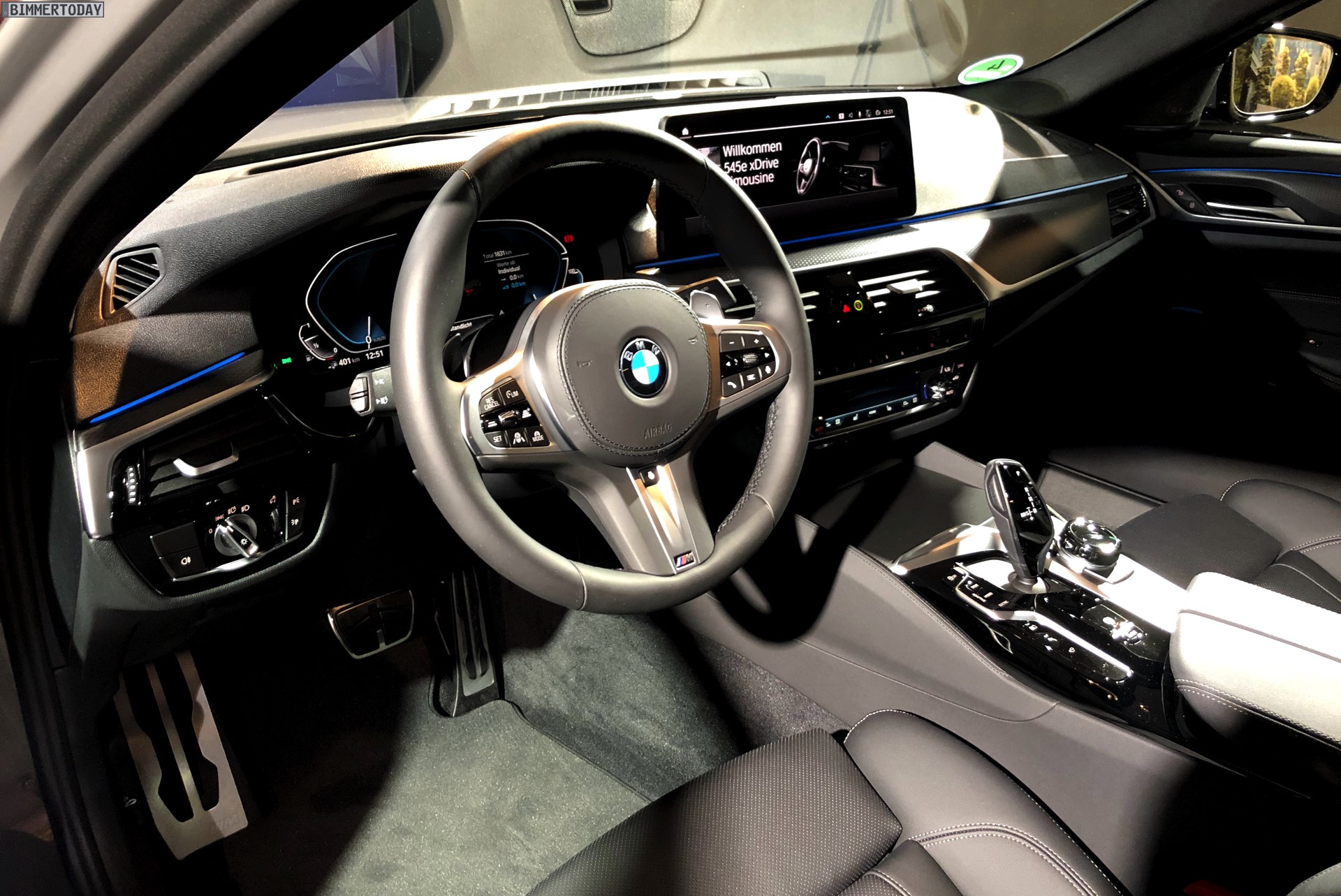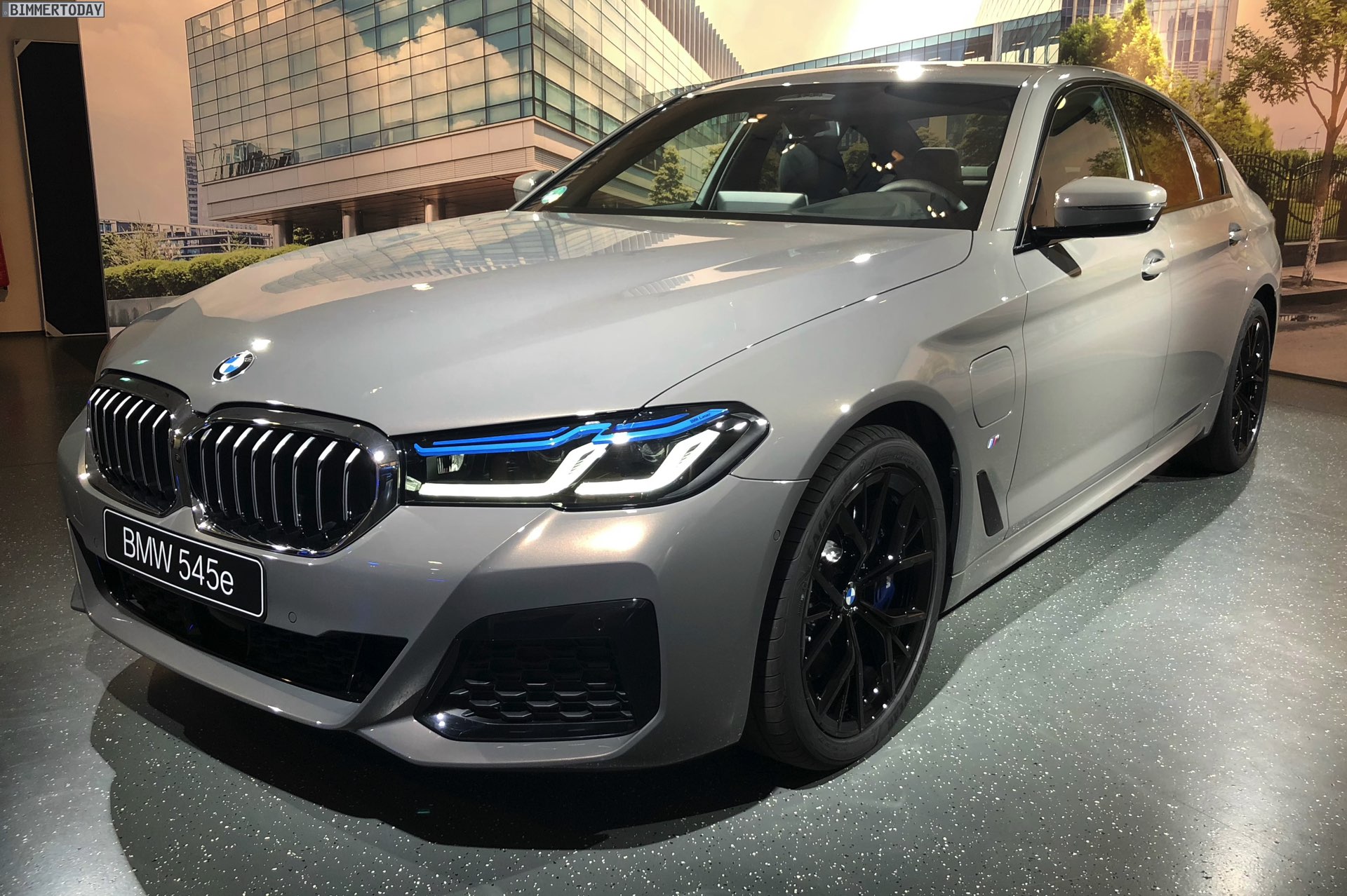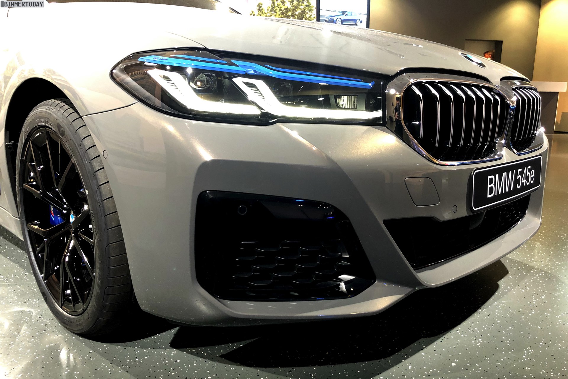 Ein unübersehbares Detail des gezeigten BMW 545e sind die blauen “Augenbrauen” der optionalen Laser-Scheinwerfer. Während die futuristische Lichttechnik bisher relativ dezent blieb, weisen die Münchner ab dem BMW 5er Facelift 2020 sehr offensiv auf die Hightech-Scheinwerfer hin. Noch offensiver wird der Look mit den hier gezeigten Shadow Line Leuchten, die über einen zusätzlichen zweiten Einleger in leuchtendem Blau verfügen.