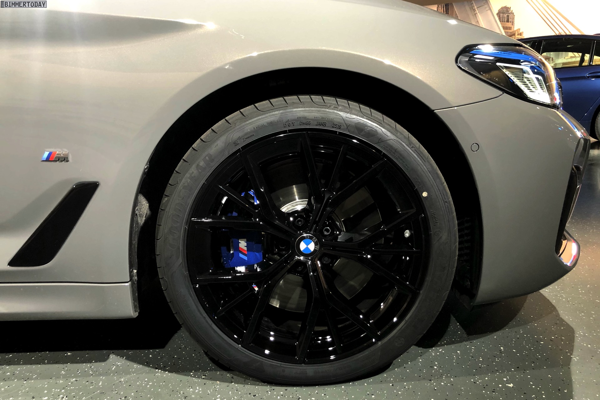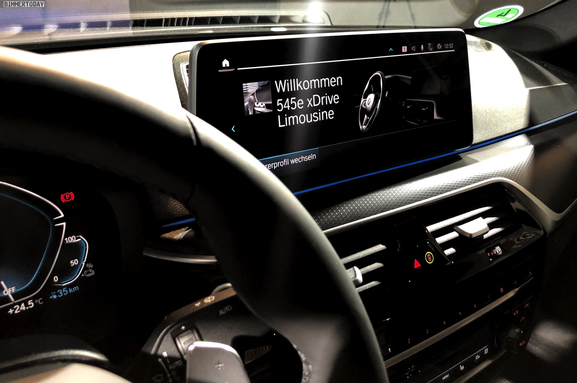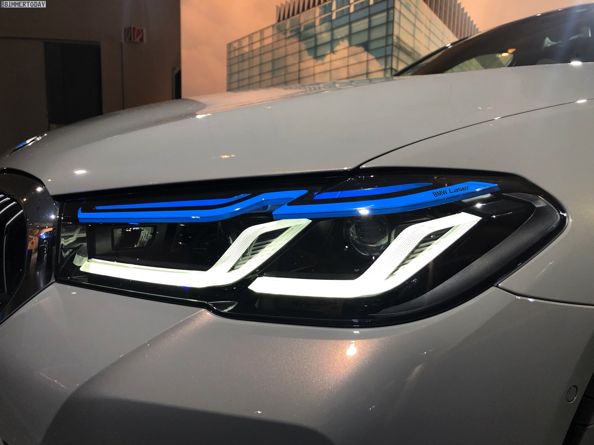Ein unübersehbares Detail des gezeigten BMW 545e sind die blauen “Augenbrauen” der optionalen Laser-Scheinwerfer. Während die futuristische Lichttechnik bisher relativ dezent blieb, weisen die Münchner ab dem BMW 5er Facelift 2020 sehr offensiv auf die Hightech-Scheinwerfer hin. Noch offensiver wird der Look mit den hier gezeigten Shadow Line Leuchten, die über einen zusätzlichen zweiten Einleger in leuchtendem Blau verfügen.