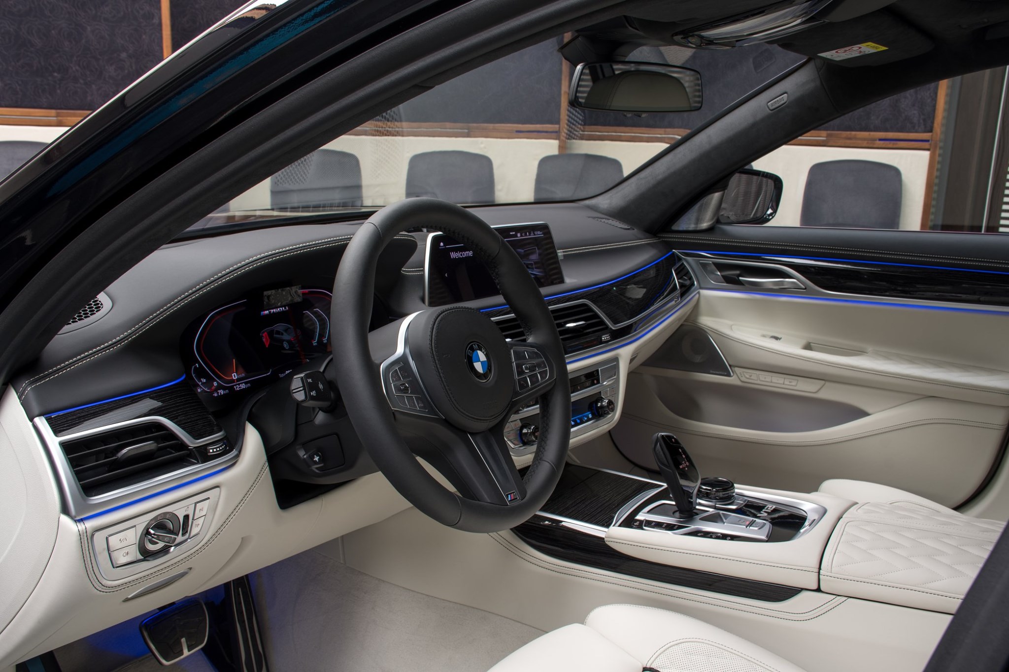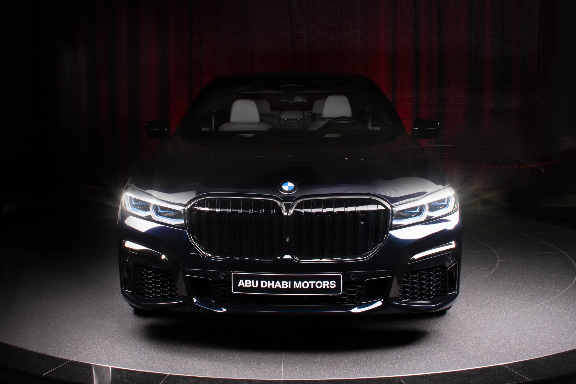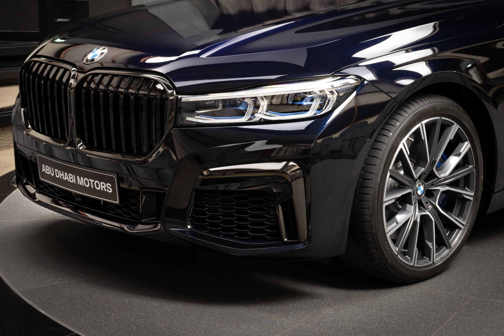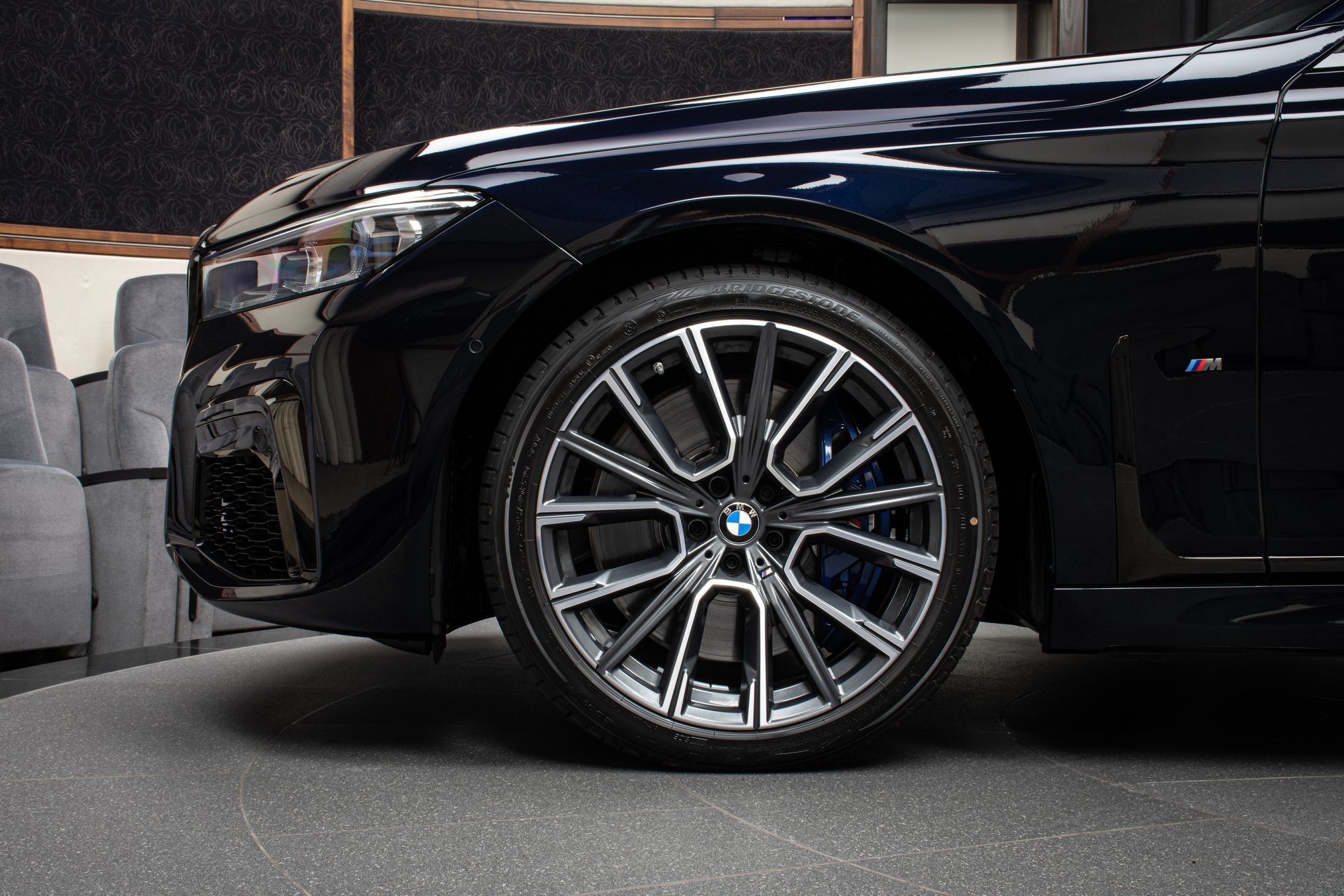 Der nach dem tiefblauen und je nach Lichteinfall beinahe schwarzen Mineral Azurit benannte Farbton lässt die Luxus-Limousine extrem elegant und edel wirken, obwohl der V12-7er dank Wahl der Shadow Line mit erweiterten Umfängen praktisch komplett auf glänzendes Chrom verzichtet. Die seit dem BMW 7er Facelift 2019 dominante Doppel-Niere fällt dank schwarzer Einfassung wesentlich weniger ins Auge als in ihrer serienmäßig verchromten Form, auch die seitlichen Zierleisten setzen sich mit ihren Oberflächen in Hochglanz-Schwarz kaum von der Lackierung in Azuritschwarz ab. Für die einzigen hellen Akzente am gezeigten Fahrzeug sorgen neben Scheinwerfern und Rückleuchten die V12-Schriftzüge auf den C-Säulen und die Aluminium-Oberflächen der 20 Zoll großen M Leichtmetallräder Sternspeiche 817 Bicolor.