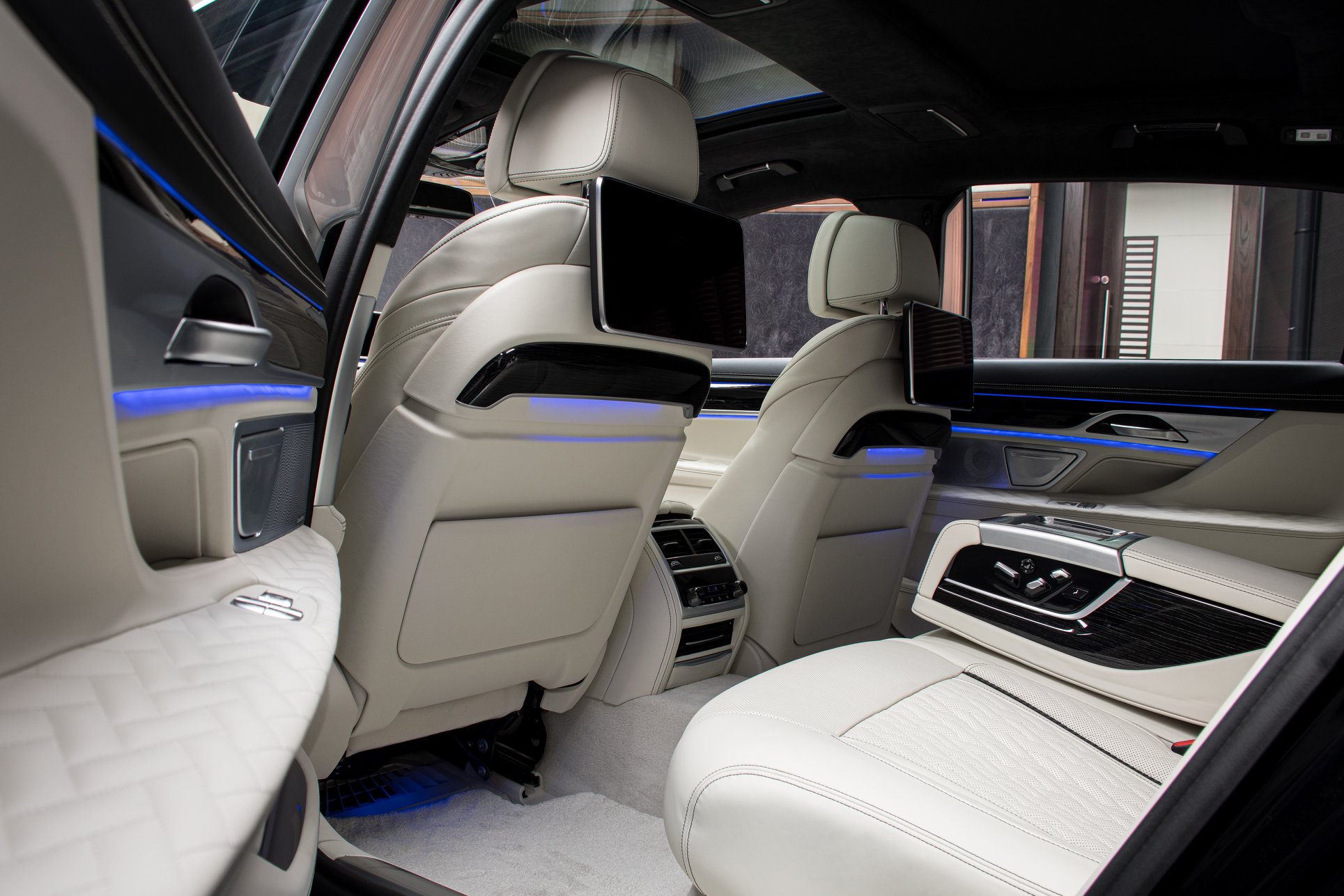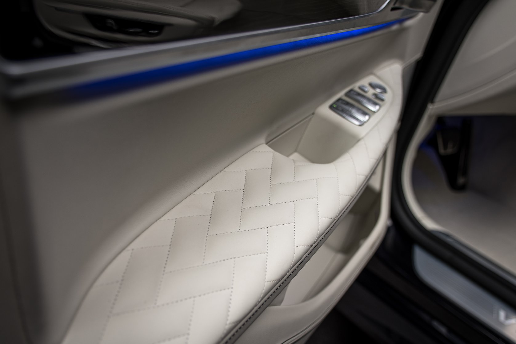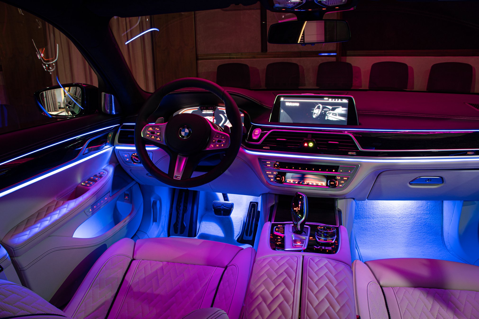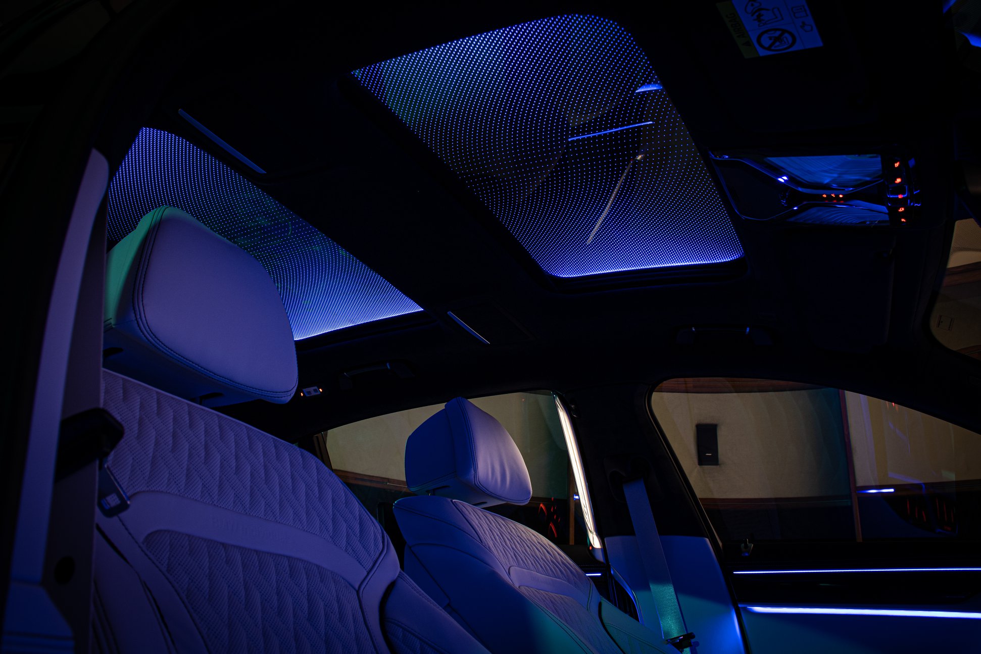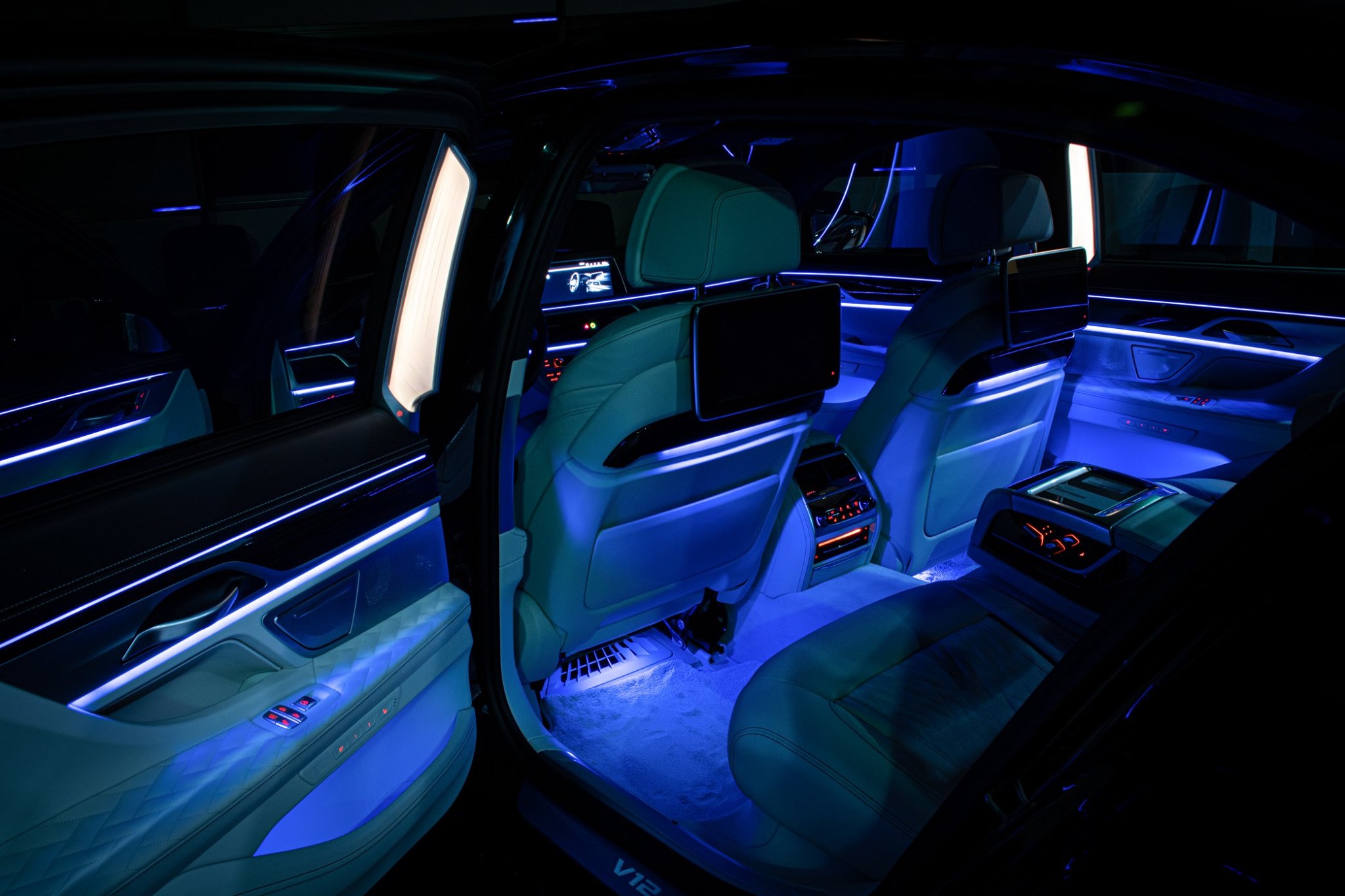 Doch nicht nur unter der Motorhaube und bei der Azuritschwarz lackierten Außenhaut geht es ausgesprochen edel zu, auch im Innenraum hat der gezeigte BMW 7er G12 LCI einiges zu bieten: Die BMW Individual Volllederausstattung Merino Feinnarbe in Rauchweiß lässt sich dank großem Panorama-Glasdach mit beleuchtetem Sky-Lounge-Effekt besonders gut genießen. Auf den Fotos sehen wir außerdem verschiedene Farb-Inszenierungen des Ambientelichts, mit dem sich der Innenraum des 7ers je nach Stimmung und Vorlieben völlig unterschiedlich einfärben lässt.