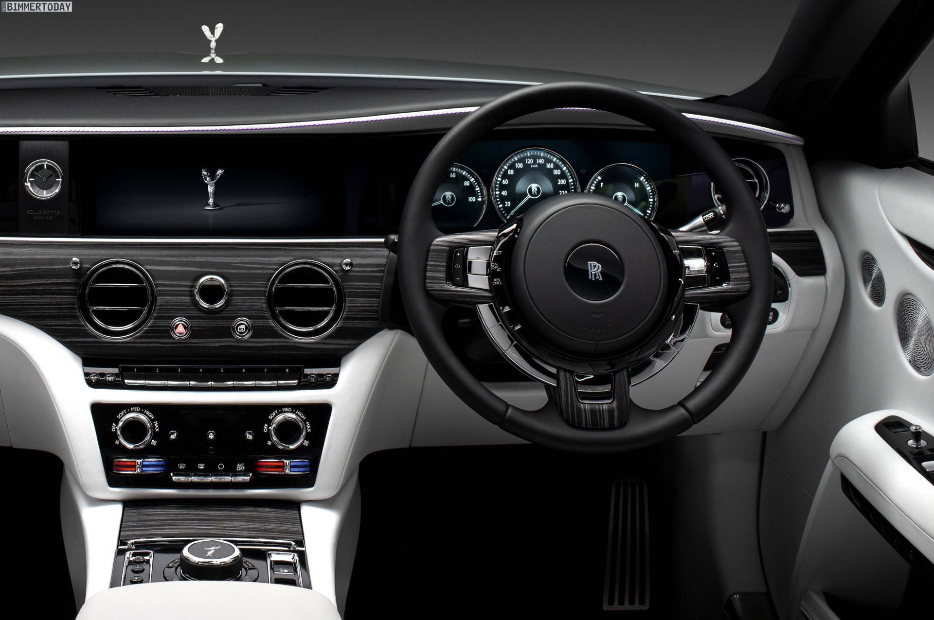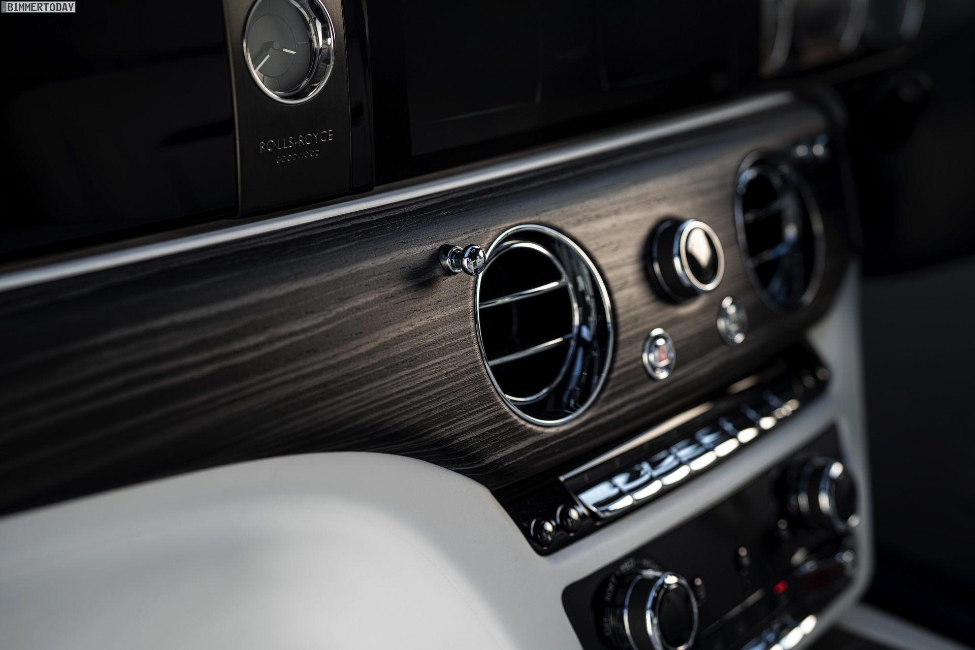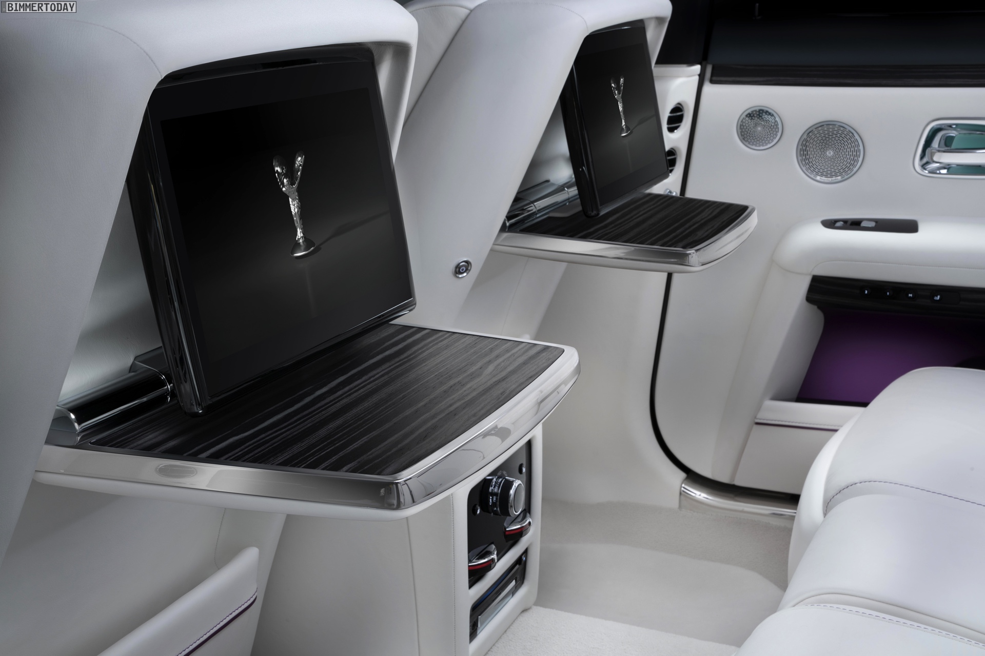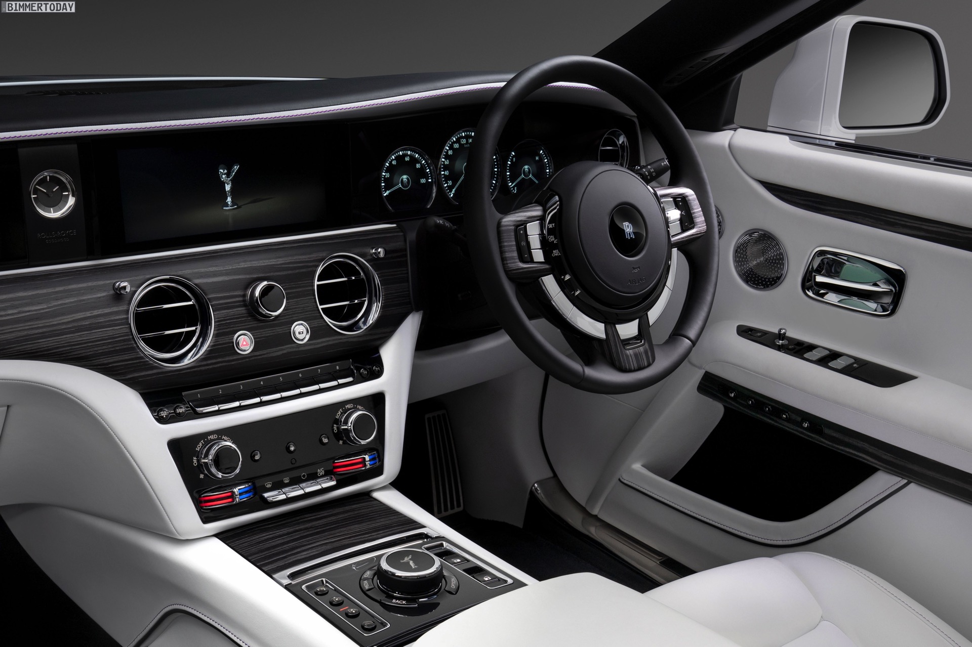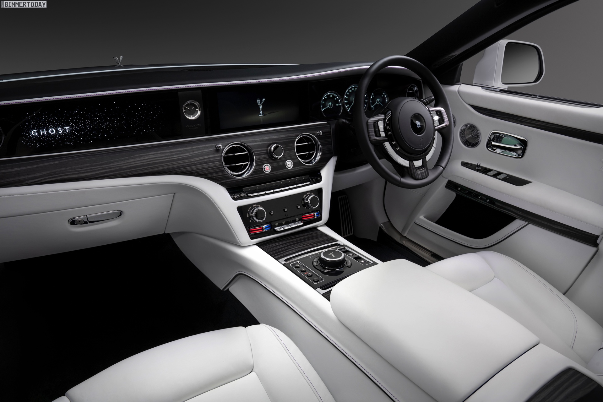 Mindestens so wichtig wie das Exterieur-Design und die Technik des Rolls-Royce Ghost ist das Interieur, schließlich lässt sich das Ergebnis aller Mühen nur hier erleben. Um den Ein- und Ausstieg noch bequemer zu gestalten, schließen sich die weiterhin an A- und C-Säule montierten Türen nicht nur vollelektrisch, sie lassen sich erstmals auch auf Knopfdruck öffnen. Eine komplexe Sensorik stellt dabei sicher, dass die Türen auch auf schrägem Untergrund immer in der gewohnten Geschwindigkeit öffnen und schließen. Extrem gründliche Innenraum-Luftfilter mit Nanofaser-Technologie, beleuchtete Interieurleisten und viele weitere Details machen auf jeder Fahrt klar, wie weit der neue Ghost von automobiler Normalität entfernt ist.