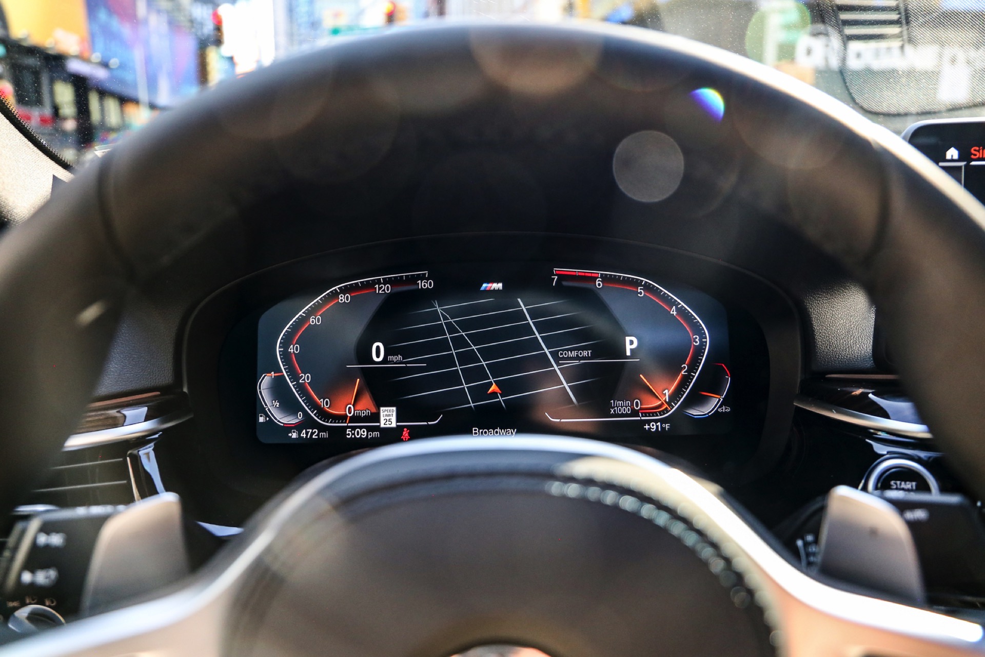 Auch im wuseligen Umfeld von New York City hat das BMW 5er Facelift 2020 enorme Präsenz: Einige neue Fotos von BMW of Manhattan zeigen die Business-Limousine aus München als 530i xDrive mit M Sport-Paket und Lackierung in Carbonschwarz Metallic. Das im direkten Sonnenlicht wie ein tiefes Dunkelblau wirkende Schwarz zählt zu den Klassikern im BMW-Programm und ist ausschließlich in Verbindung mit M Paket bestellbar. Zum sportlich-eleganten Auftritt tragen auch die 19 Zoll großen Leichtmetallräder im Design Y-Speiche 845 M Bicolor bei, hinter denen die seit dem Facelift auch in Rot hochglänzend erhältlichen Bremssättel der M Sportbremse einen farbigen Akzent setzen.