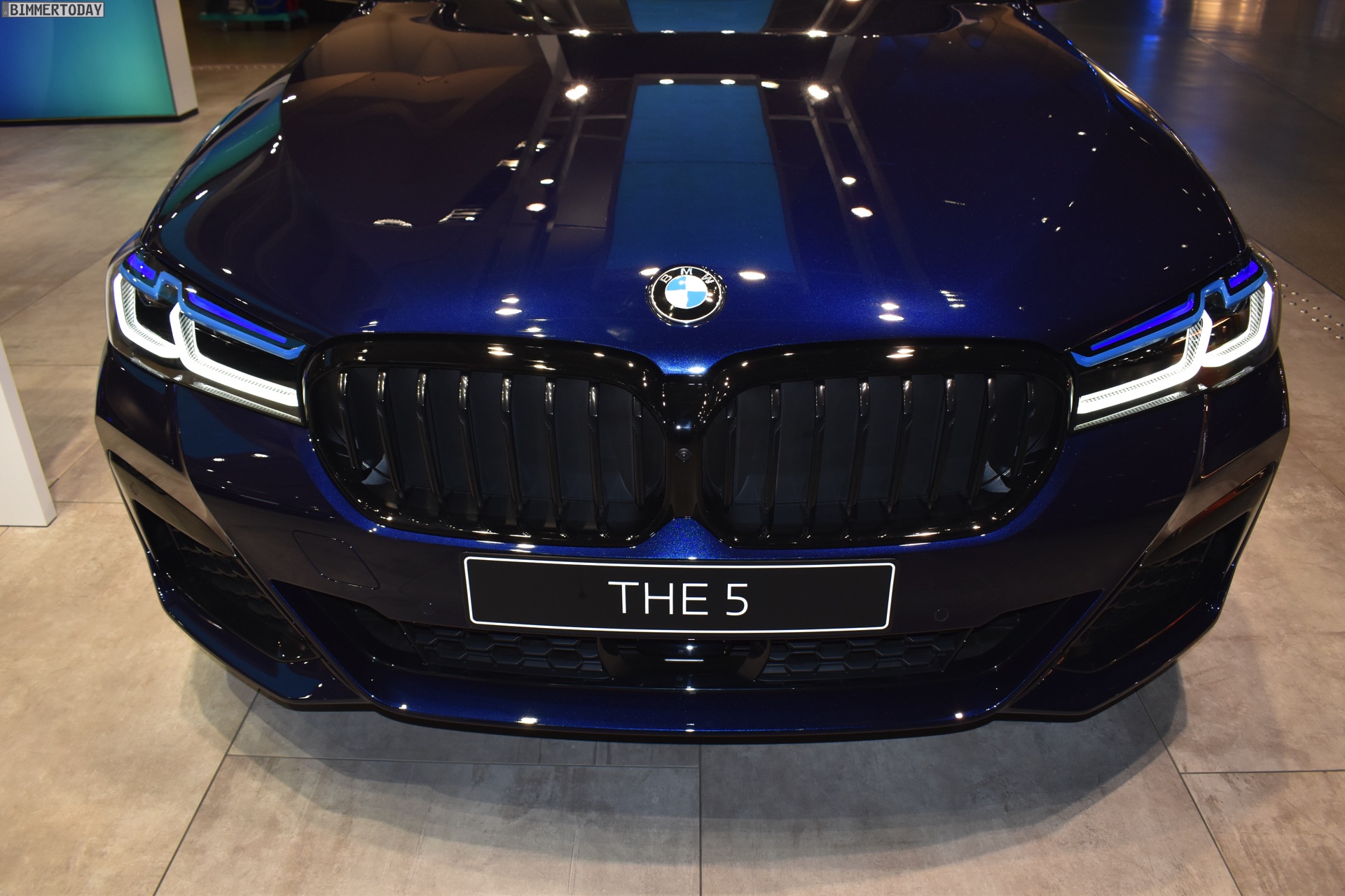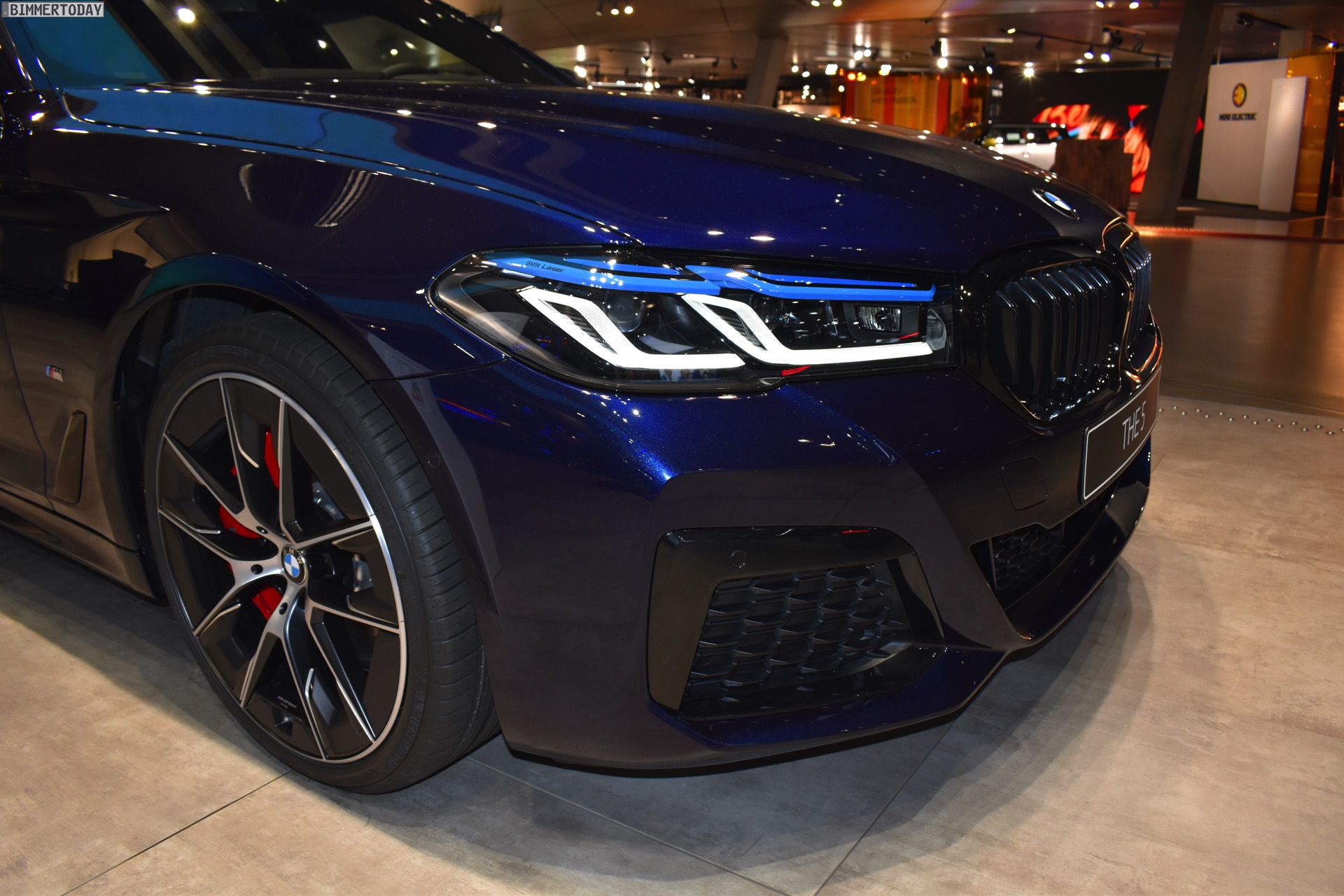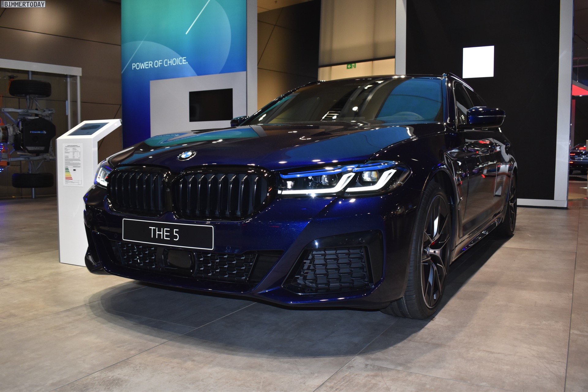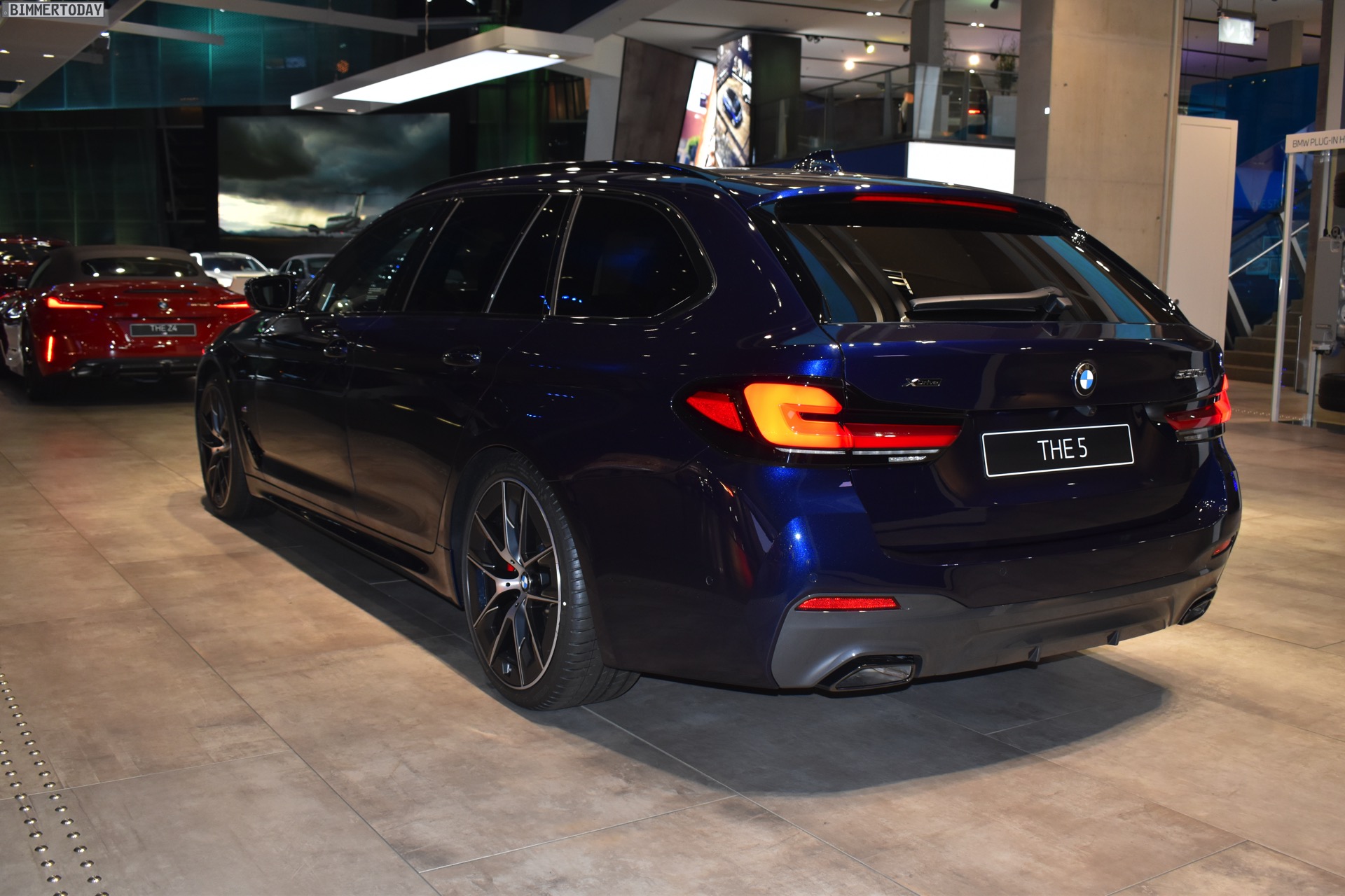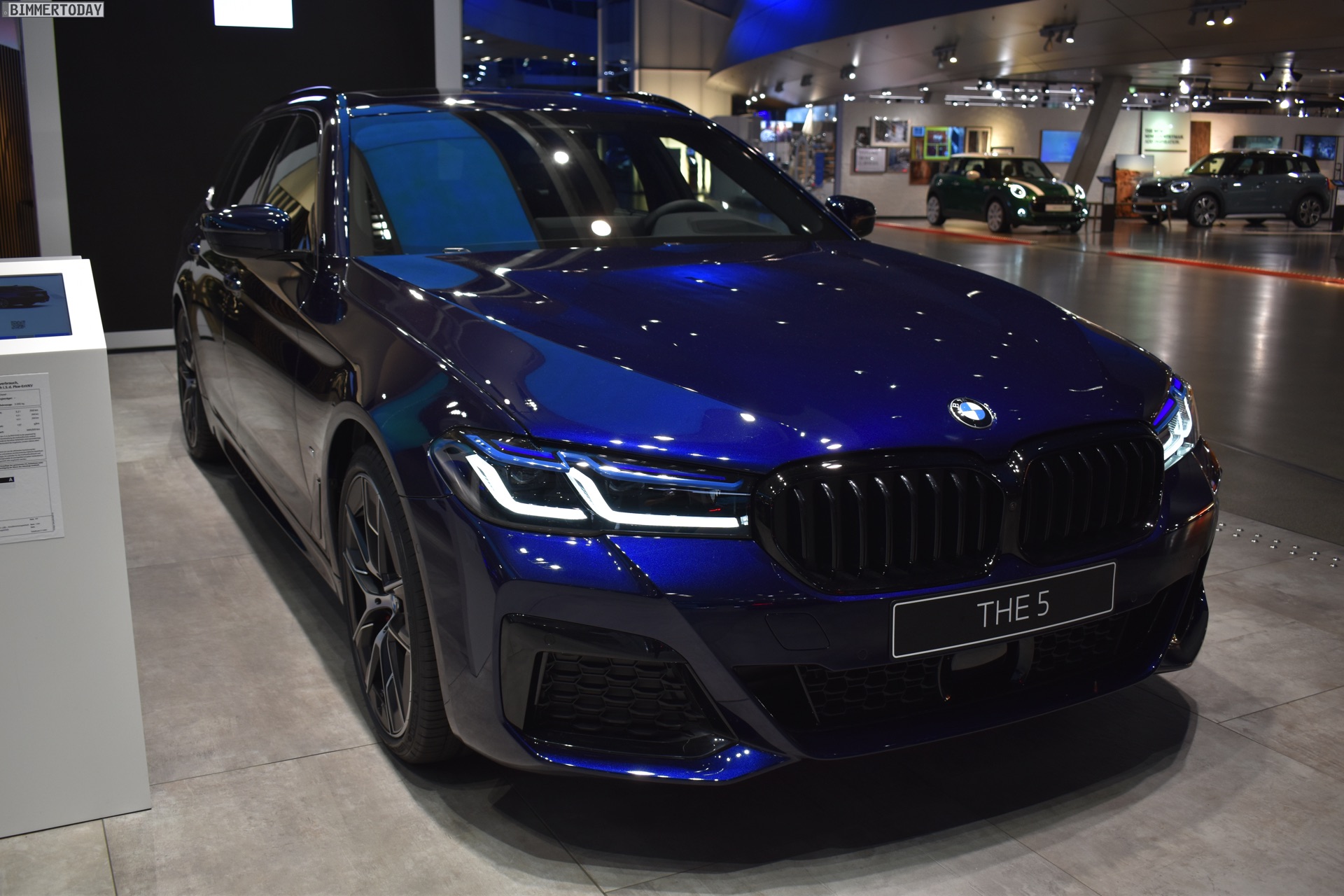 In einer sportlich-eleganten Konfiguration glänzt der neue BMW 5er Touring G31 LCI derzeit in der BMW Welt München. Der jüngst per Facelift aufgewertete Business-Kombi zählt zur limitierten M Sport Edition und trägt deshalb das M Sport-Paket, die Shadow Line mit erweiterten Umfängen und eine Lackierung in Tansanitblau Metallic. Die dank erweiterter Shadow Line in Hochglanz-Schwarz gehaltenen Nieren sind ein absoluter Hingucker und das neue Tagfahrlicht-Design betont die Breite und Aggressivität der Front zusätzlich.