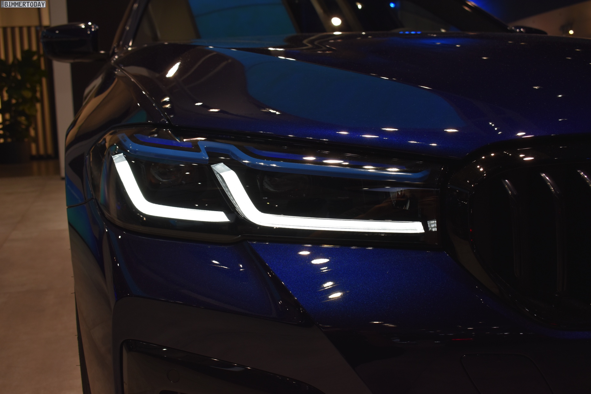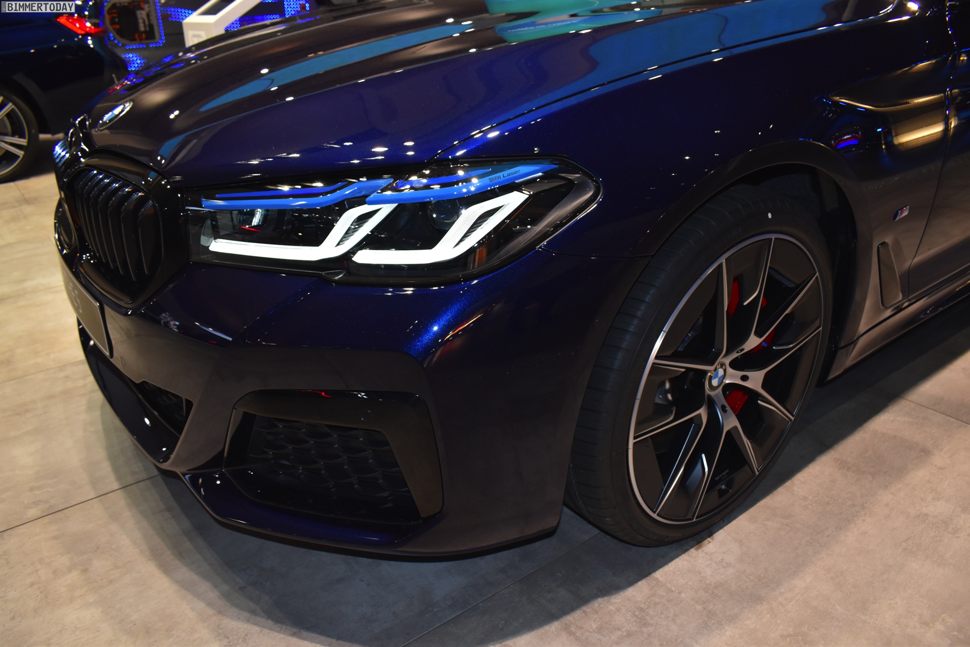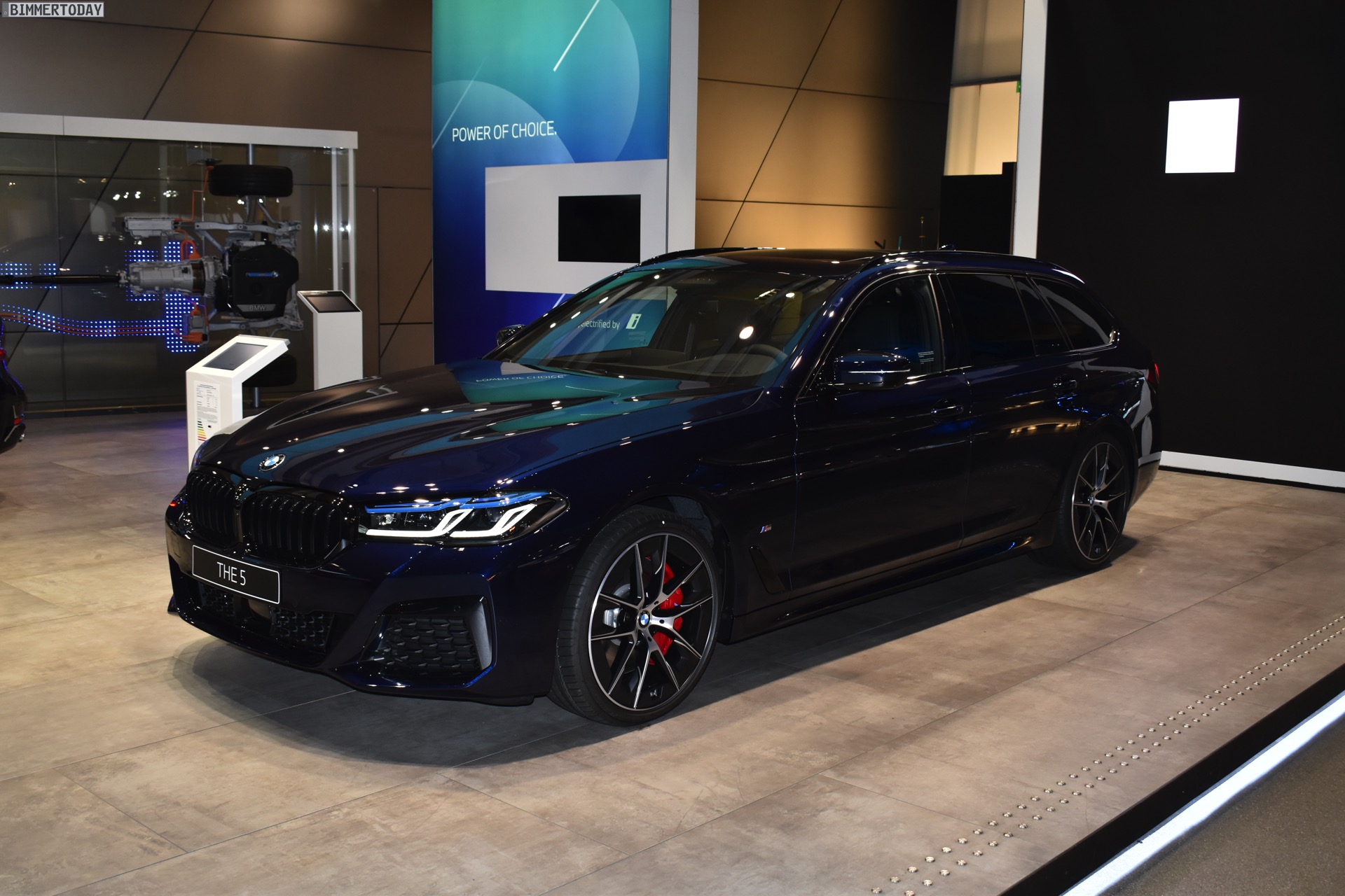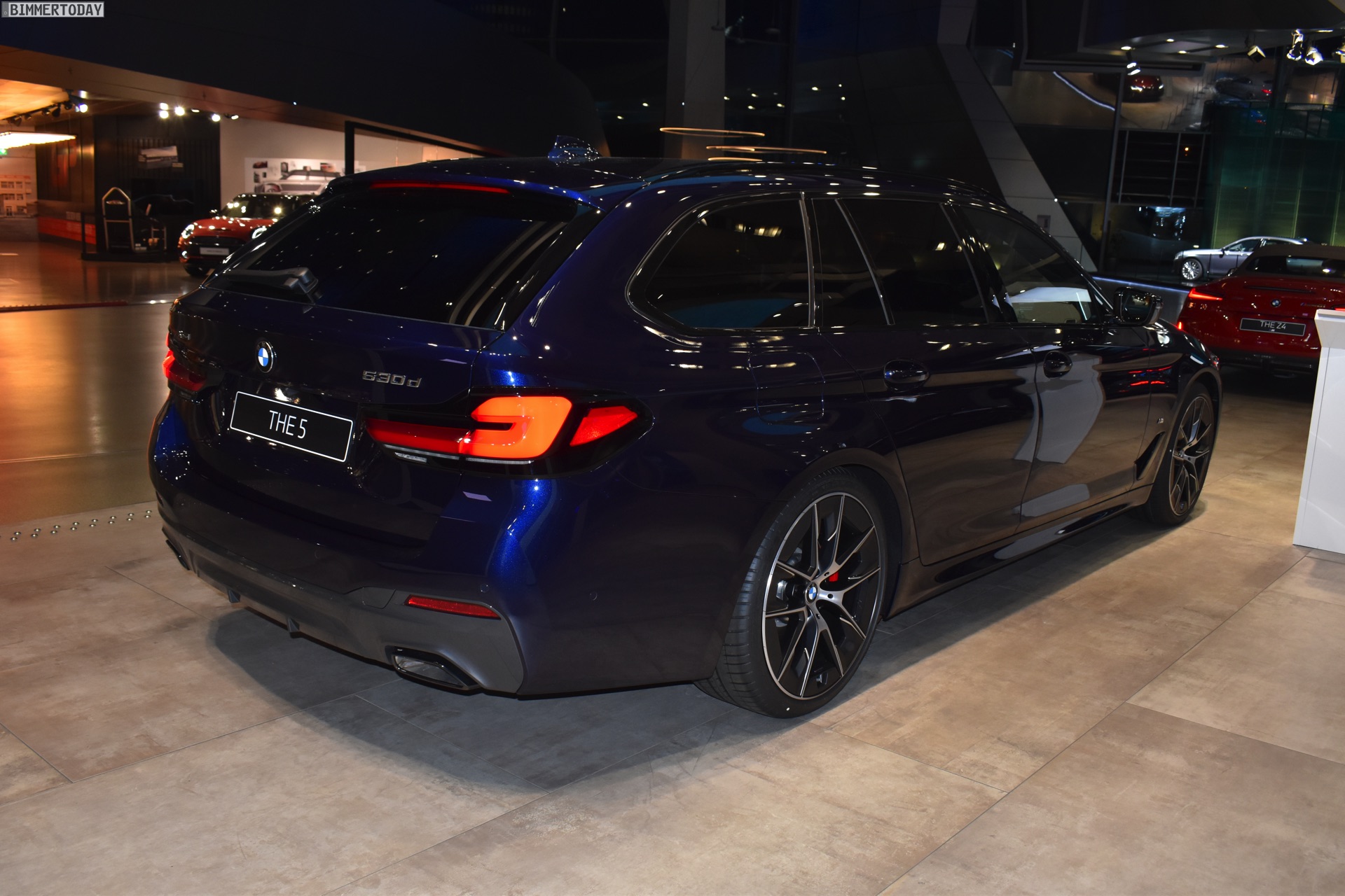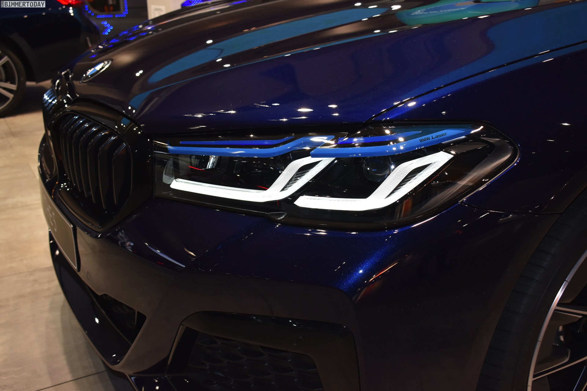 In einer sportlich-eleganten Konfiguration glänzt der neue BMW 5er Touring G31 LCI derzeit in der BMW Welt München. Der jüngst per Facelift aufgewertete Business-Kombi zählt zur limitierten M Sport Edition und trägt deshalb das M Sport-Paket, die Shadow Line mit erweiterten Umfängen und eine Lackierung in Tansanitblau Metallic. Die dank erweiterter Shadow Line in Hochglanz-Schwarz gehaltenen Nieren sind ein absoluter Hingucker und das neue Tagfahrlicht-Design betont die Breite und Aggressivität der Front zusätzlich.