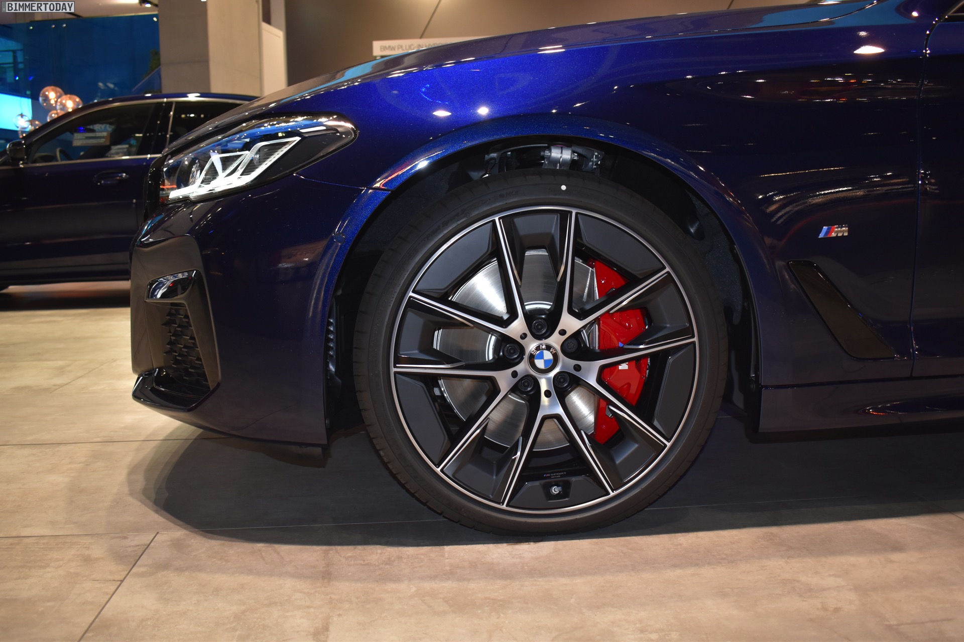 Die Lackierung in tiefem Dunkelblau bringt einen eleganten Touch und lässt den BMW 5er Touring ausgesprochen hochwertig wirken. Eher zufällig aufgegriffen wird der Farbton von den blauen “Augenbrauen” der optionalen Laserlicht-Scheinwerfer, die seit dem Facelift 2020 deutlich stärker in Szene gesetzt werden als zuvor. Bei den Leichtmetallrädern handelt es sich um die 20 Zoll großen M Editionsräder Bicolor Jetblack glanzgedreht, die offenbar auch unter aerodynamischen Gesichtspunkten gestaltet wurden. Dahinter sind die rot hochglänzend lackierten Bremssättel der M Sportbremse erkennbar.