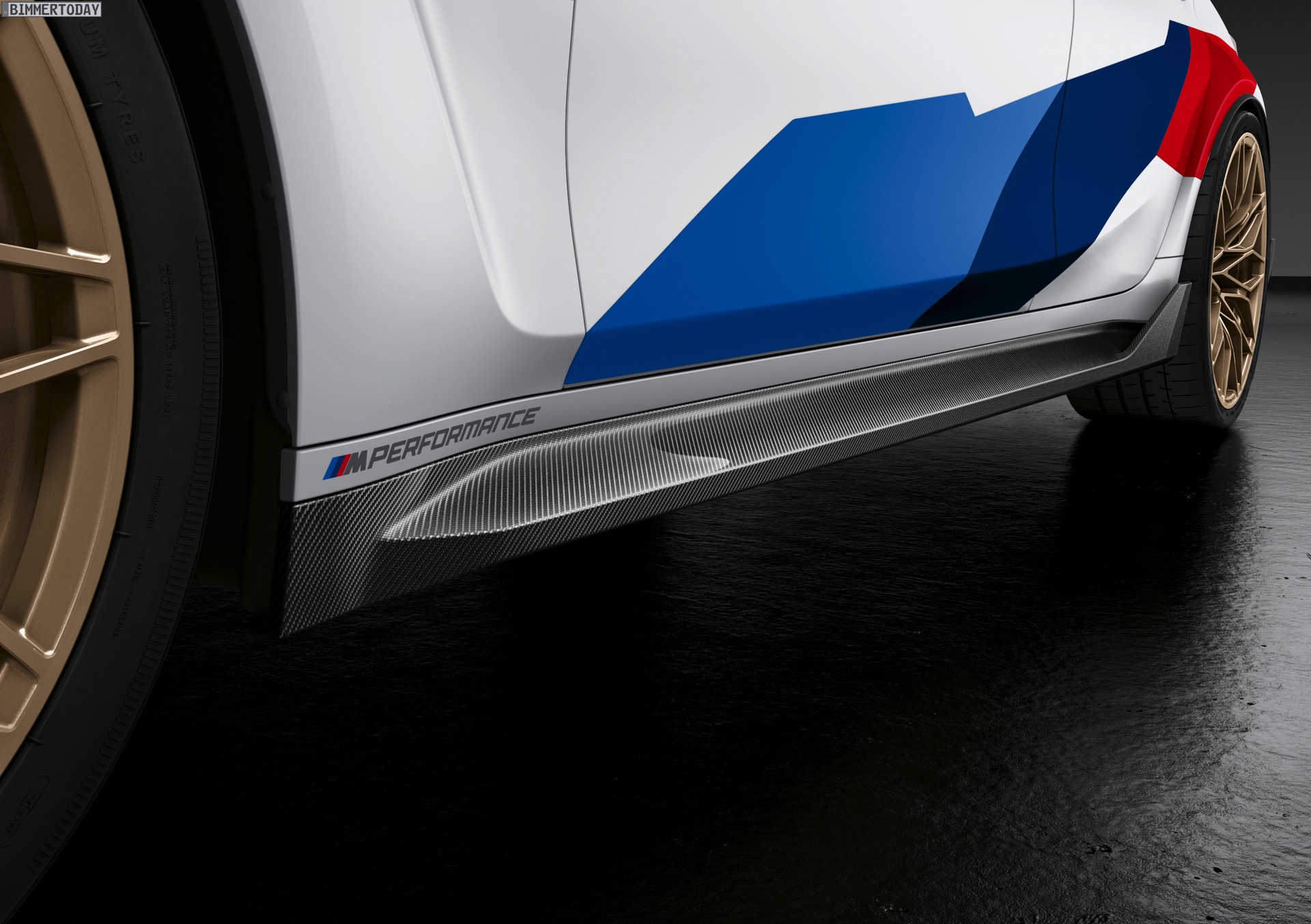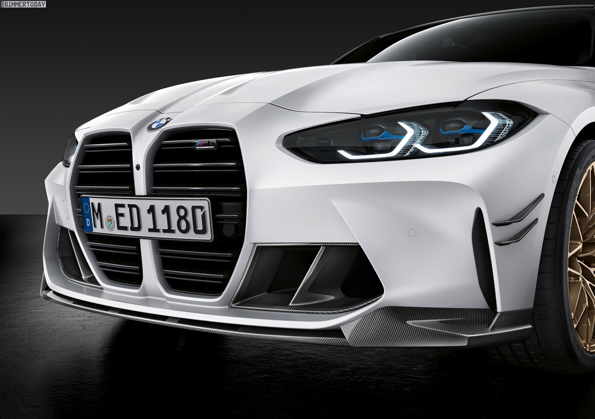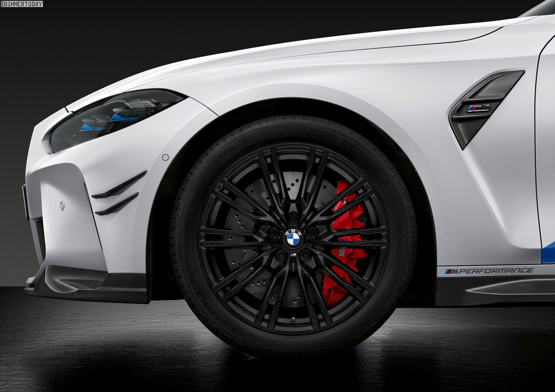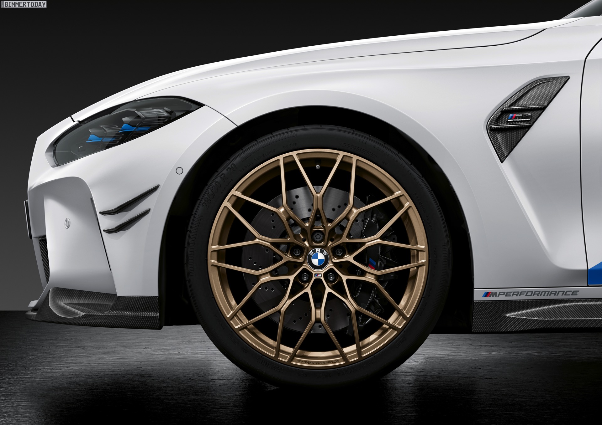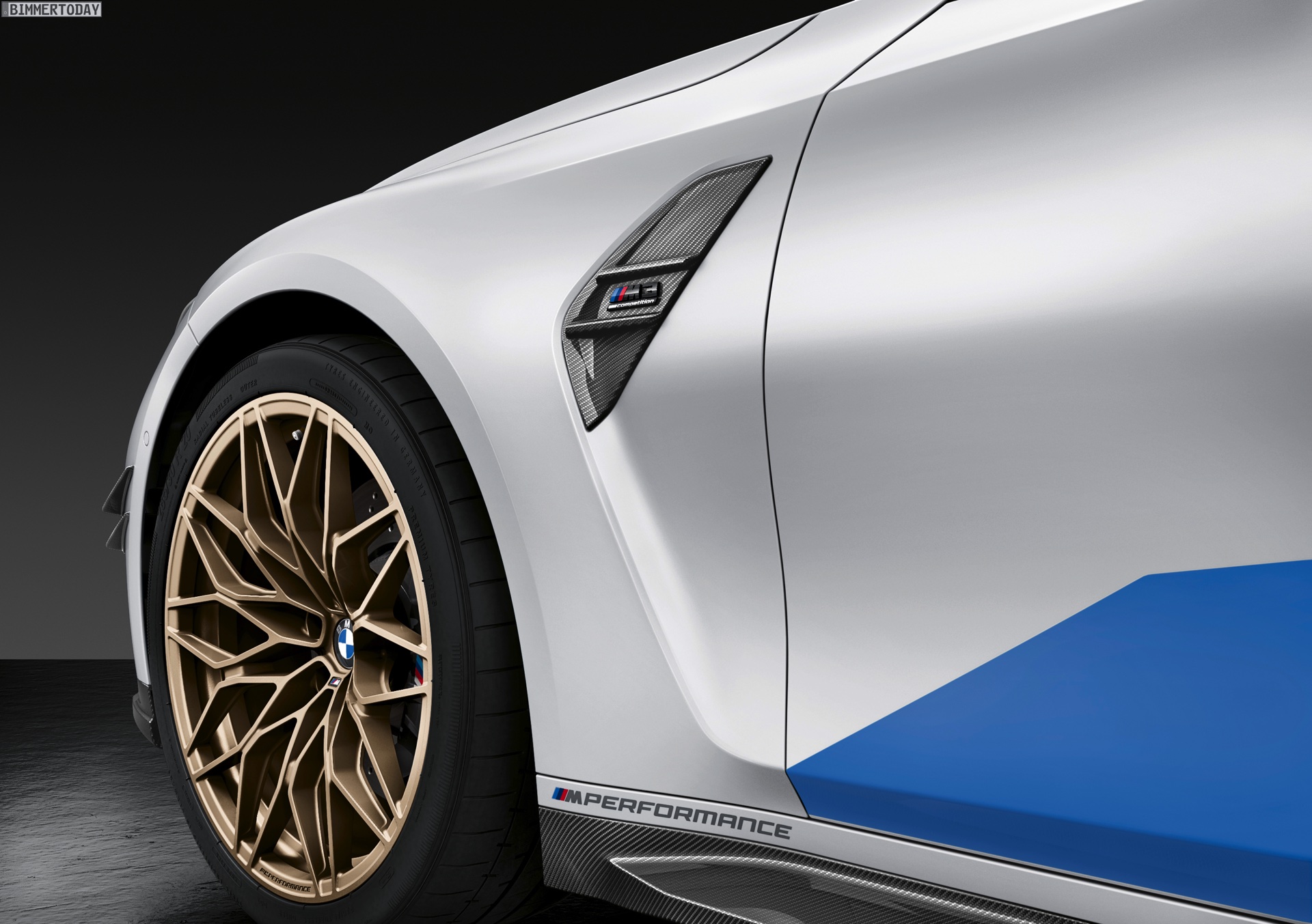 Keine Überraschung ist, dass auch größere Felgen zu den werkseigenen Tuning-Parts gehören. Während M3 und M4 in ihrer neuen Generation schon serienmäßig auf 18-Zöller vorn und 19-Zöller hinten setzen und in der Competition-Ausführung jeweils noch ein Zoll größer werden, geht BMW M Performance auf Wunsch noch einen Schritt weiter: Das Schmiederad Kreuzspeiche 1000 M kommt in 20 Zoll vorn und 21 Zoll hinten, als Farben stehen Goldbronze matt und Jet Black zur Wahl. Wer nicht auf ganz so großem Fuß leben will, erhält auch individuelle Tuning-Felgen in 19 und 20 Zoll.