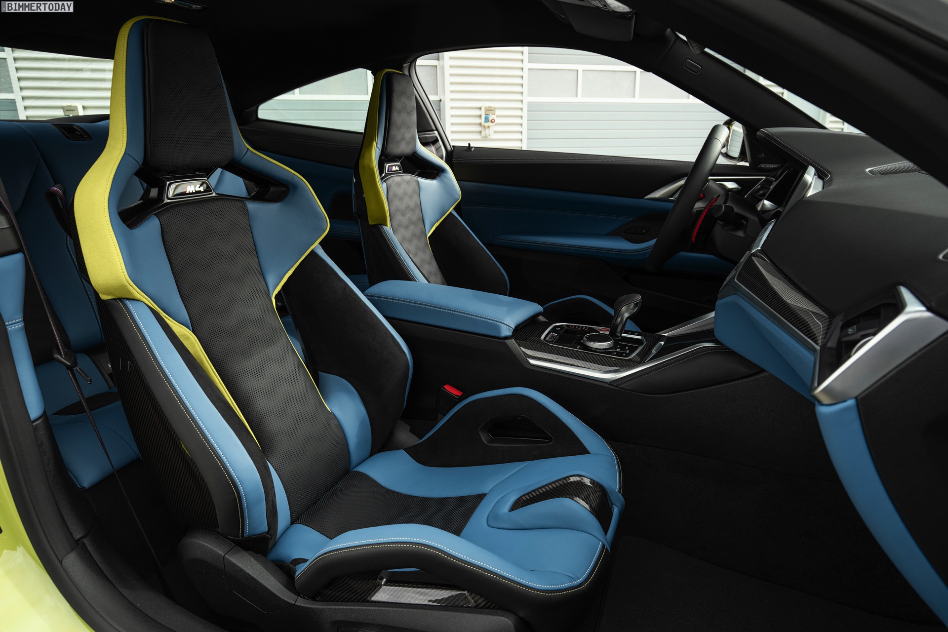 Auf den ersten Innenraum-Fotos zum BMW M4 Coupé sehen wir die optionalen M Carbon Schalensitze, die nicht nur optisch ein Hingucker sind: Im Vergleich zu den serienmäßigen Sitzen bringen sie auch 9,6 Kilogramm weniger auf die Waage. Die Kopfstützen der Schalensitze können demontiert werden, damit auf abgesperrter Strecke auch eine Fahrt mit Helm bequem und sicher möglich ist.
