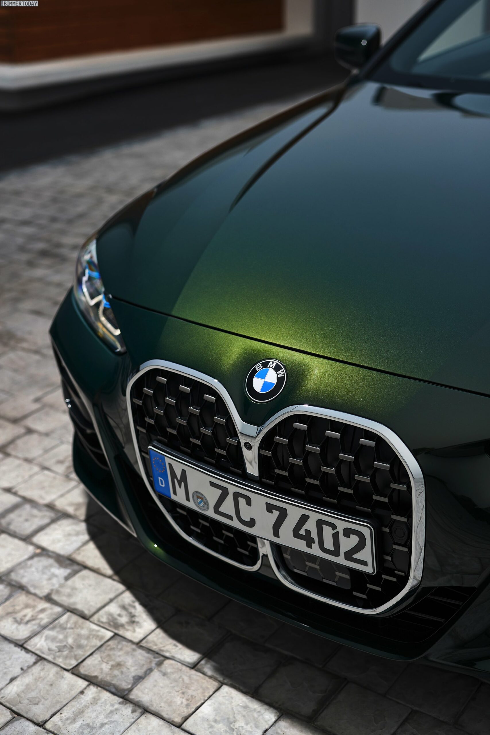 Während Seitenansicht und Heck durchaus als Evolution des Vorgängers F33 durchgehen könnten, geht die Front wie erwartet völlig neue Wege. Die senkrecht stehende Doppel-Niere im Mesh-Design beschert dem BMW 4er Cabrio G23 einen extrem selbstbewussten Auftritt, der die im Vergleich zum technisch eng verwandten 3er deutlich sportlichere Positionierung unterstreicht. Auf den ersten Fotos sehen wir das Cabriolet nicht nur mit dem optionalen M Sport-Paket, sondern auch mit der neuen Lackierung in San Remo Grün. Das kräftige Dunkelgrün betont die Eleganz der offenen Mittelklasse, Kunden mit anderen Vorlieben können natürlich auch aus einer Vielzahl anderer Farben von Arctic Race Blue über Sunset Orange bis hin zu Frozen Deep Grey wählen.