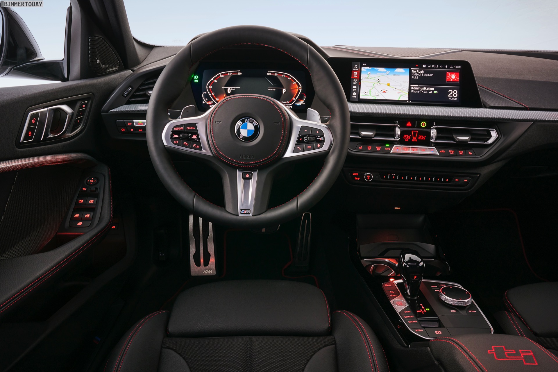Bemerkenswert ist auch, welchen Aufwand BMW in die Individualisierung und Aufwertung des Innenraums steckt: Nicht nur auf den ersten Blick unterscheidet sich der neue BMW 128ti deutlich stärker von einem 1er mit M Sport-Paket als ein M135i xDrive, dessen Interieur auf derart deutliche Hinweise verzichtet – dadurch aber auch etwas erwachsener wirkt als der betont-jugendliche 128ti. Wie schon bei den roten Akzenten für das Exterieur gilt auch hier: Wer lieber keine roten Kontrastnähte haben möchte, kann den Bayern-GTI auch ohne entsprechenden Zierrat bestellen.