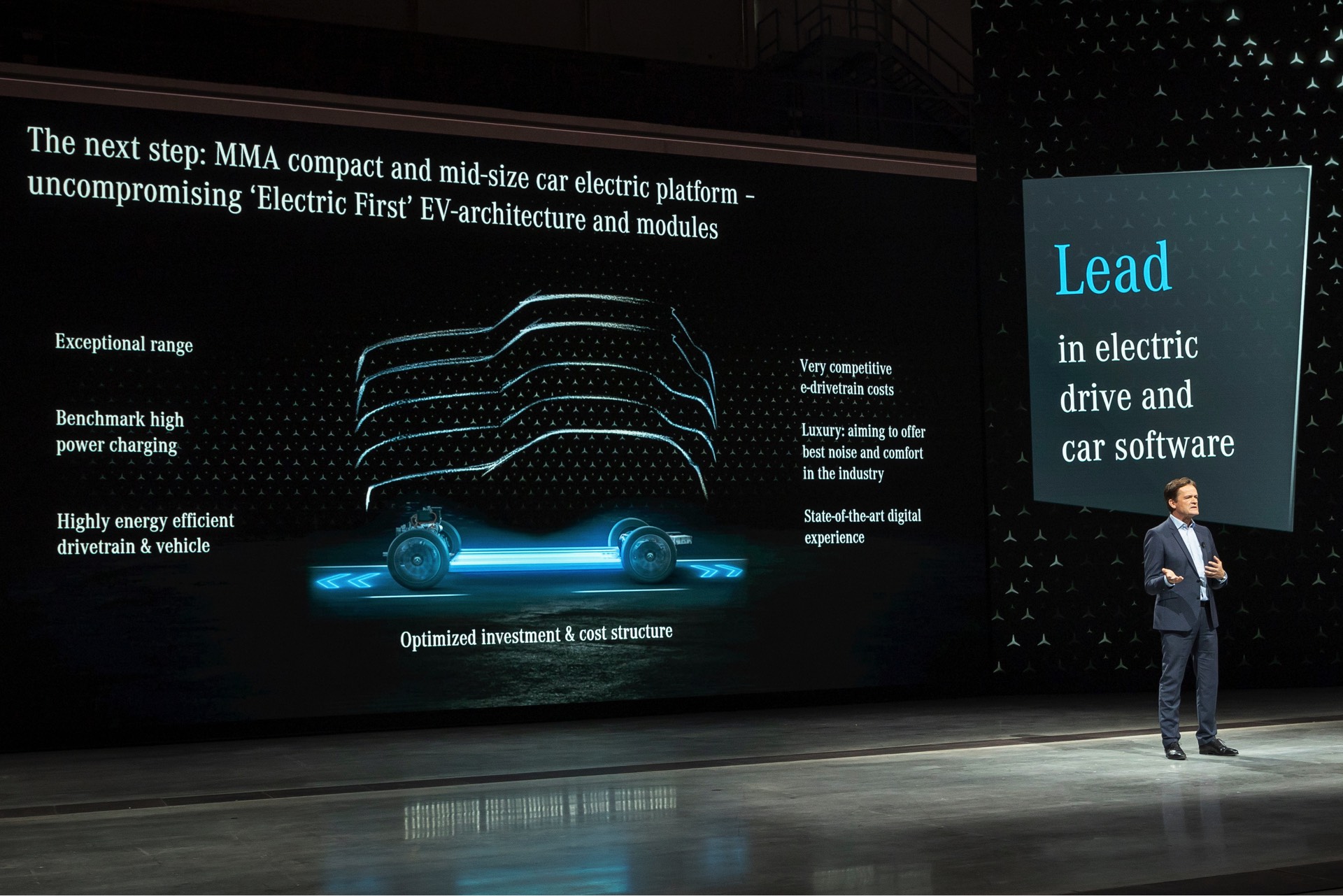 Markus Schäfer (Mitglied des Vorstands der Daimler AG und Mercedes Benz AG, verantwortlich für Daimler Konzernforschung und Mercedes-Benz Cars COO): “Wir streben bei Mercedes-Benz nichts weniger als die Führung im Bereich der Elektromobilität und Digitalisierung durch eine intelligente Plattformstrategie und einen softwarebasierten Ansatz an. Wir verfolgen unseren eigenen, den Mercedes-Weg, indem wir den Kunden mit unseren Elektrofahrzeugen eine intuitive und luxuriöse Erfahrung bieten. Dazu nutzen wir unsere eigene Entwicklungsabteilung und strategische Partnerschaften. Wir wollen ab 2025 für alle neuen Architekturen mittels hoher Gleichteilquoten, genau dosierten Investitionen sowie weiter fallender Batteriekosten hohe Deckungsbeiträge erreichen. Während der Anteil von elektrifizierten und vollelektrischen Fahrzeugen bis 2030 mehr als 50% des weltweiten Absatzes ausmachen wird, werden die Investitionen in Verbrennungsmotoren schnell zurückgehen und die Zahl der Varianten bis 2030 um 70% reduziert.”