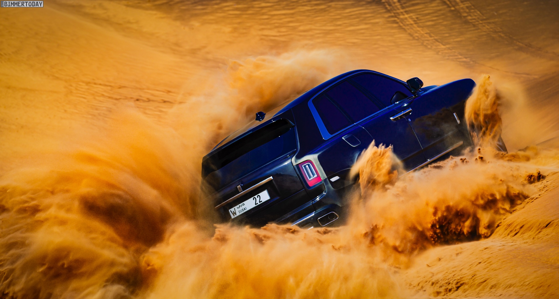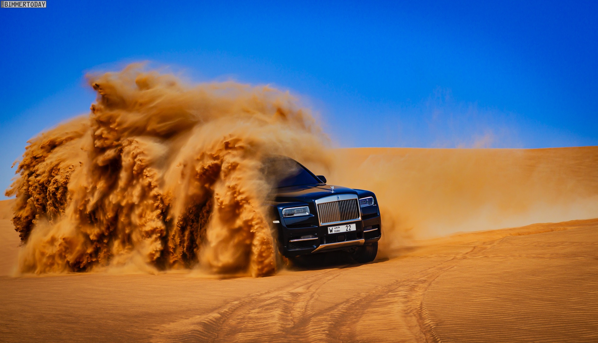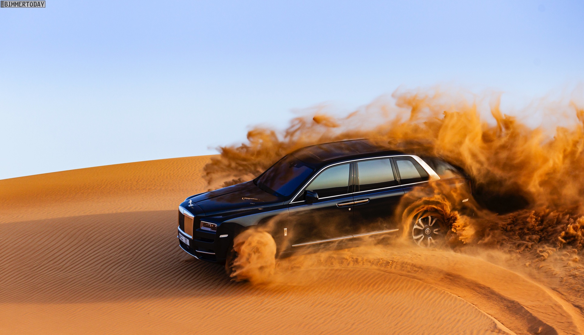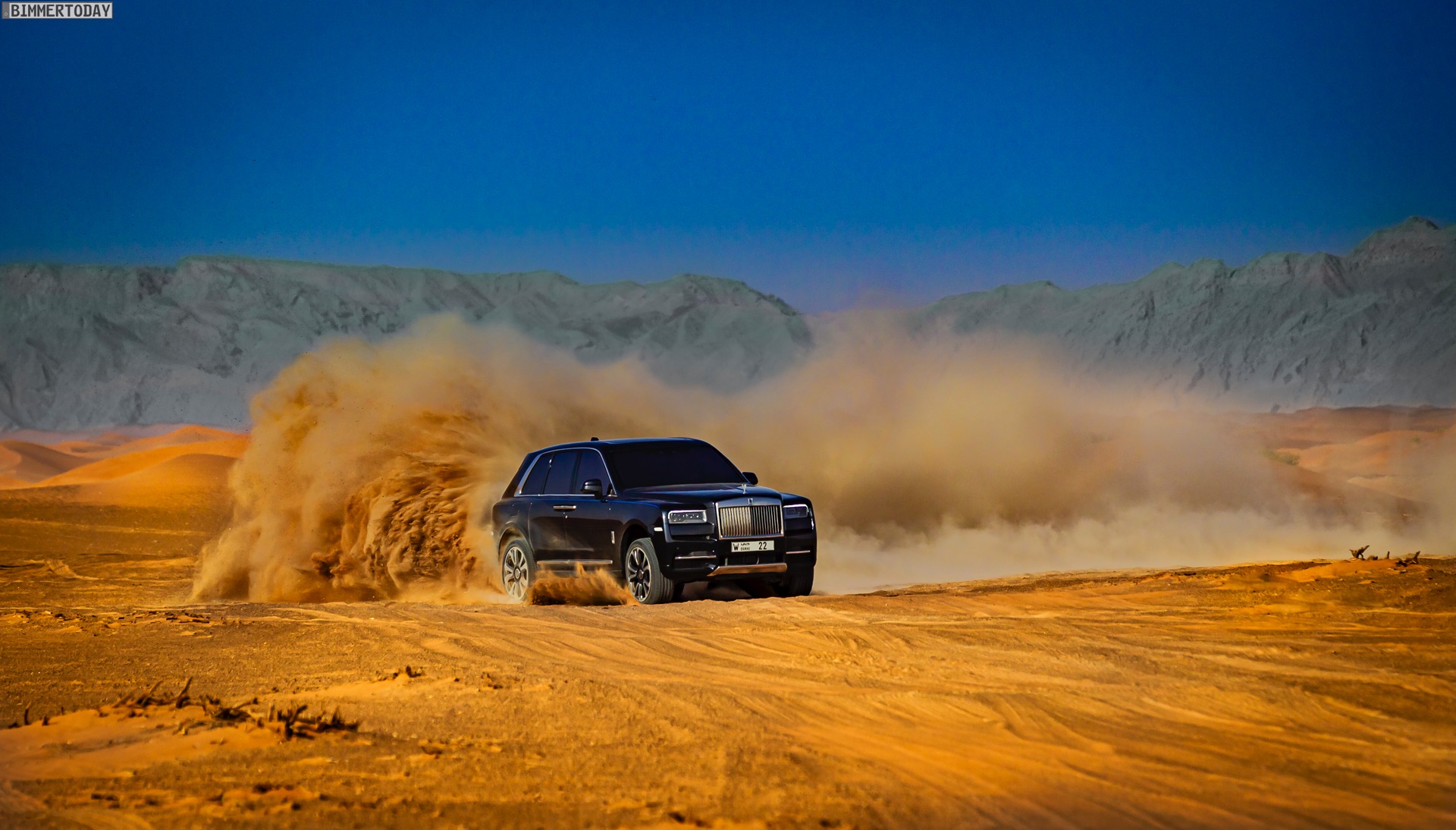 Dass sich mit diesem Luxus-SUV auch die Wüste unsicher machen lässt, zeigen nun einige Fotos aus dem arabischen Raum. Hier gibt es Kunden, die auf der Suche nach Abenteuer sogar vor Ausflügen in einige der unwirtlichsten Gegenden der Welt nicht zurückschrecken und dabei sehen wollen, ob ihr Rolls-Royce Cullinan auch diese Herausforderung bewältigen kann. Wie die Fotos eindrücklich zeigen, strahlt das britische Luxus-SUV auch im gelb-orangen Wüstensand eine enorme Autorität aus und bewältigt den Untergrund scheinbar mühelos.