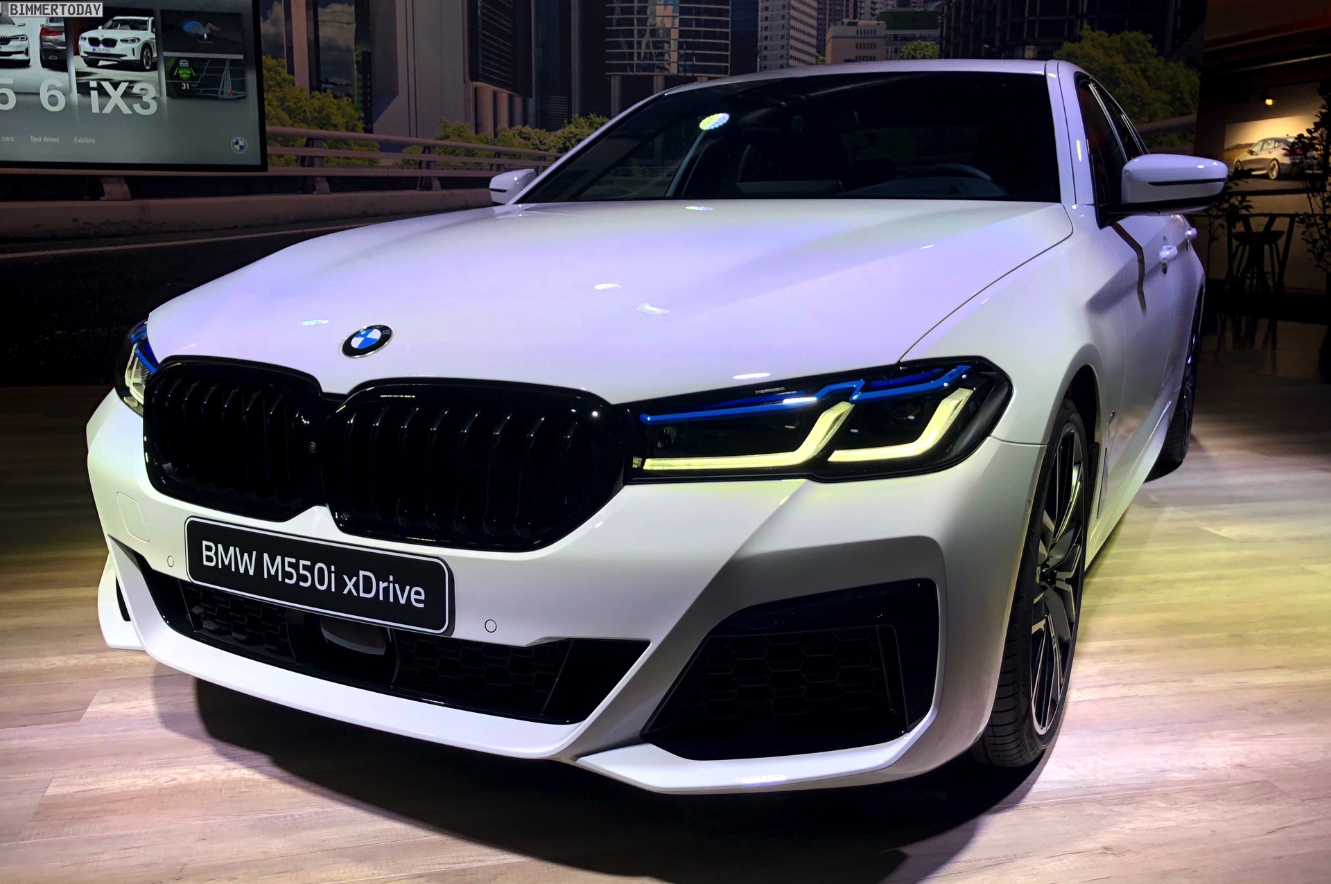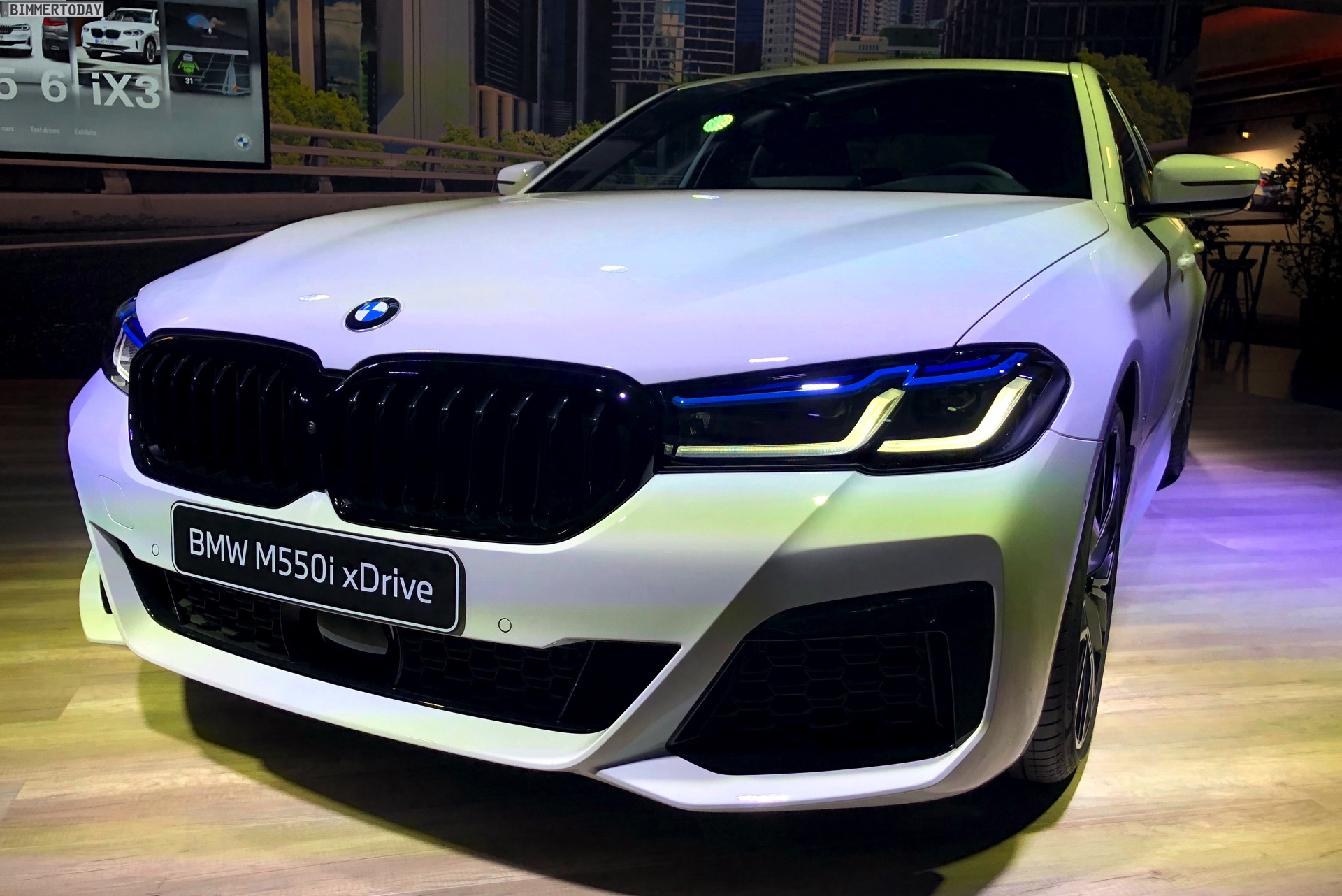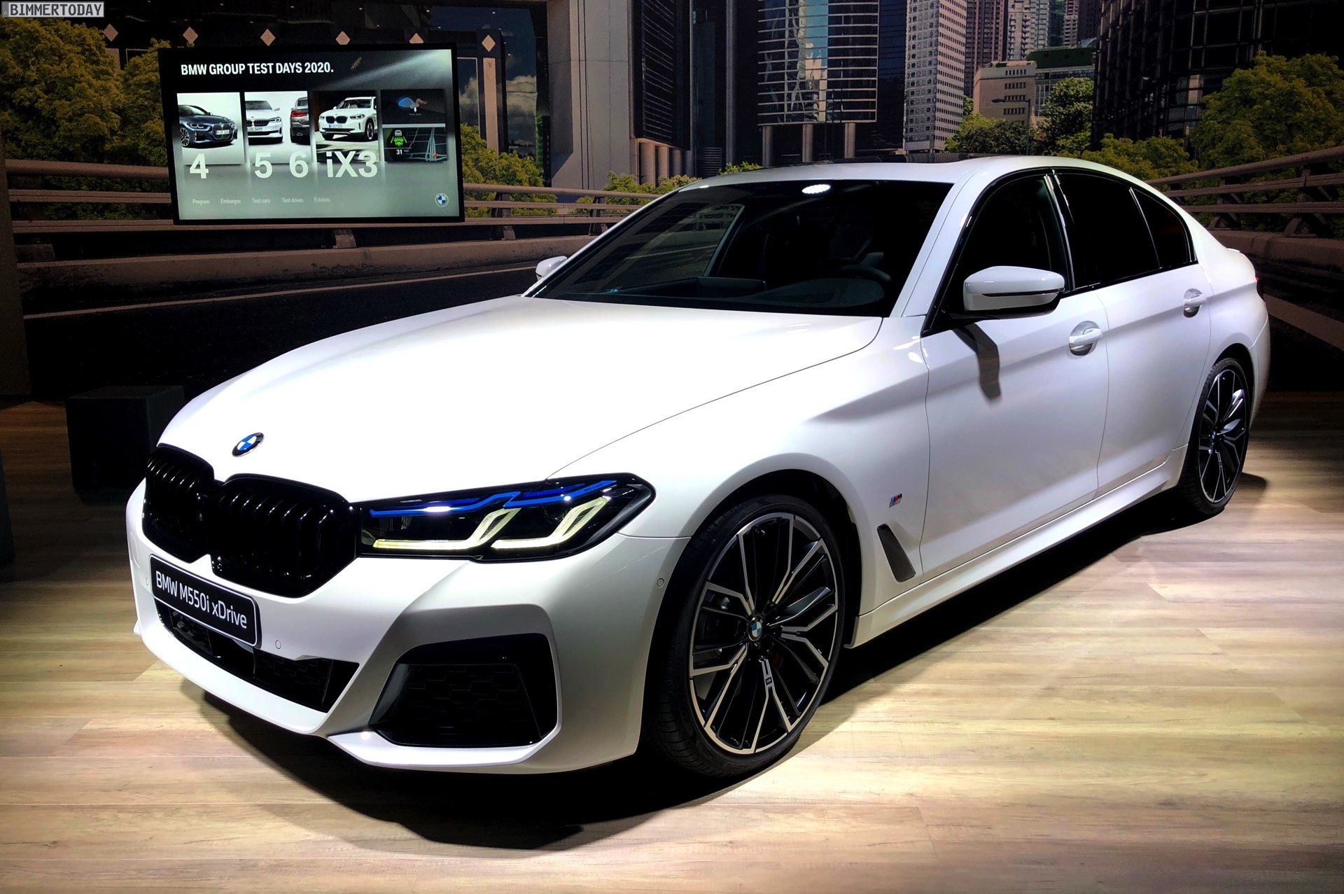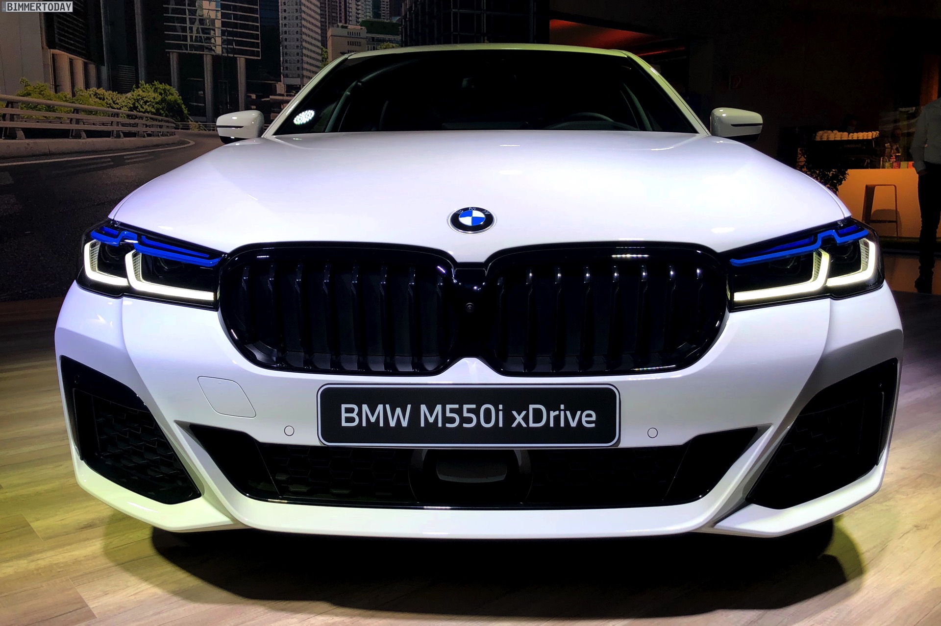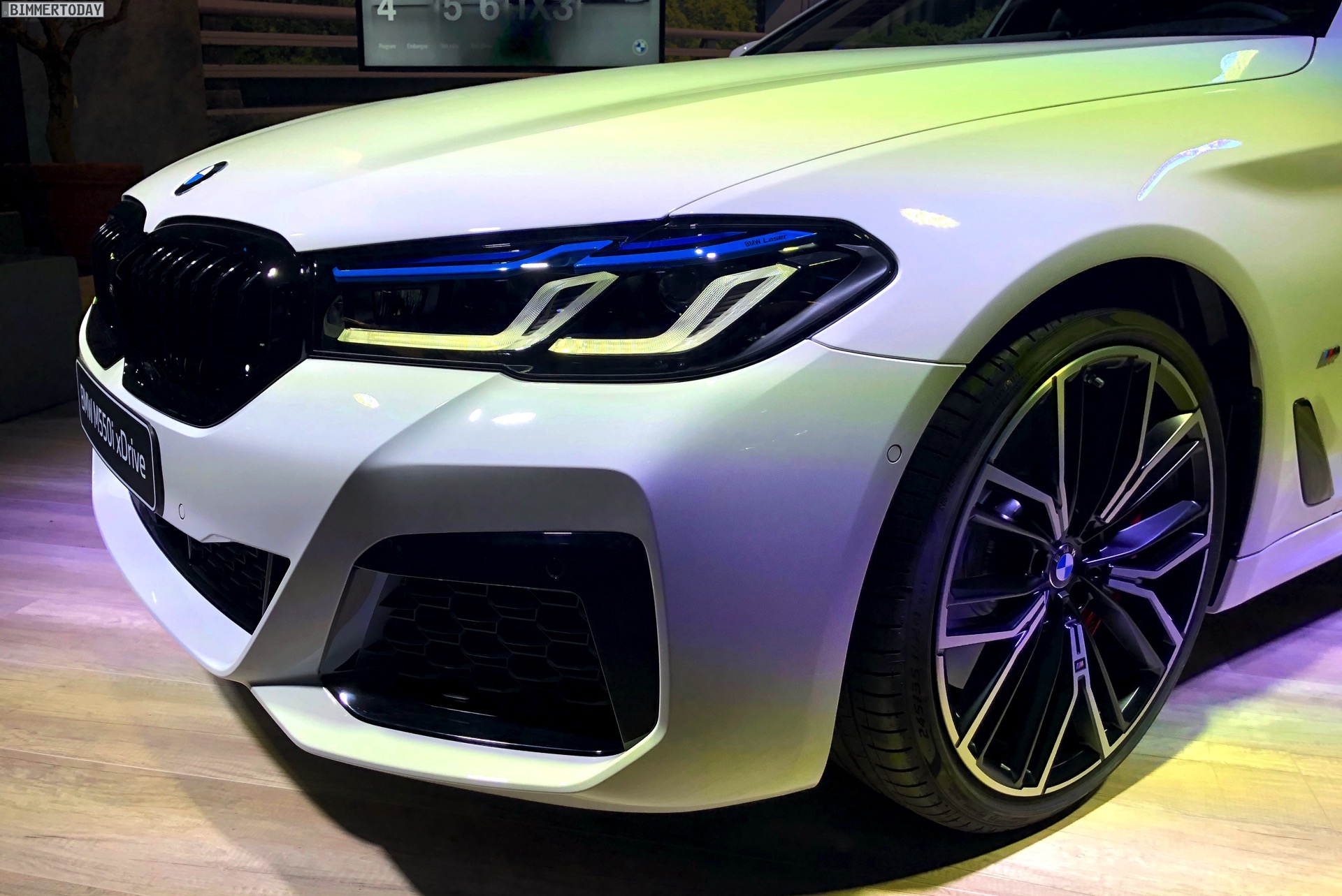 Mit Lackierung in Weiß und Shadow Line mit erweiterten Umfängen konnten wir kürzlich das BMW M550i Facelift 2020 fotografieren. Die M Performance Variante des 5er G30 LCI ist dabei nur gemessen an ihrer Lackierung unschuldig, denn abgesehen vom weißen Lack ist der M550i xDrive voll auf Angriff getrimmt: Die Power-Limousine setzt mit schwarzen Nieren, riesigen Lufteinlässen und auch den in intensivem Blau leuchtenden Augenbrauen der optionalen Laserlicht-Scheinwerfer markante Akzente. Das seit dem Facelift völlig neu gezeichnete Tagfahrlicht verzichtet zwar auf Anleihen klassischer Designs, betont mit seinen horizontalen Linien aber zusätzlich die Breite des Fahrzeugs.