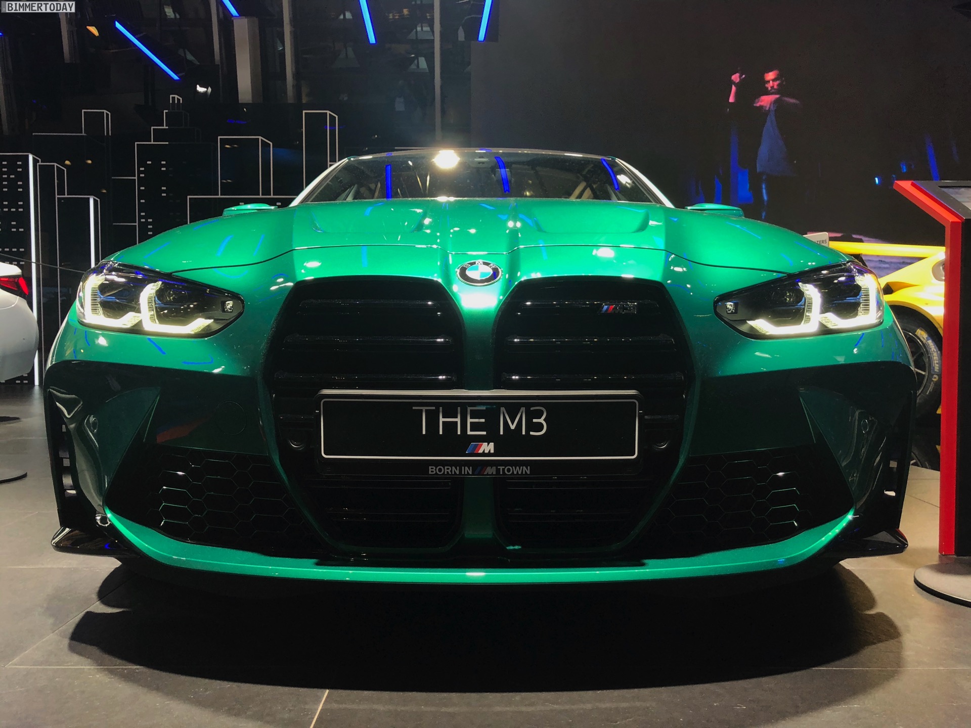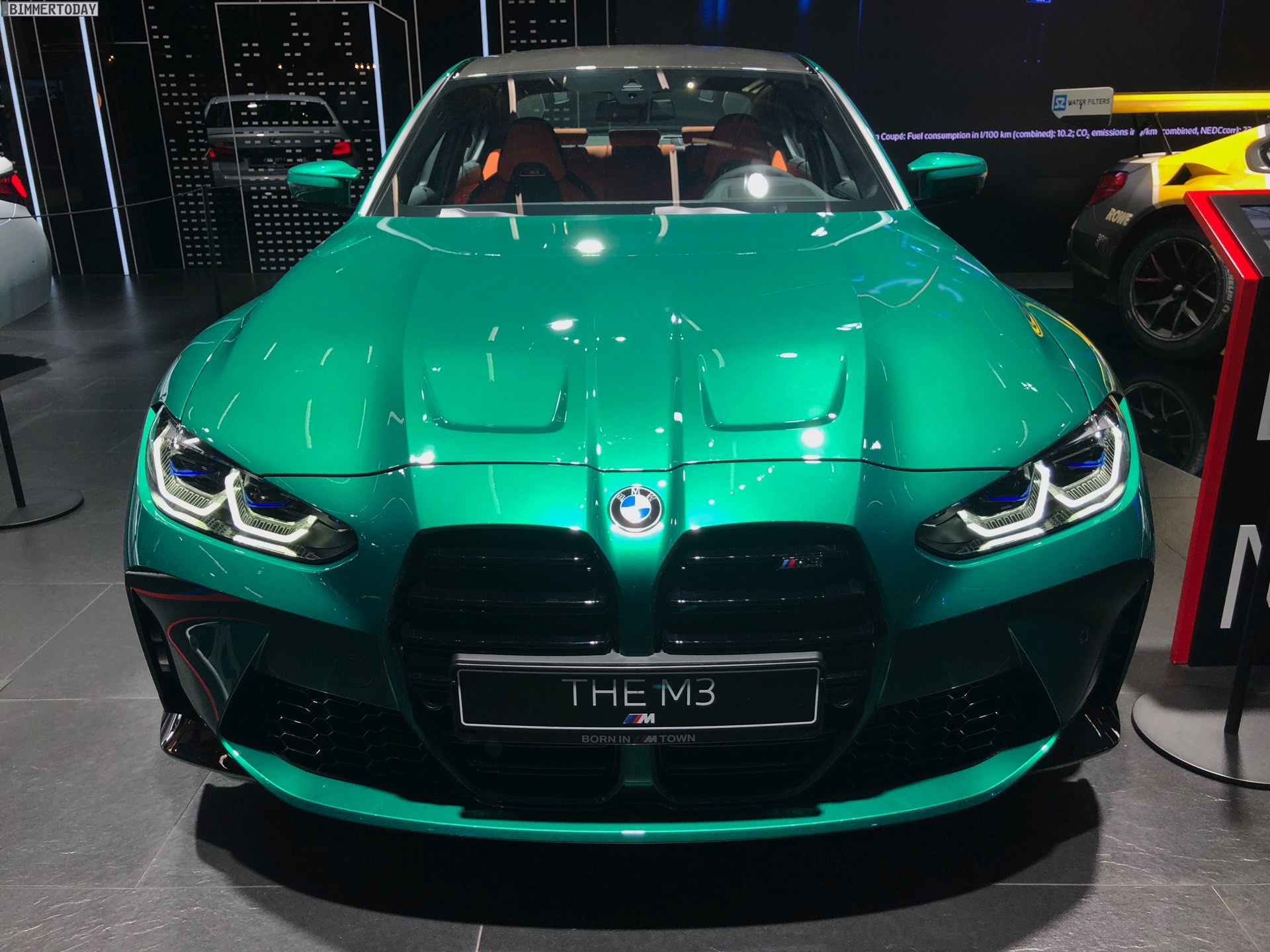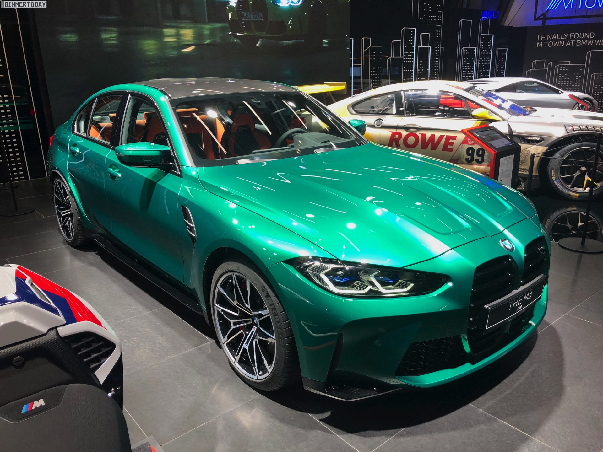 Wer sich ein eigenes Bild vom kontroversen Look des neuen BMW M3 G80 machen will, hat derzeit in der BMW Welt München die Chance dazu. Zwar feiert die sechste Generation Power-Limousine offiziell erst im Frühjahr 2021 ihren Marktstart, aber im M-Areal des Münchner Markenzentrums kann man sie schon heute persönlich in Augenschein nehmen. Wie schon auf den ersten offiziellen Fotos sehen wir den M3 G80 auch in München in der Launch-Farbe Isle of Man Green Metallic, die einen spannenden Farbtupfer auf so manchen Parkplatz bringen dürfte.
