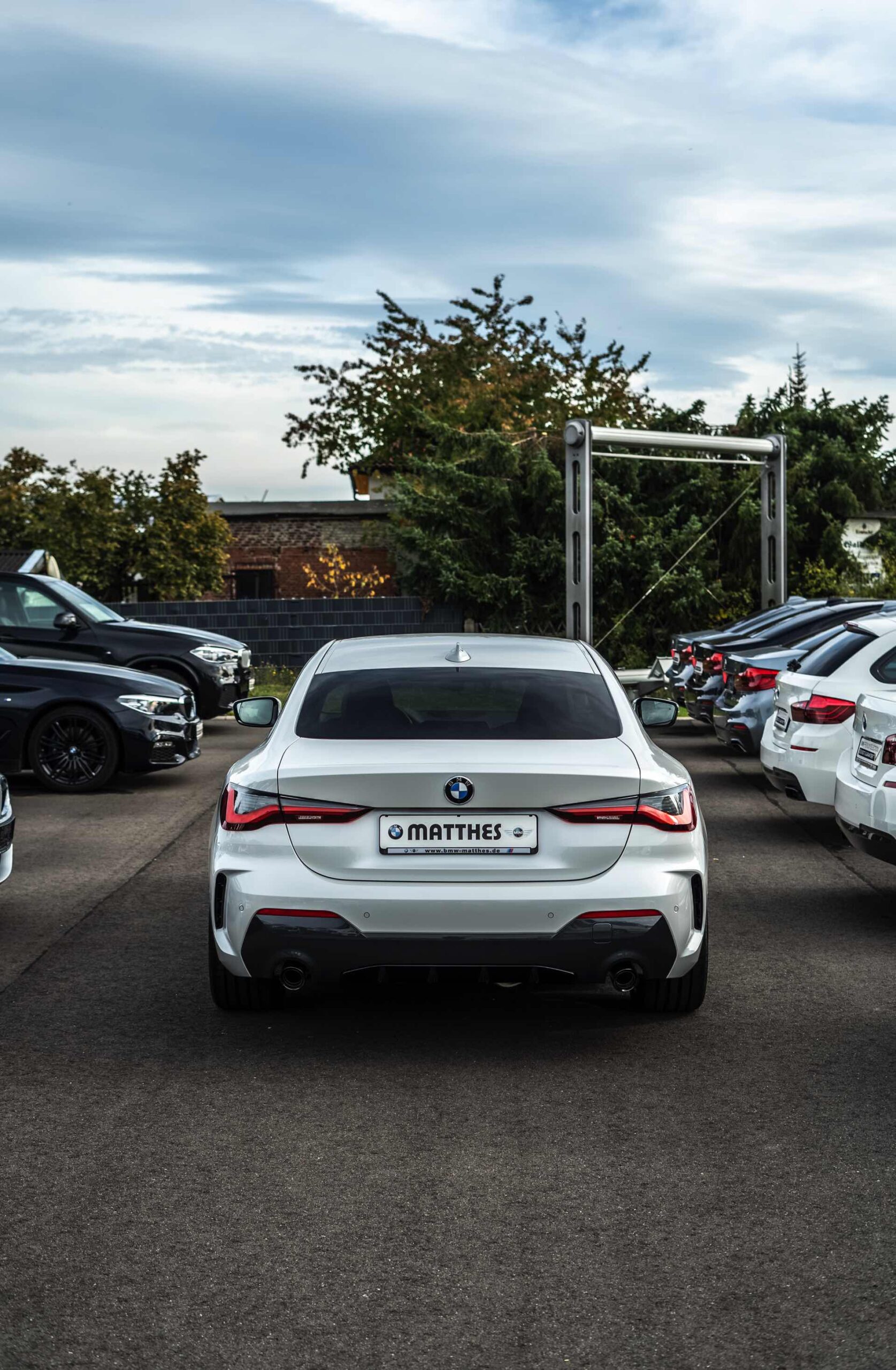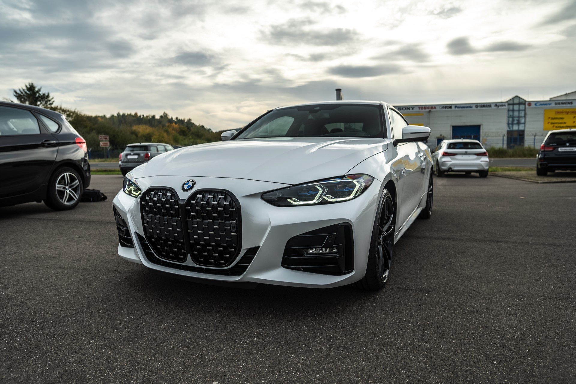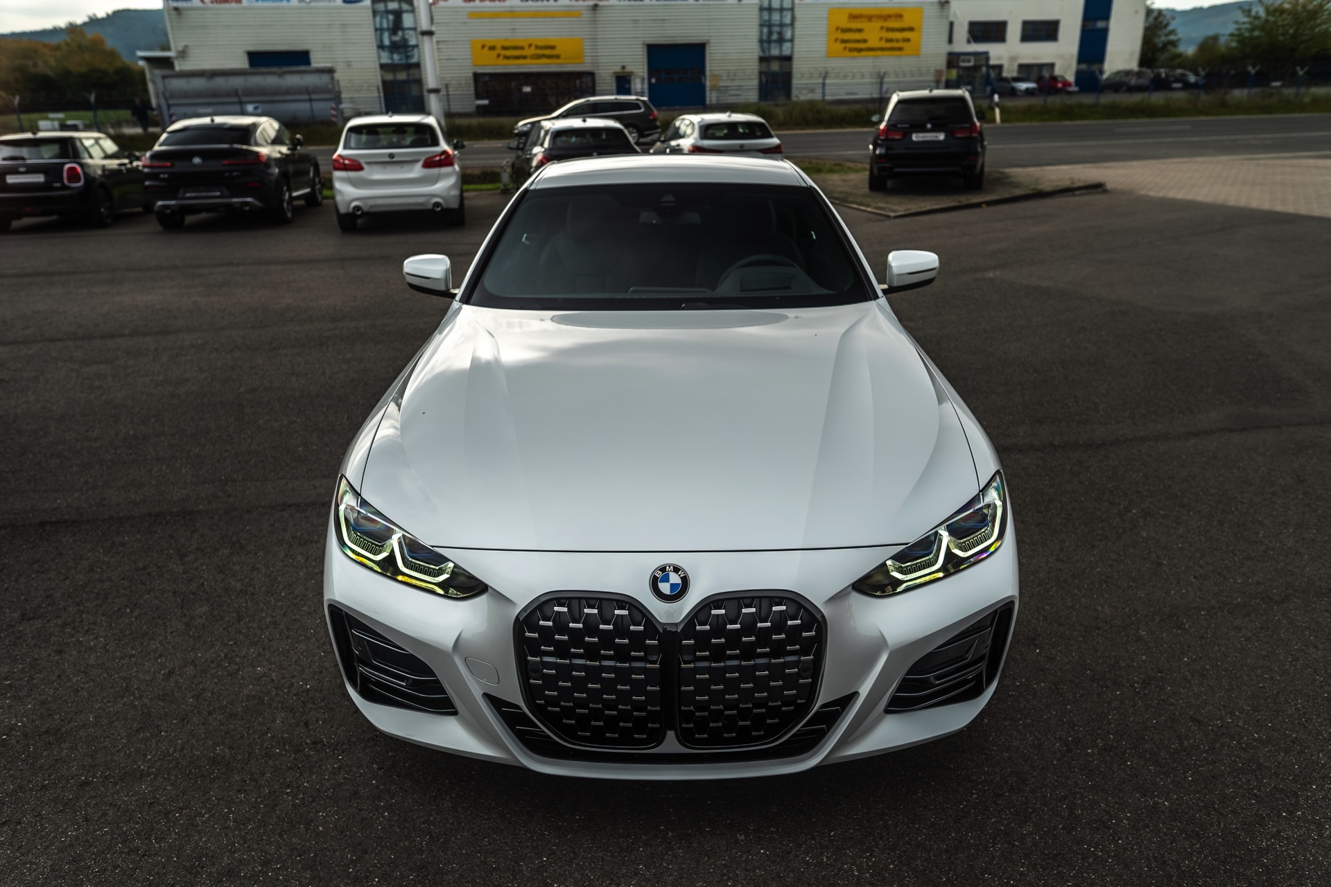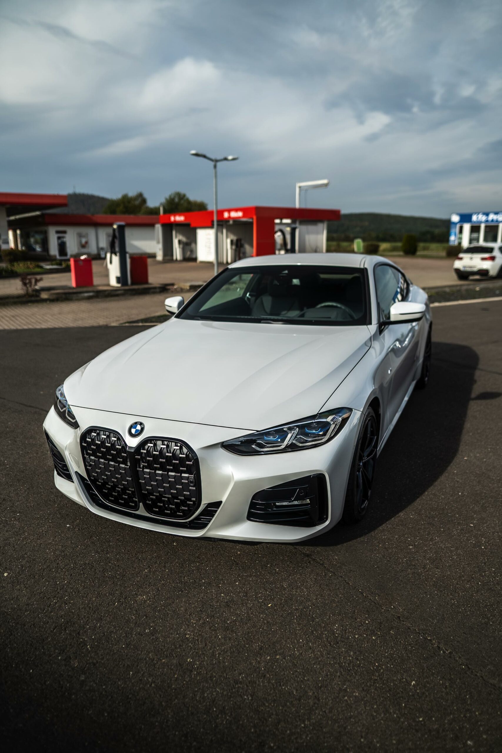 Auf der Suche nach maximalem Kontrast führt kein Weg an der Kombination von Schwarz und Weiß vorbei. Im Fall eines weißen BMW 4er Coupé G22 mit M Sport-Paket lädt die Shadow Line mit erweiterten Umfängen dazu ein, die markante Doppel-Niere an der Front noch selbstbewusster in Szene zu setzen: Unsere Leserin Julia Schneider konnte einen entsprechend konfigurierten 4er auf dem Gelände der Autohaus Matthes GmbH in Tiefenort fotografieren, wobei ein kleines Detail die Niere zusätzlich betont: Das Fahrzeug trägt noch kein Kennzeichen an der Front, weshalb die zumindest außerhalb Nordamerikas gängige optische Unterbrechung des Lufteinlasses entfällt.