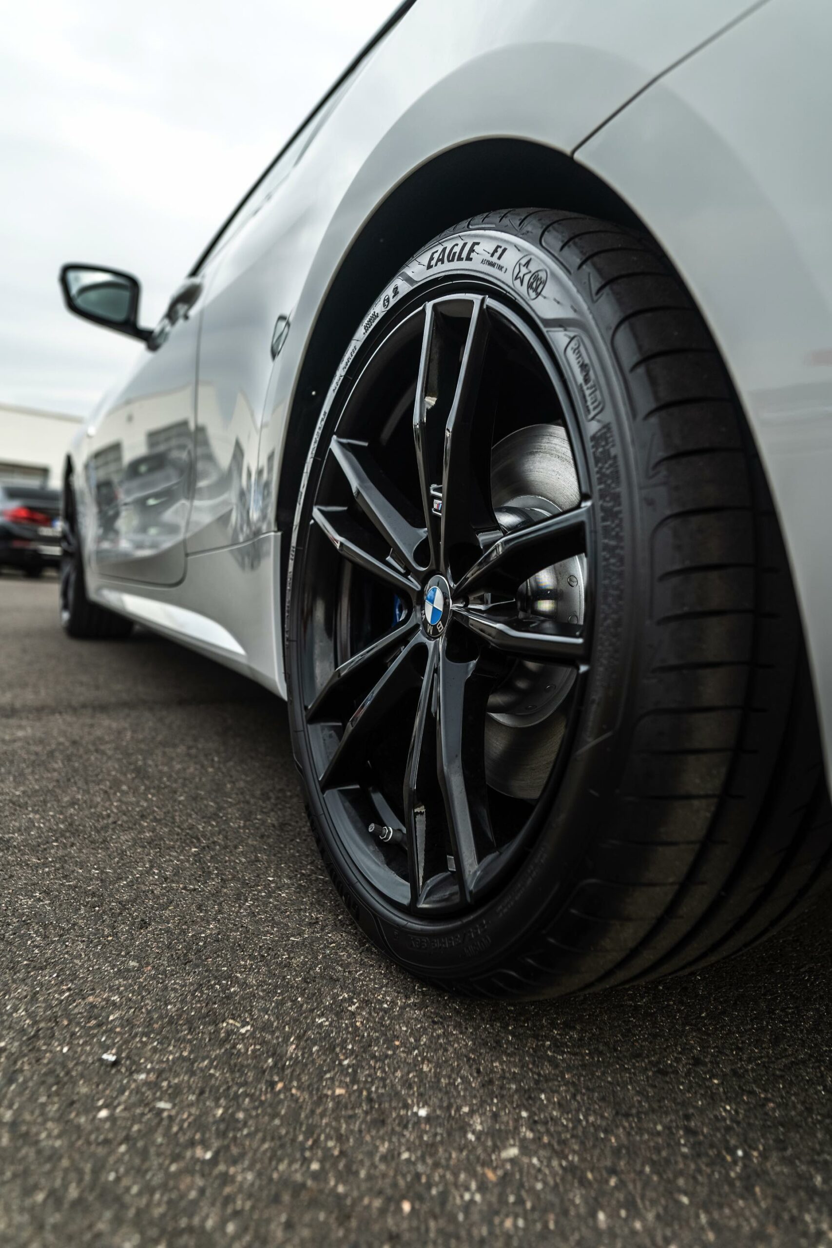 Neben der Einfassung für die beiden Nieren glänzen auch die Endrohr-Blenden in Schwarz, außerdem sorgt die Sonnenschutzverglasung ab der B-Säule für große dunkle Flächen. Bei einem derart auf Schwarz-Weiß getrimmten BMW 4er Coupé versteht es sich fast von selbst, dass neben den Akzenten der Shadow Line mit erweiterten Umfängen auch die Felgen auf die dunkelste aller Farben setzen: Die 19 Zoll großen Leichtmetallräder Doppelspeiche 791 M sind ebenfalls schwarz lackiert und runden das schwarz-weiße Gesamtbild treffsicher ab.