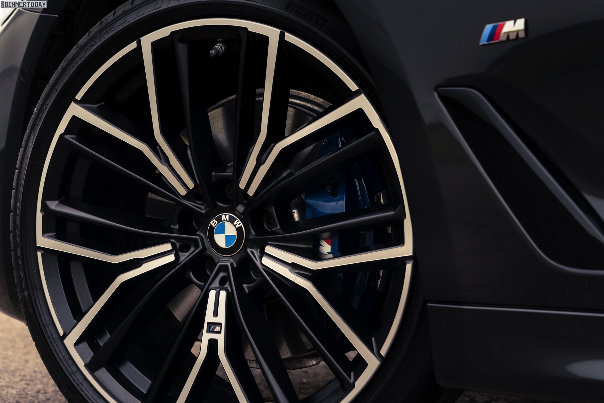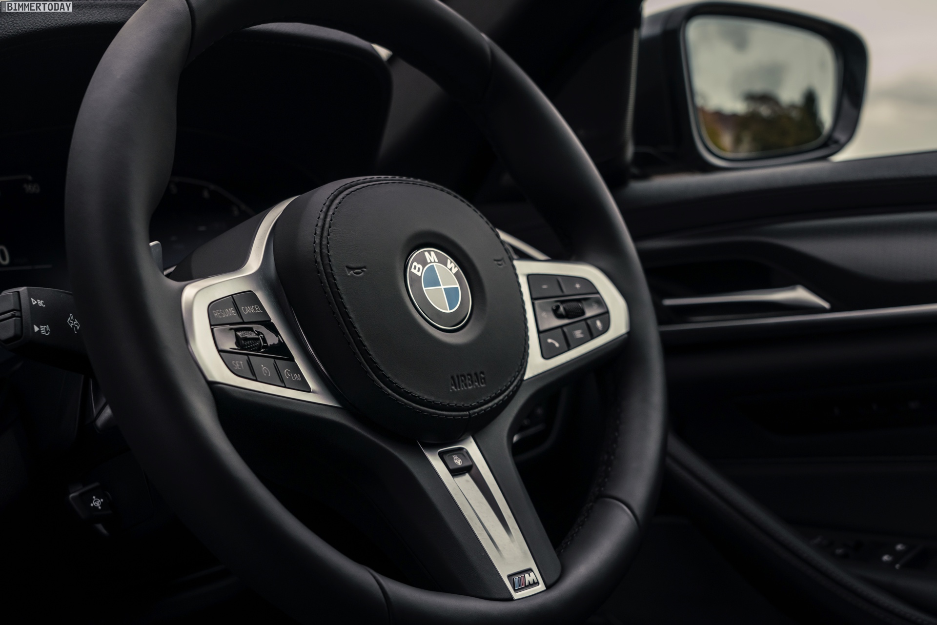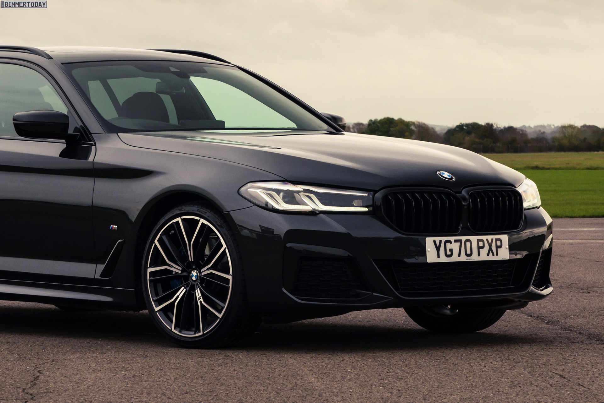 Auf den jüngsten Fotos aus Großbritannien sehen wir das BMW 5er Touring Facelift 2020 mit M Sport-Paket und Shadow Line mit erweiterten Umfängen. Vor allem die in Hochglanz-Schwarz lackierte Niere verändert den Auftritt des Kombis dabei maßgeblich, aber auch weitere Details wie die Endrohrblenden sind mit erweiterter Shadow Line ganz in Schwarz gehalten. Die britische Konfiguration vom aktuellen Foto-Shooting trägt außerdem eine schwarze Lackierung und die Sonnenschutzverglasung, die die Scheiben ab der B-Säule ebenfalls nahezu schwarz wirken lässt.