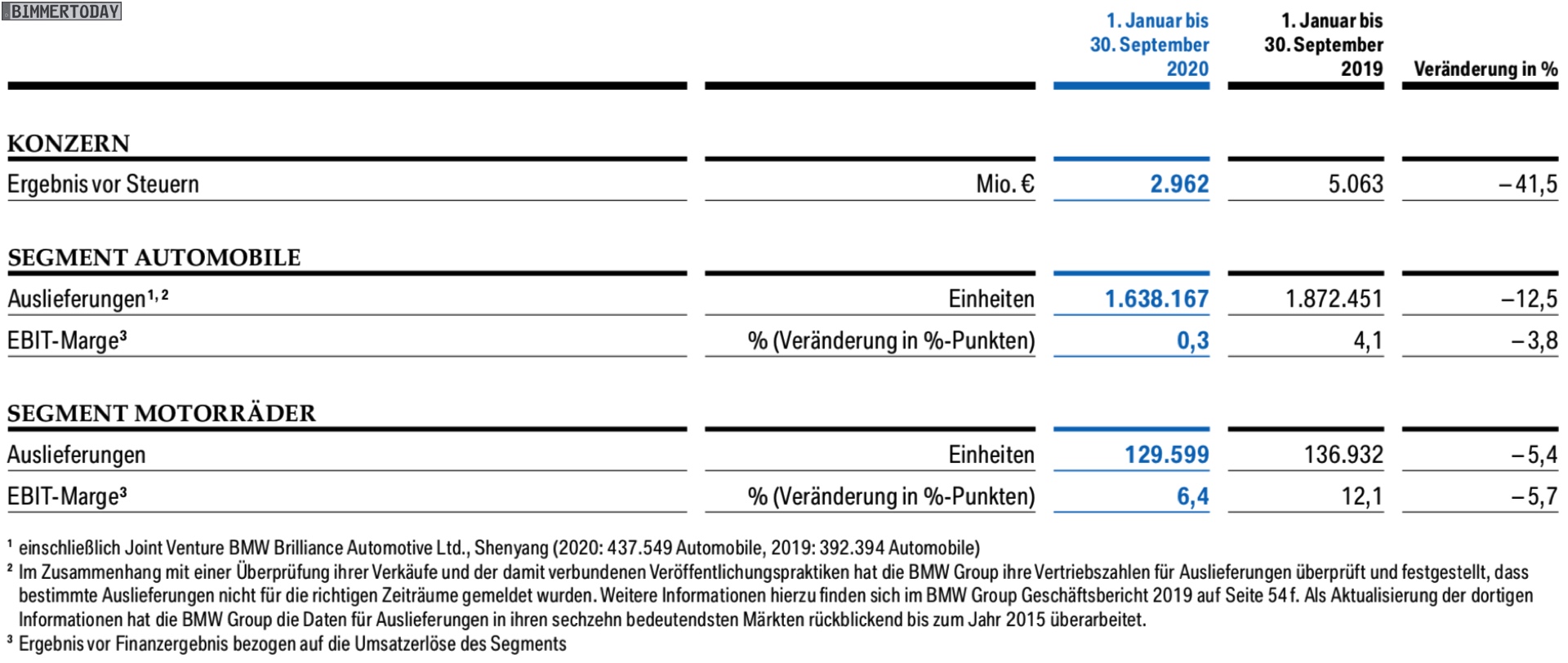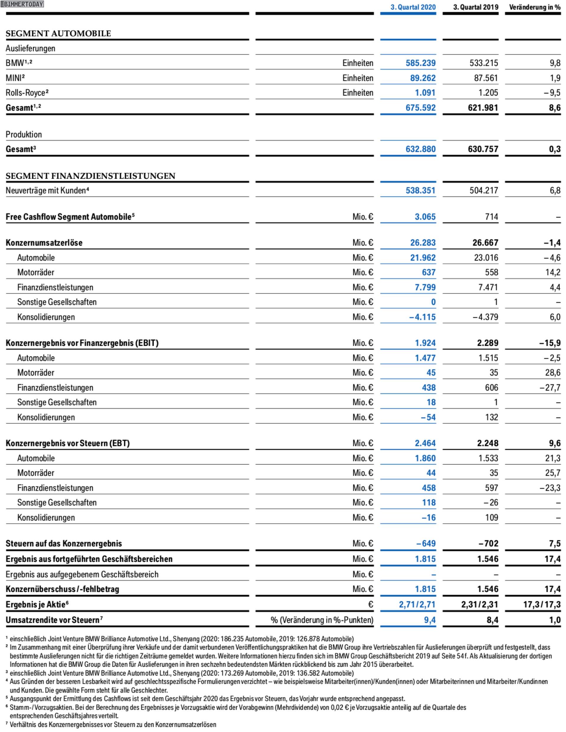 Corona zum Trotz hat die BMW Group in Q3 2020 ein Ergebnis von rund 2,5 Milliarden Euro vor Steuern erzielt, das sind knapp 10 Prozent mehr als im 3. Quartal des Vorjahres. Im Vergleich zum Vorjahr konnten trotz ausgesprochen schwieriger Rahmenbedingungen außerdem auch der Absatz und der Konzernüberschuss gesteigert werden, woran die schnelle Erholung des Automobilmarkts in China maßgeblichen Anteil hat. Grundlage des finanziellen Erfolgs sind die 675.592 ausgelieferten Fahrzeuge der Marken BMW, MINI und Rolls-Royce – das entspricht einer Absatz-Steigerung um 8,6 Prozent. Die EBIT-Marge im Segment Automobile lag dabei auf einem Niveau von 6,7 Prozent und damit knapp über dem Vorjahresniveau.