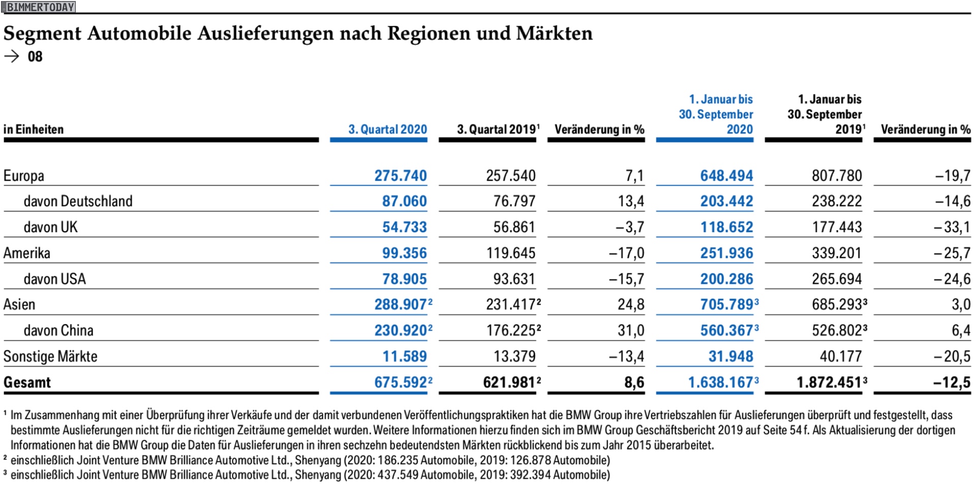 Beim Blick auf den Absatz in den Regionen und Märkten fällt allerdings auf, dass in Q3 2020 nicht nur China eine starke Performance gezeigt hat: Die BMW Group lag mit einem Absatz von 275.740 Einheiten auch auf dem Heimat-Kontinent Europa 7,1 Prozent über dem Vorjahr. Wichtigster Treiber der Erholung ist dabei der Heimatmarkt Deutschland, denn hier wurde der Vorjahreszeitraum sogar um 13,4 Prozent übertroffen. Noch größer fällt das Wachstum allerdings in Asien aus: 288.907 Einheiten entsprechen einer Steigerung um 24,8 Prozent, China allein kommt sogar auf ein Plus von 31,0 Prozent. Weniger gut läuft es in Amerika, wo nicht nur die stark Corona-belasteten USA weit vom Niveau des Vorjahres entfernt bleiben: 99.356 Einheiten entsprechen einem Rückgang um 17,0 Prozent.