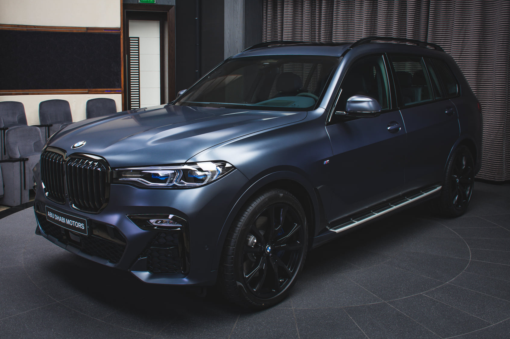 Vergleichsweise unspektakulär ist der Antrieb der hier gezeigten BMW X7 Dark Shadow Edition: Das derzeit in Abu Dhabi präsentierte Exemplar ist ein BMW X7 xDrive40i mit 333 PS starkem Reihensechszylinder sowie 48-Volt-Bordnetz. Was in anderen Baureihen locker ein Topmodell sein könnte, ist im Fall des aktuellen Top-SUV nicht mehr als die aktuelle Einstiegsmotorisierung – momentan gibt es unterhalb des X7 M50i nur die Modelle xDrive40i und xDrive40d. Mit Verzicht hat der Antrieb dennoch nichts zu tun: 6,3 Sekunden für den Sprint von 0 auf 100 und 243 km/h Höchstgeschwindigkeit sind mit Blick auf über 2,4 Tonnen Leergewicht sicher nicht zu verachten. Wer noch mehr will, kann die Dark Shadow Edition auch mit dem 530 PS starken V8-Biturbo des X7 M50i bestellen.