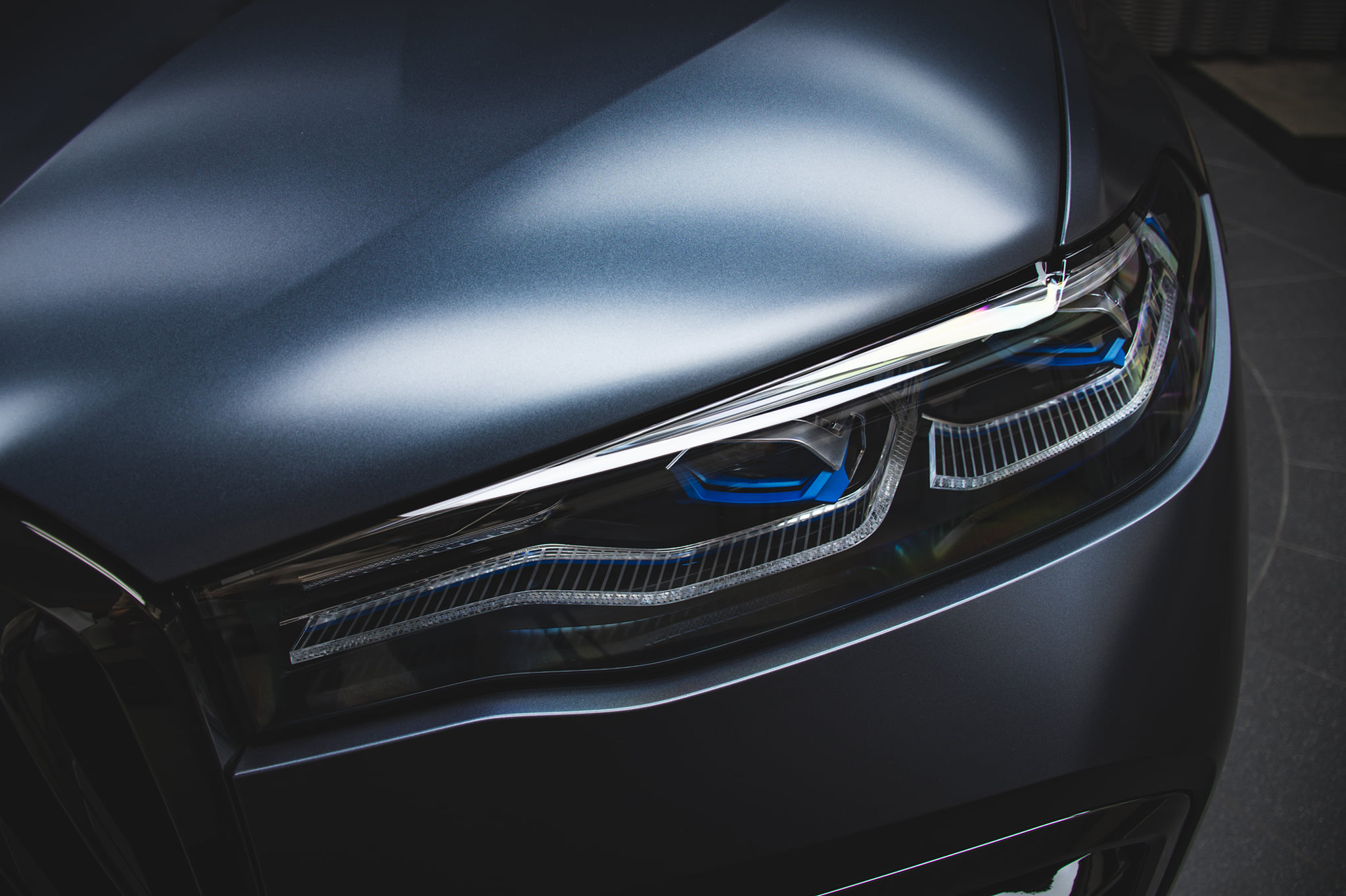 Auffällig ist, dass die Live-Fotos die neue Farbe Frozen Arctic Grey deutlich blauer wirken lassen als die ersten offiziellen Pressefotos: Damals erinnerte die Lackierung eher an Frozen Black oder Frozen Dark Grey. Kombiniert wird das seidenmatt schimmernde Blau-Grau mit den dunklen Details der Shadow Line mit erweiterten Umfängen. Die ohnehin sehr exponierte Doppel-Niere an der Front des X7 wird so zusätzlich betont. Genauso mächtig und genauso schwarz wie erwartet wirken die 22 Zoll großen Leichtmetallräder V-Speiche 755 M.