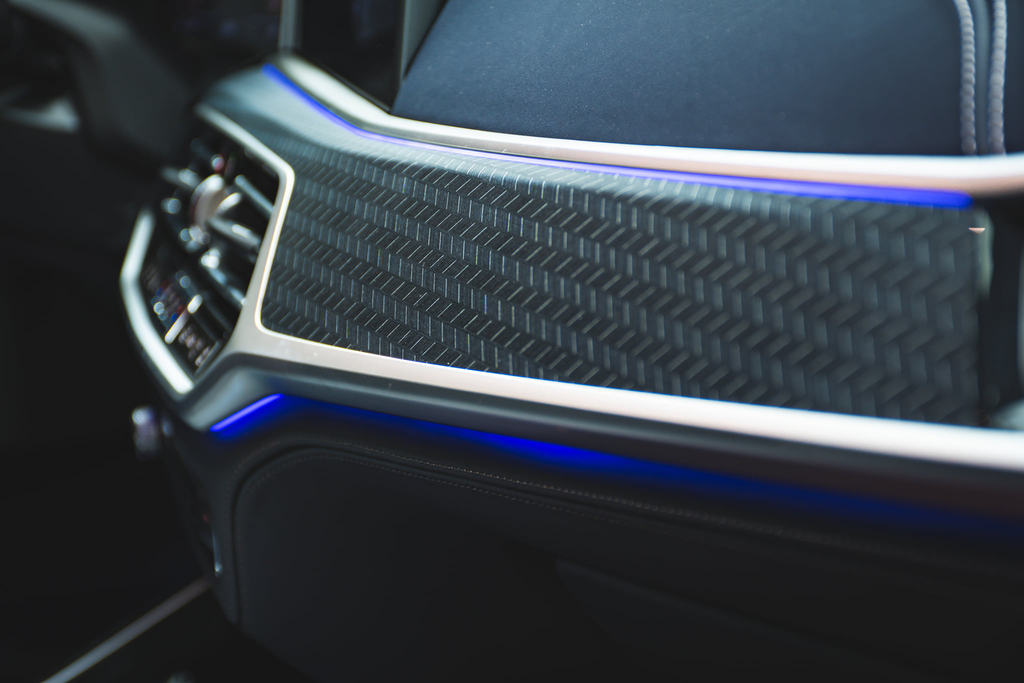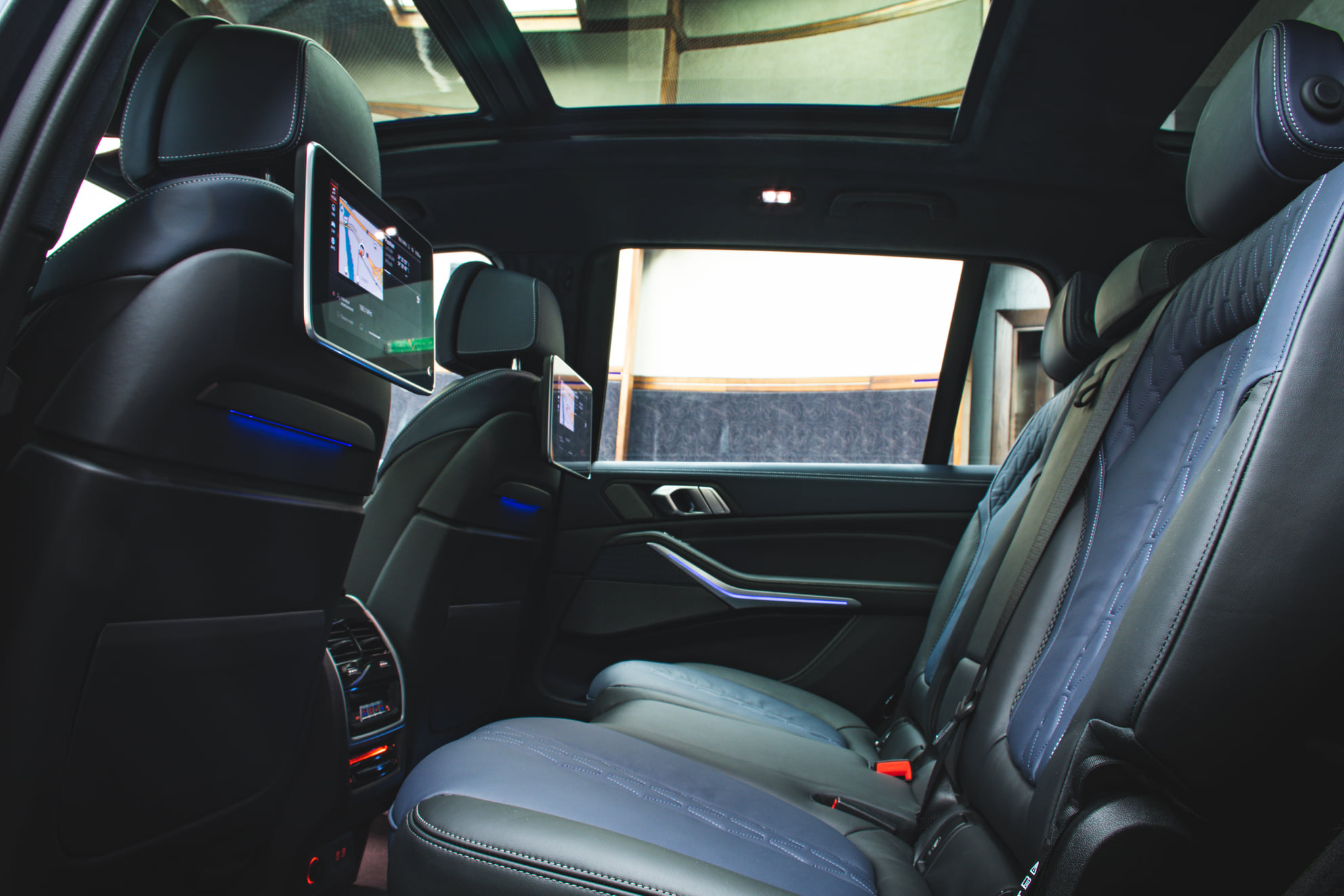 Im Innenraum trägt die Sonderedition nicht nur einen auffälligen Schriftzug als Hinweis auf die Exklusivität des Fahrzeugs, sondern auch eine Bicolor BMW Individual Volllederausstattung Merino in Nachtblau und Schwarz: