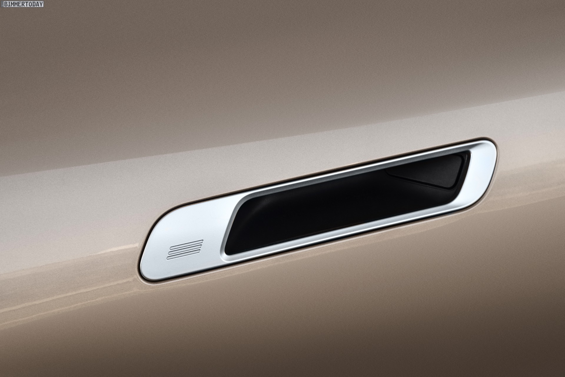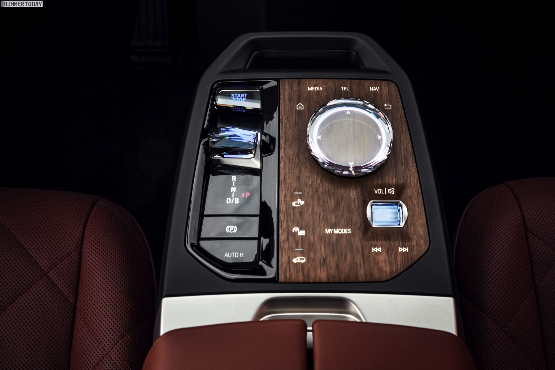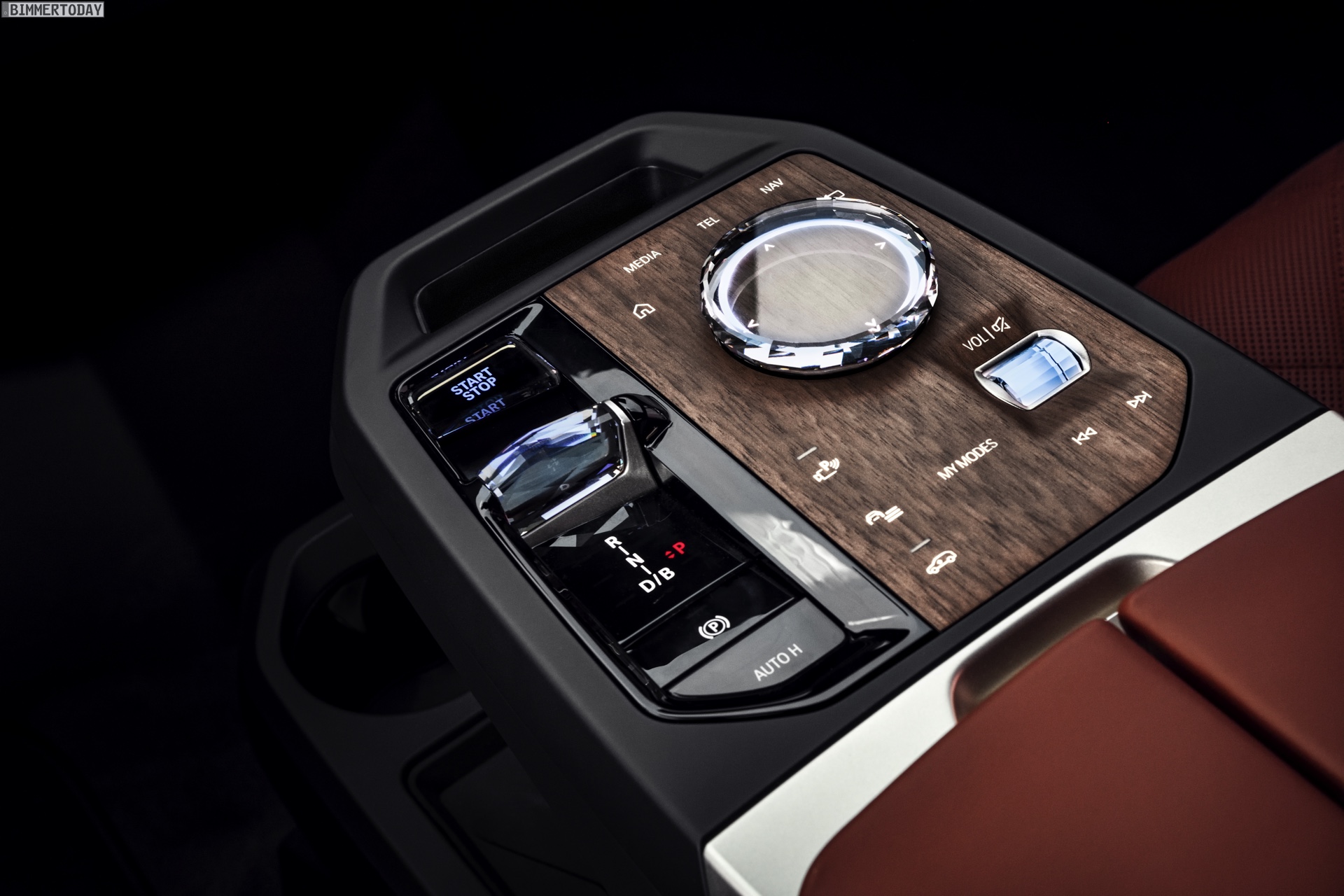Viel kleiner als gewohnt fällt auch der Gangwahlschalter auf der Mittelkonsole aus, der neben dem iDrive-Controller aus geschliffenem Kristallglas positioniert ist. Rund um den iDrive-Controller, der eher wie ein Kunstwerk als wie ein klassisches Bedienelement wirkt, wird das Shy Tech-Prinzip auf die Spitze getrieben: Die Oberfläche aus offenporigem Holz ist eine einzige homogene Fläche, verbirgt aber elf nur durch hinterleuchtete Symbole angedeutete Tasten. Damit das System dennoch ohne hinzusehen während der Fahrt bedient werden kann, sind winzige Fühlstege zwischen den Tasten platziert: Wer die Position der Tasten kennt und mit dem Finger über die Fläche gleitet, weiß auch ohne hinzusehen an welcher Stelle sich sein Finger gerade befindet.