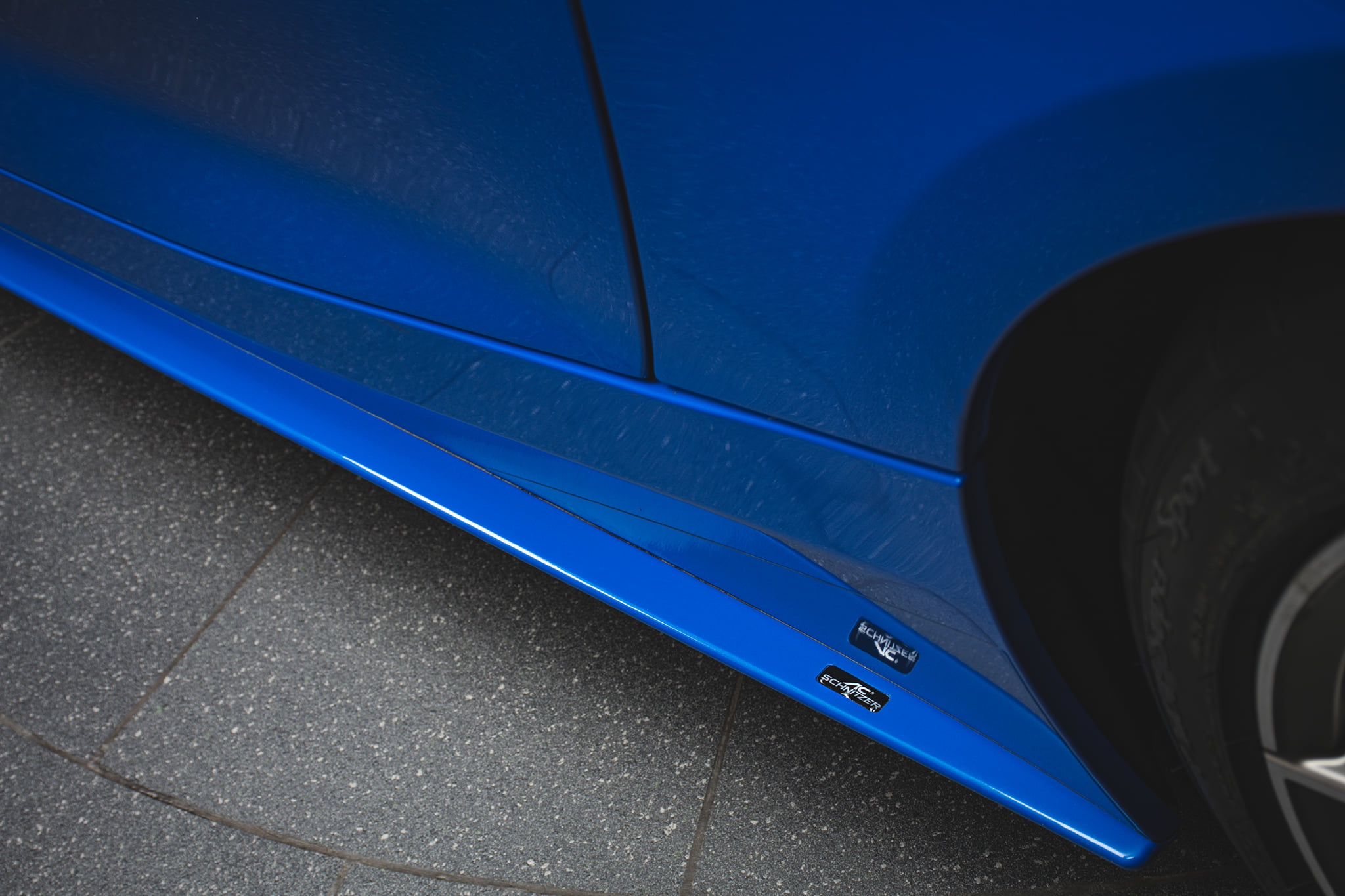 Die Proportionen und der sportliche Look des knackig gezeichneten Zweisitzers werden von den AC Schnitzer-Teilen zusätzlich betont: Frontsplitter, Seitenschweller-Aufsätze und vor allem die zweigeteilte Heckspoiler-Lippe verändern den Auftritt deutlich. Zusätzliche Akzente setzen die zahlreichen Details in Cerium Grey, die den BMW Z4 M40i zumindest für Kenner auf den ersten Blick von schwächeren Modellen unterscheidbar machen. Neben der Nieren-Einfassung, den seitlichen Lufteinlässen der Frontschürze und den Außenspiegel-Kappen sind es vor allem die Kopfstützen und die 19 Zoll großen Leichtmetallräder im Design Doppelspeiche 800 M Bicolor, die das seidig schimmernde Cerium Grey prominent in Szene setzen.