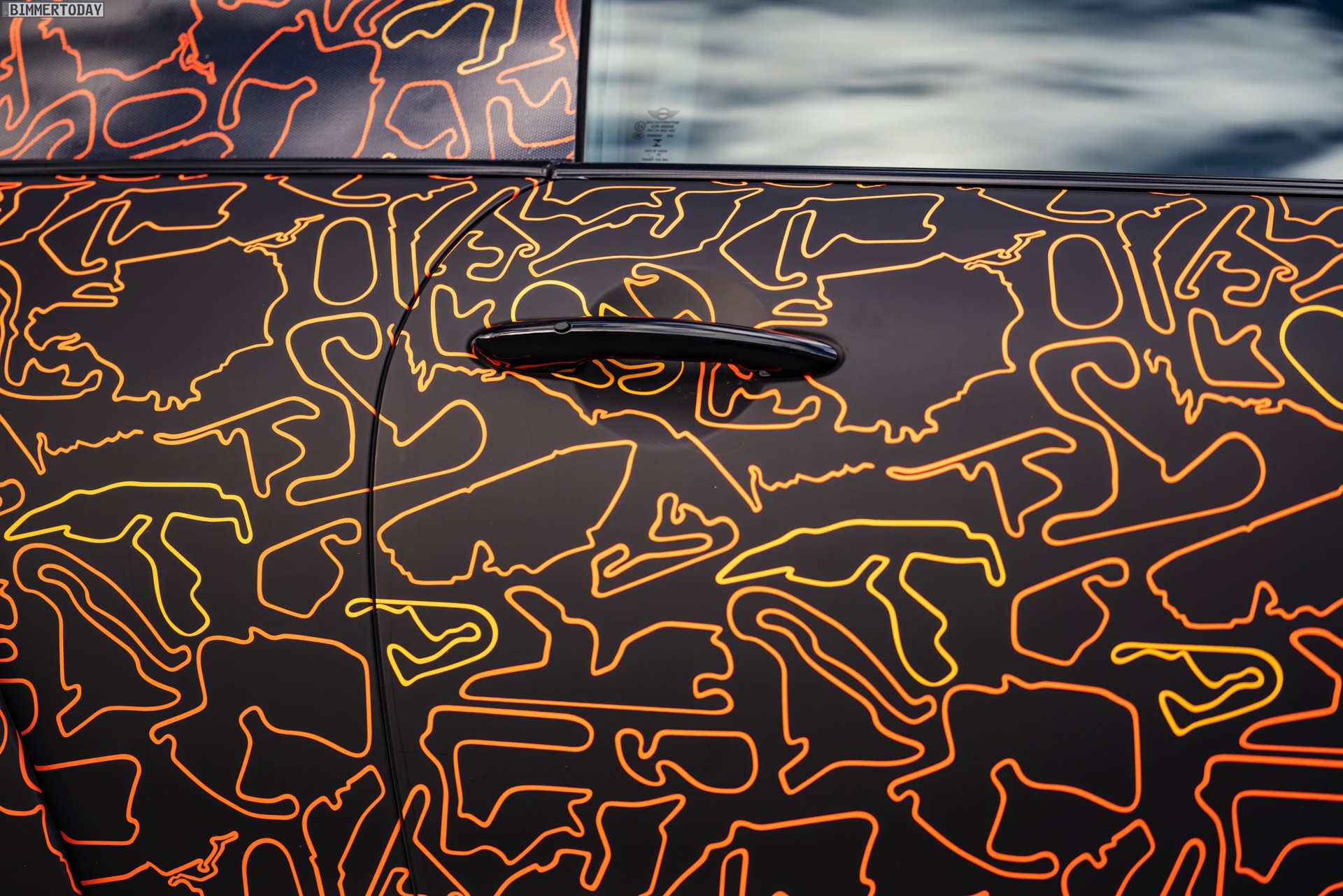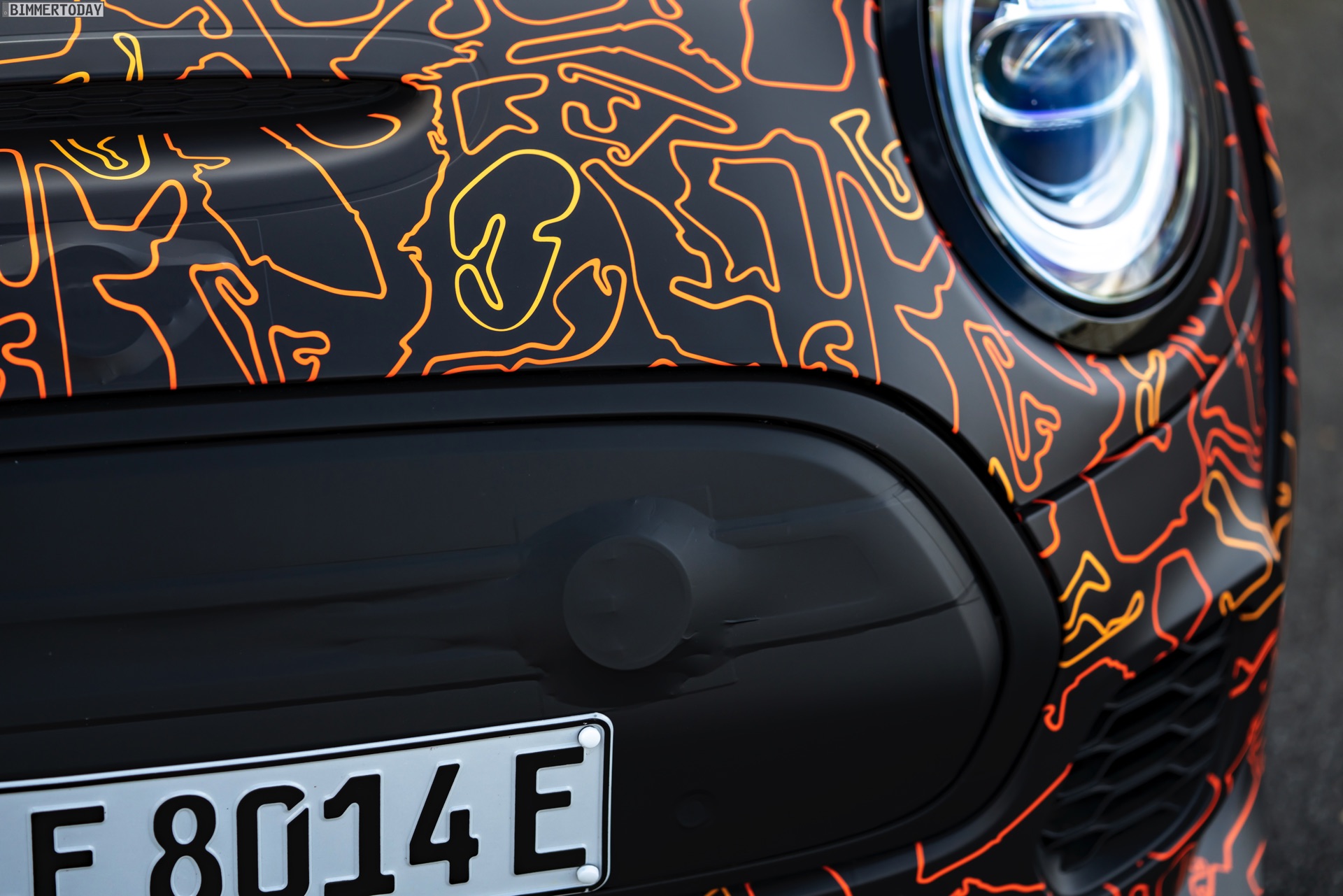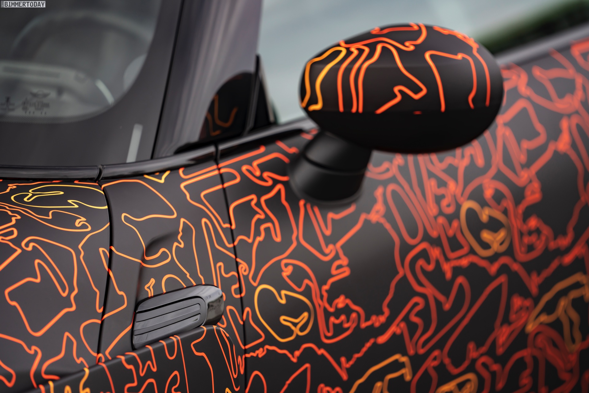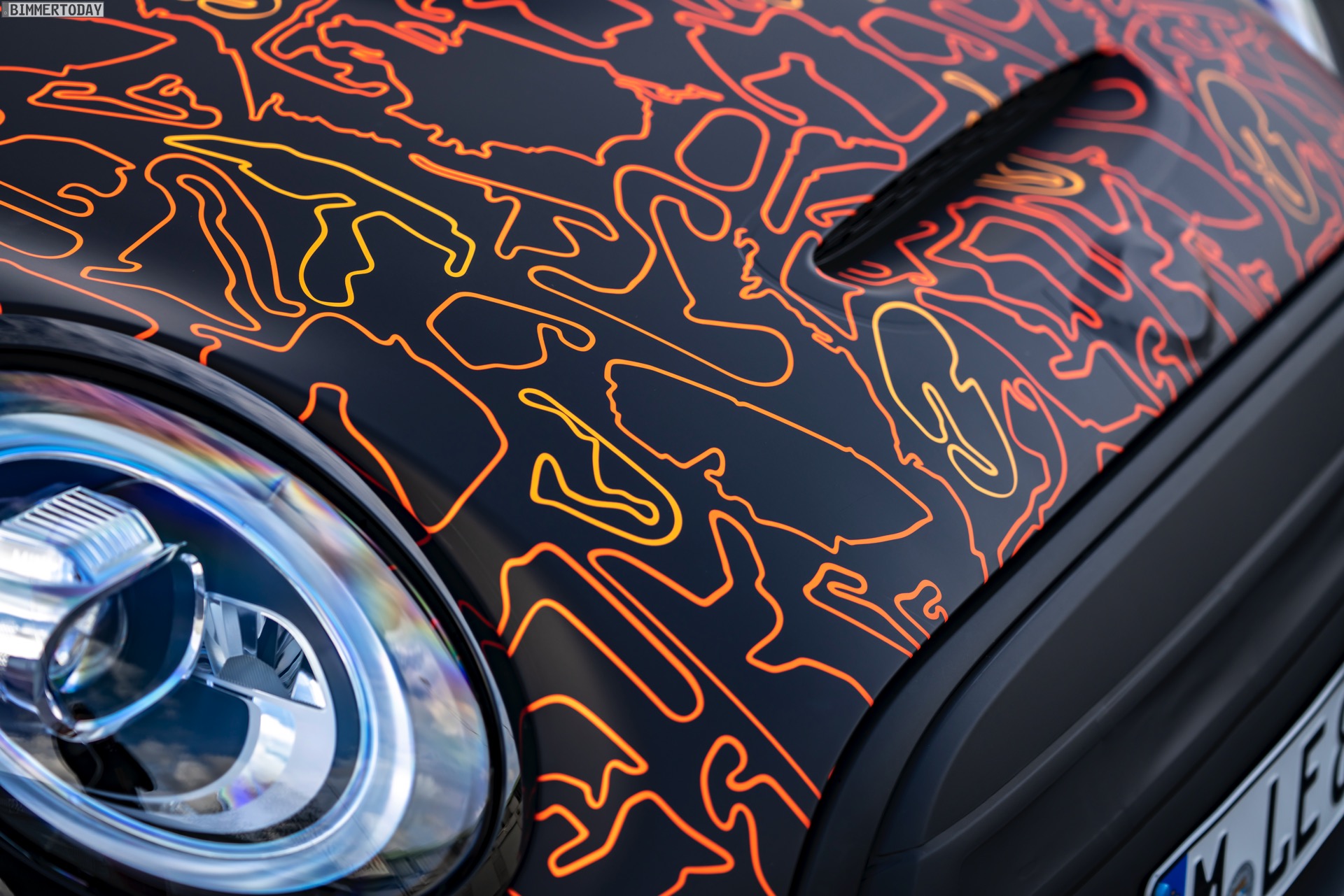 Wie schon bei den Prototypen zum JCW GP zitiert die Tarnfolie auch im Fall des Elektro-Sportlers die Umrisse bekannter Rennstrecken und macht damit klar, wo sich das Serienfahrzeug besonders heimisch fühlen soll. Dieses und viele weitere Details zeigen die statischen Fotos vom Elektro-Erlkönig: