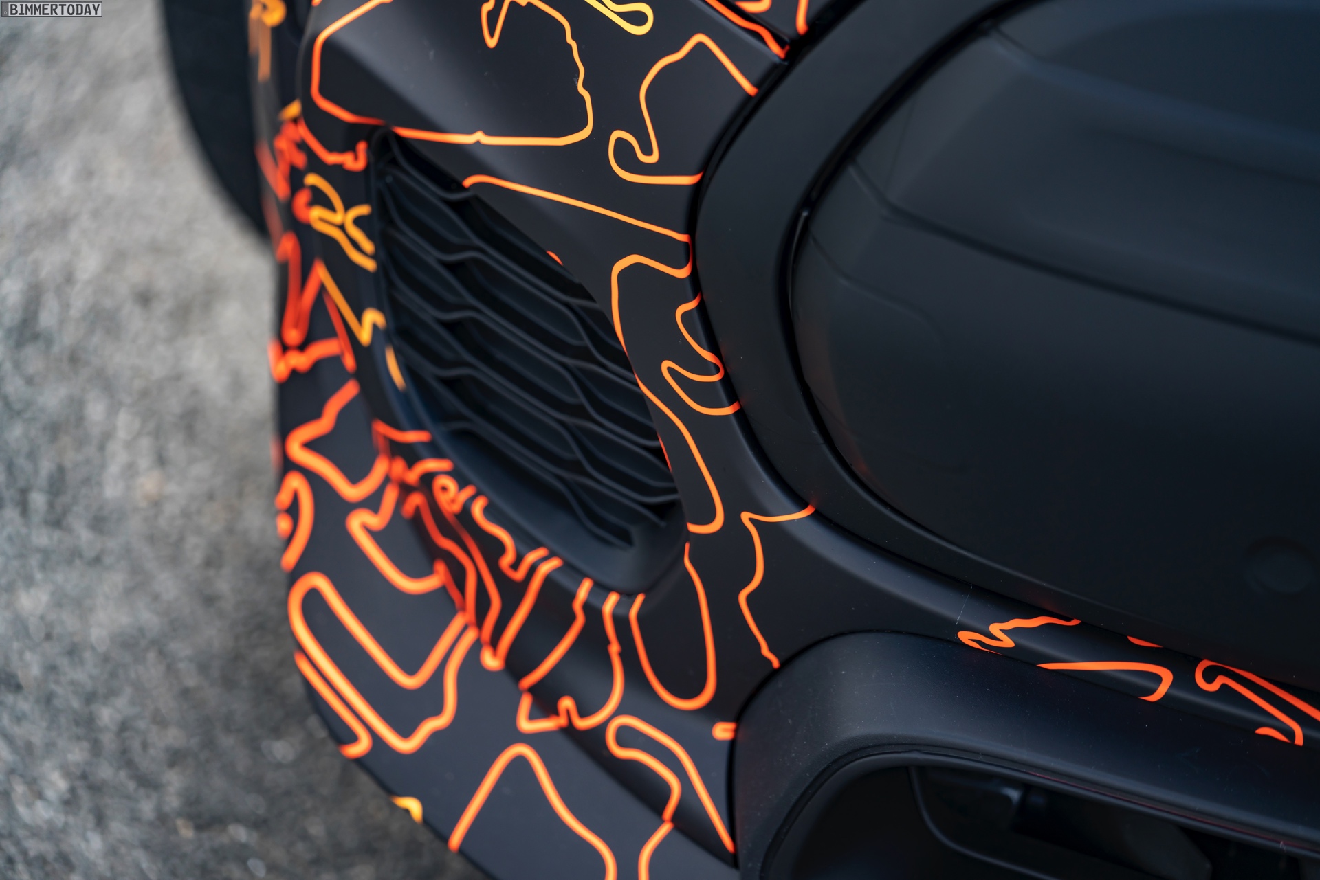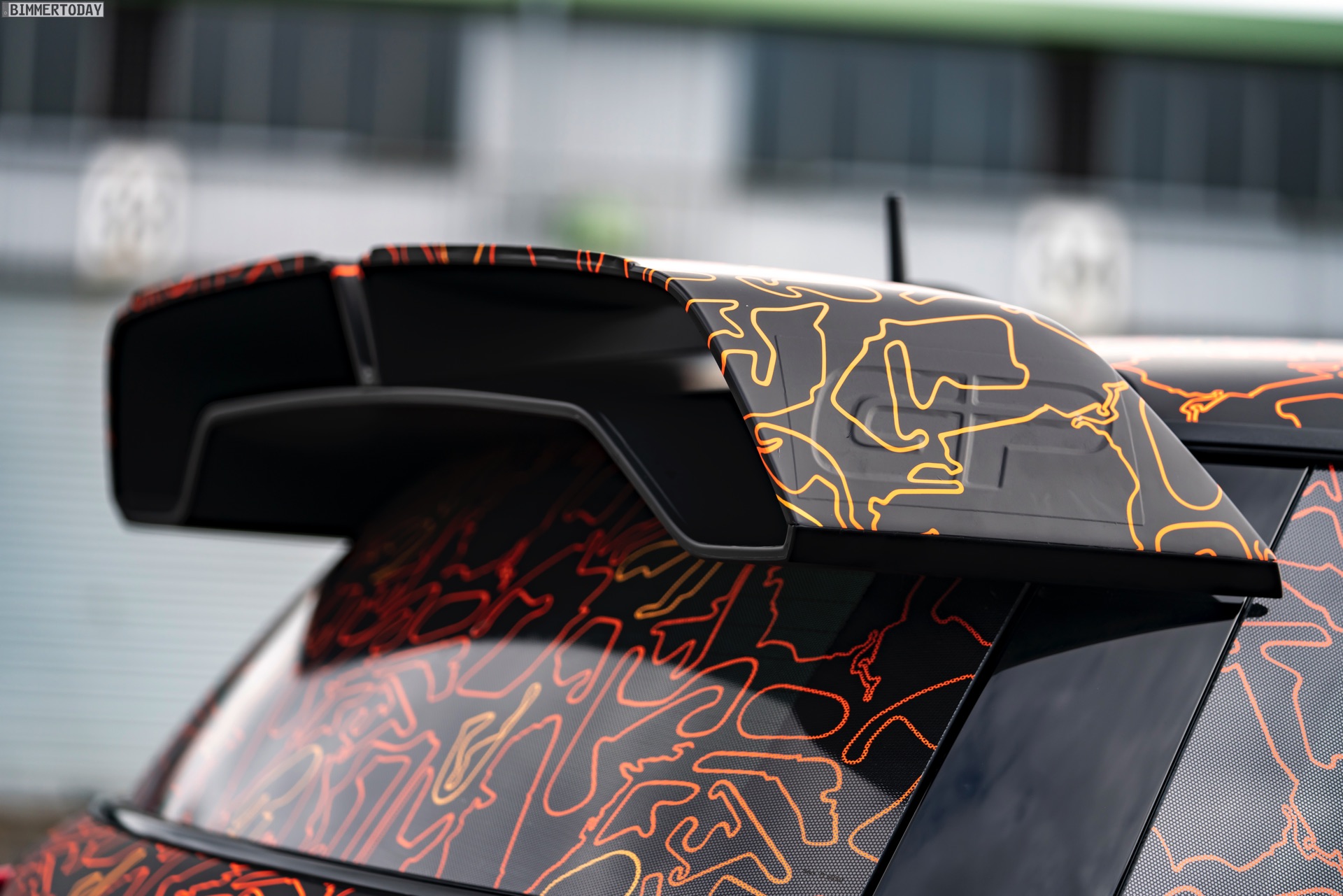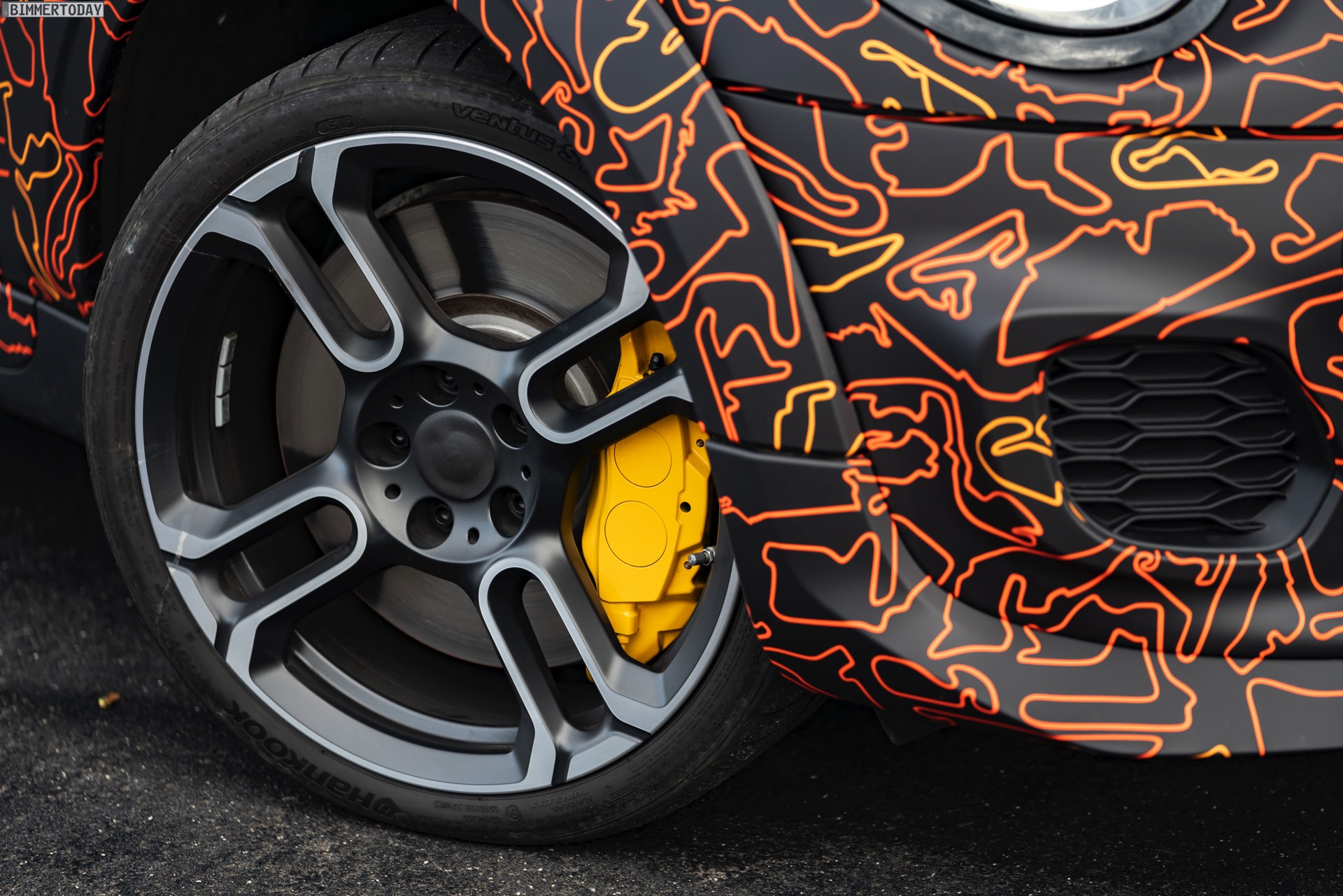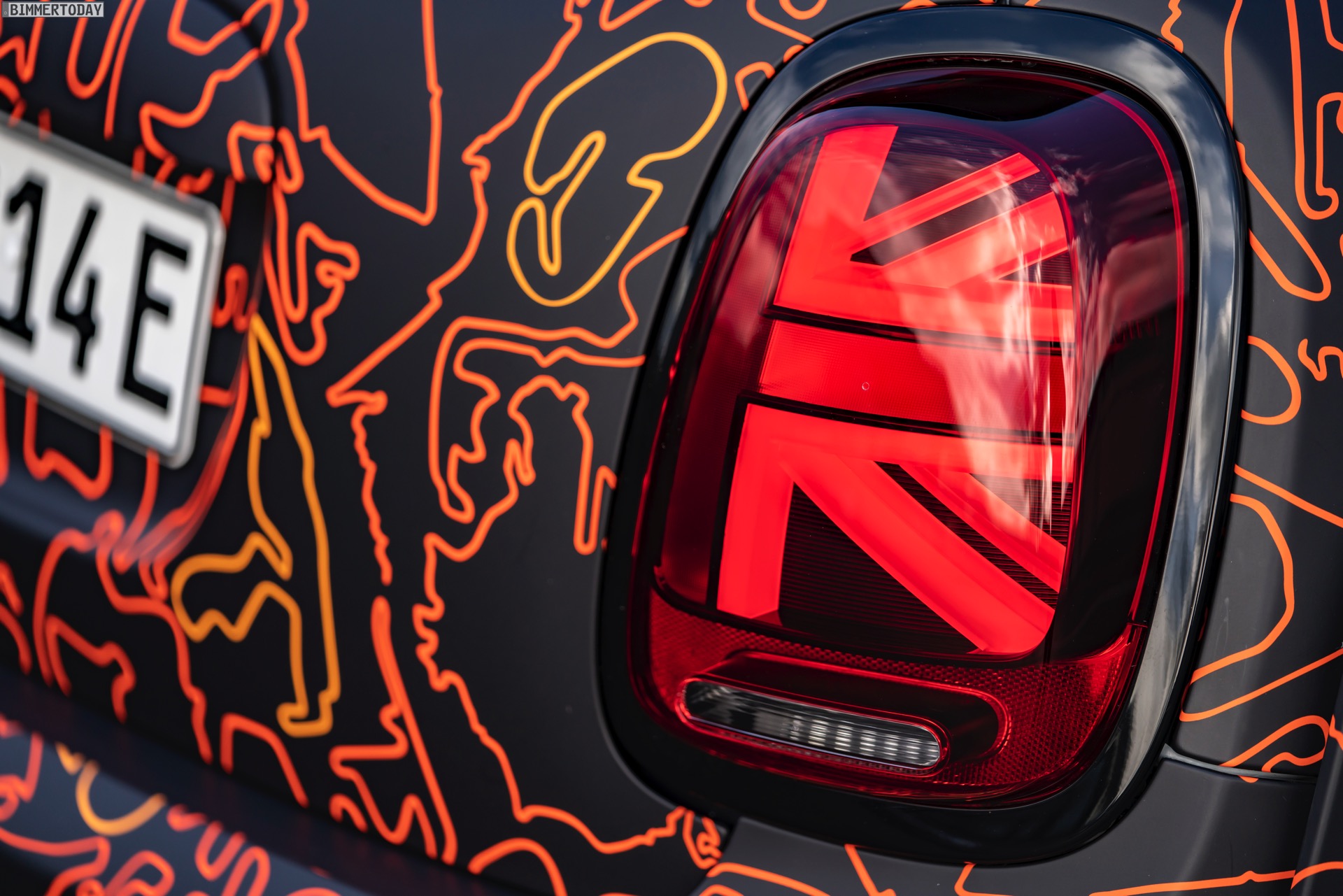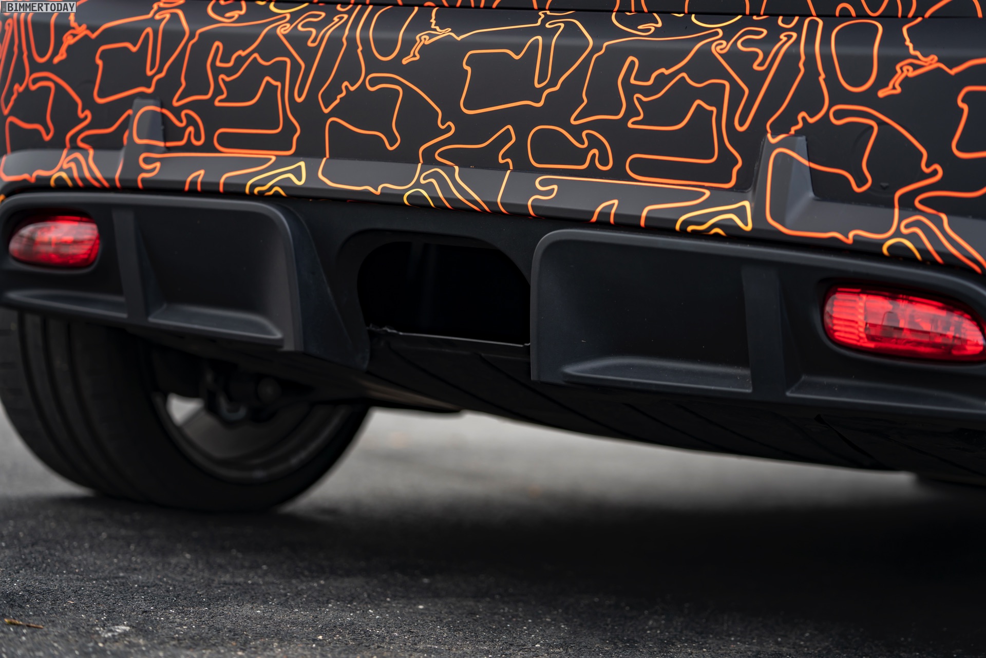 Wie schon bei den Prototypen zum JCW GP zitiert die Tarnfolie auch im Fall des Elektro-Sportlers die Umrisse bekannter Rennstrecken und macht damit klar, wo sich das Serienfahrzeug besonders heimisch fühlen soll. Dieses und viele weitere Details zeigen die statischen Fotos vom Elektro-Erlkönig: